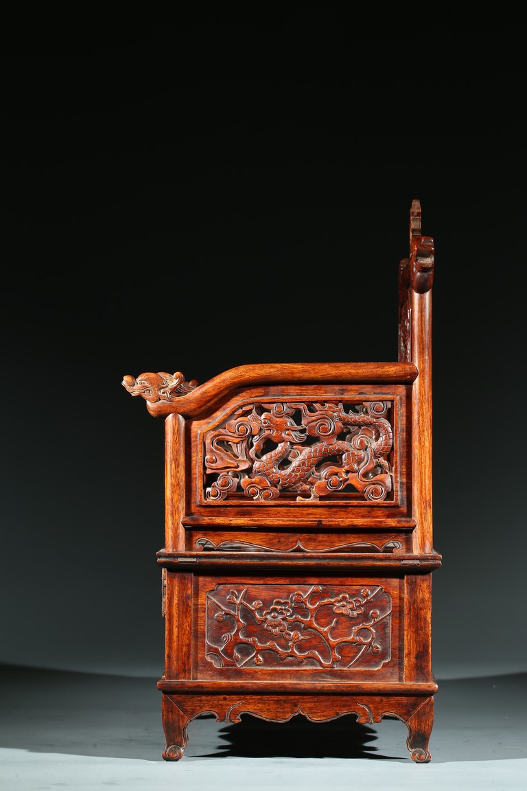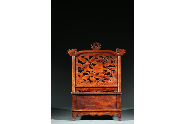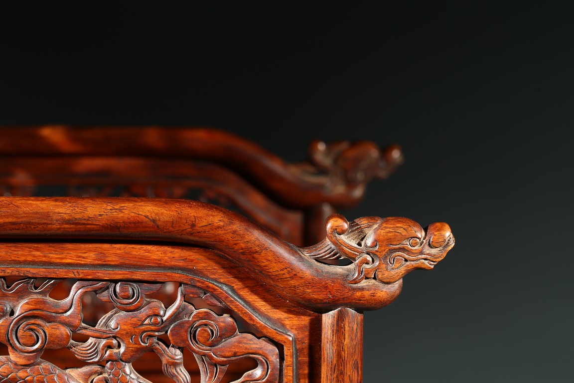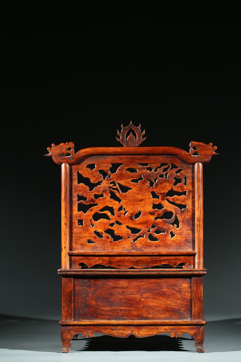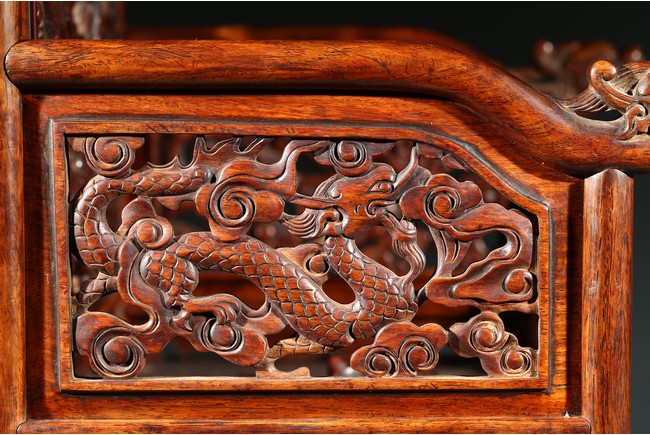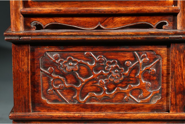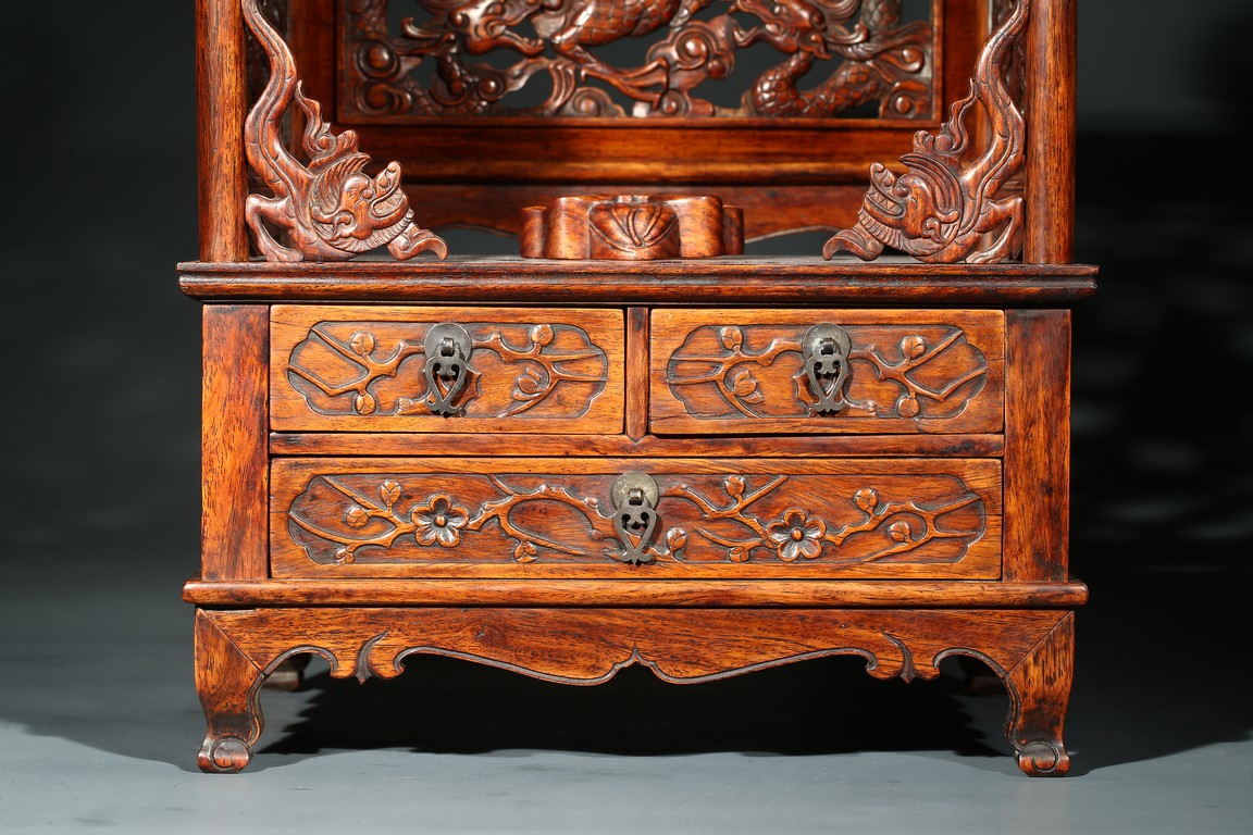 The mirror stand top with a central panel enclosing writhing dragon amid scrolling clouds, above the rectangular stand set with three drawers carved with plum blossoms, all raised on four cabriole legs.