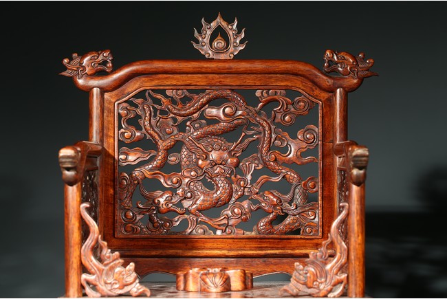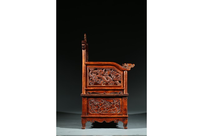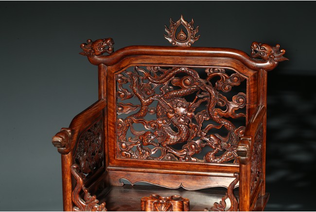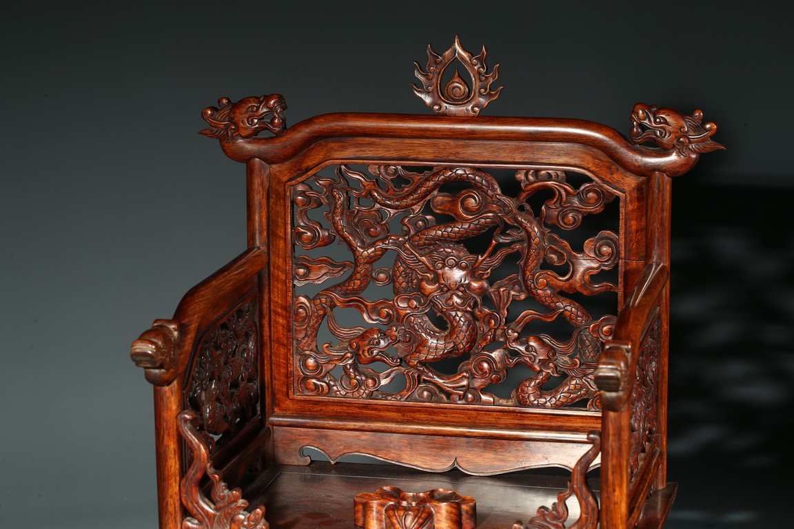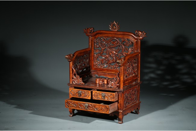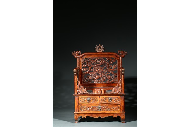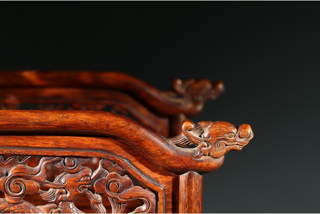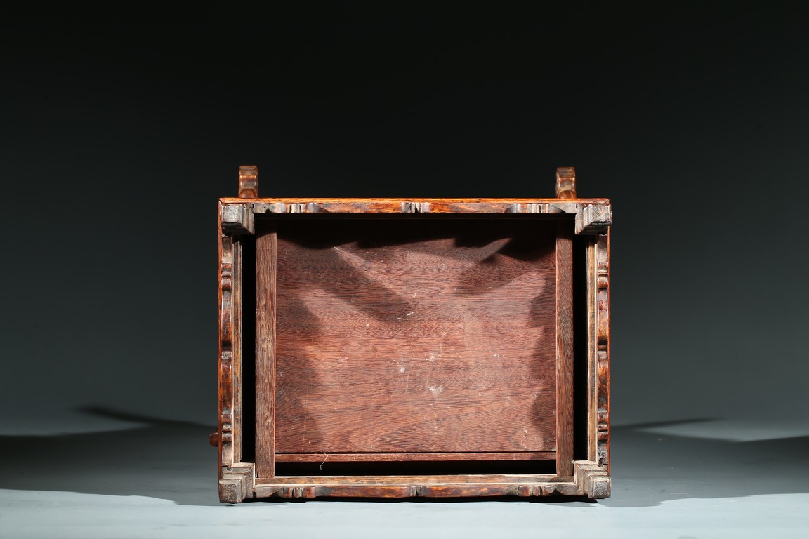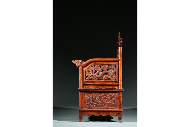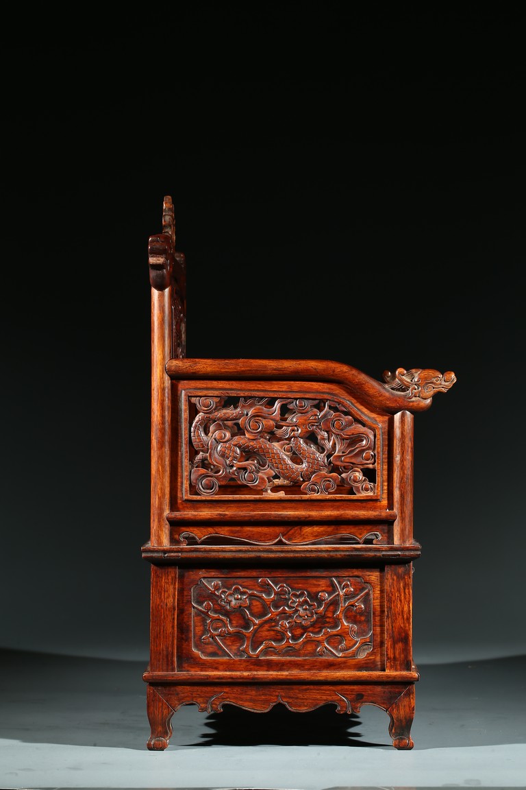 The mirror stand top with a central panel enclosing writhing dragon amid scrolling clouds, above the rectangular stand set with three drawers carved with plum blossoms, all raised on four cabriole legs.