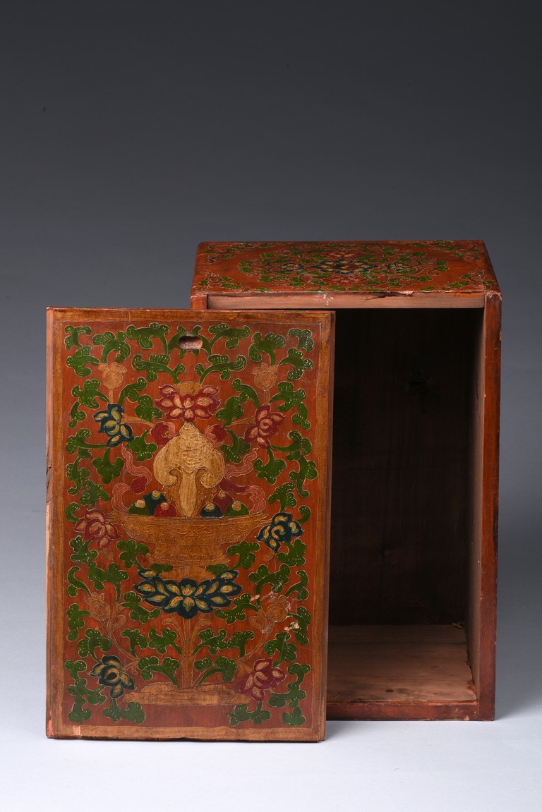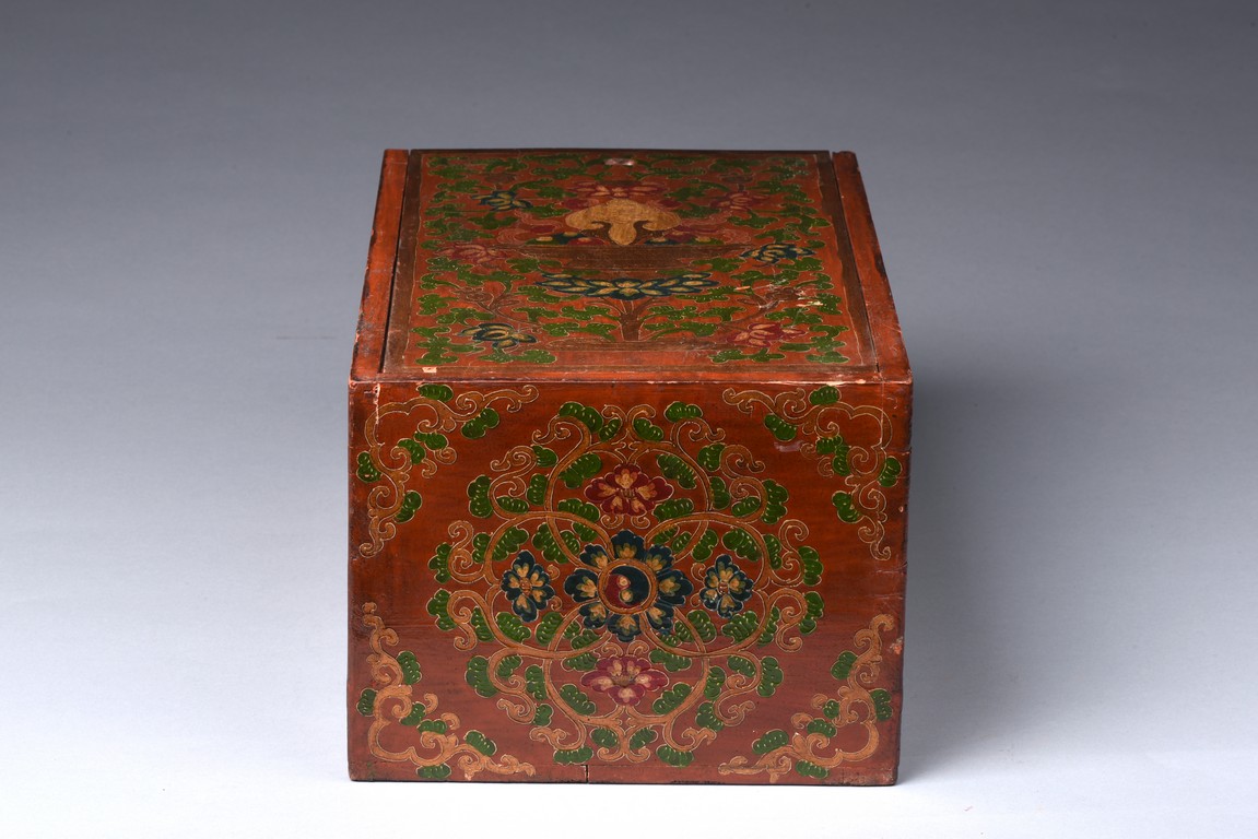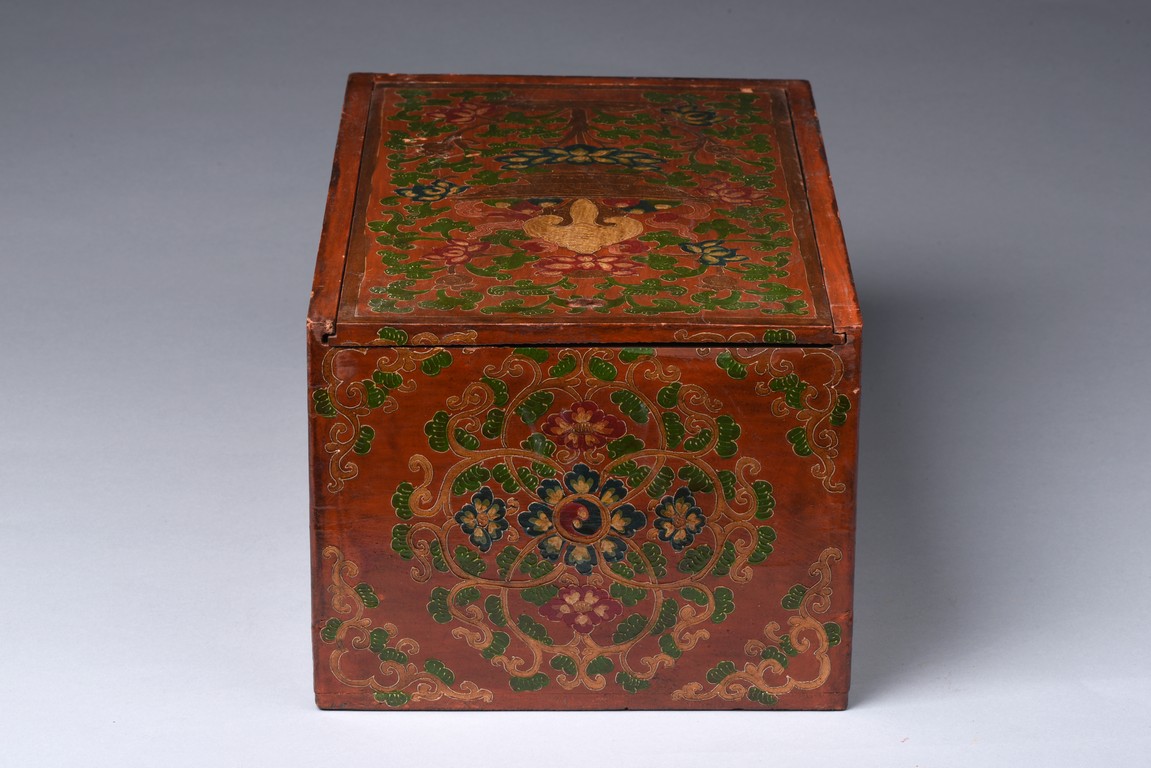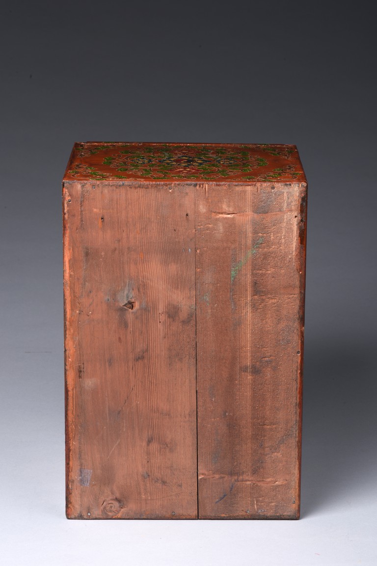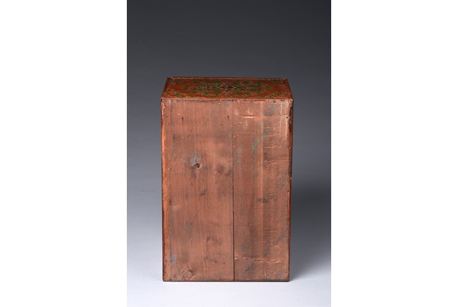 Qing Dynasty period. Of rectangular form, the exterior on each side decorated with stylized flowers in red, blue, yellow, and green pigments.