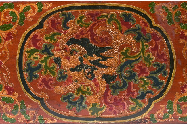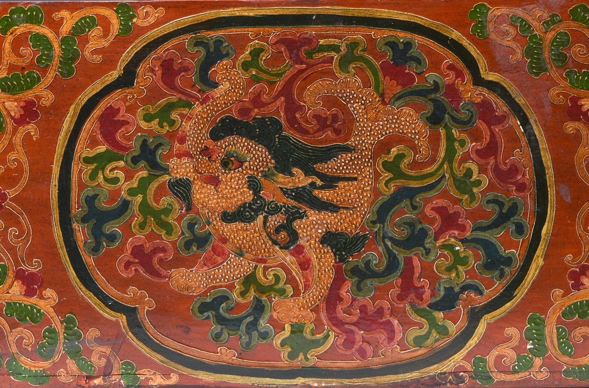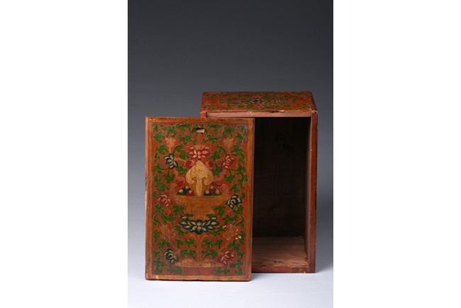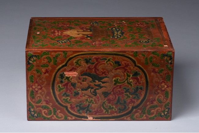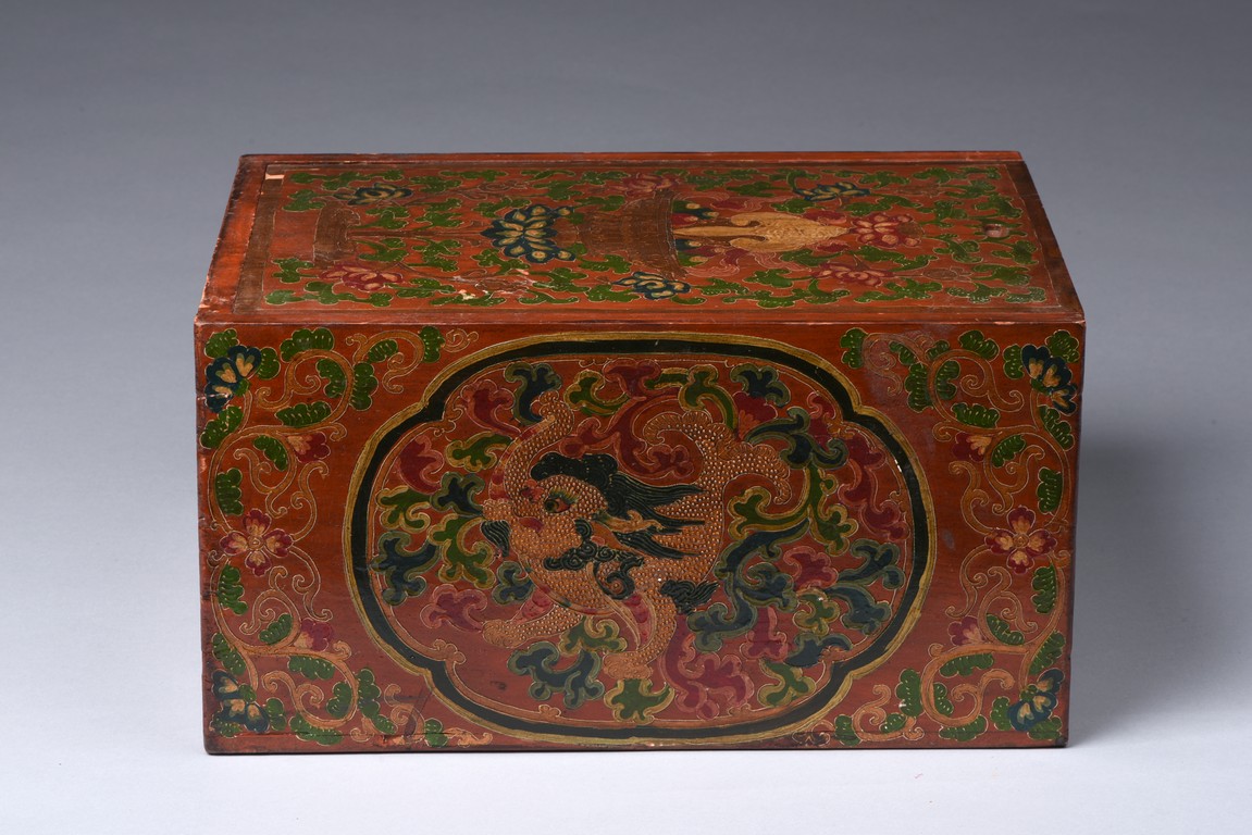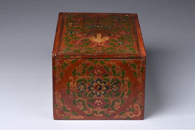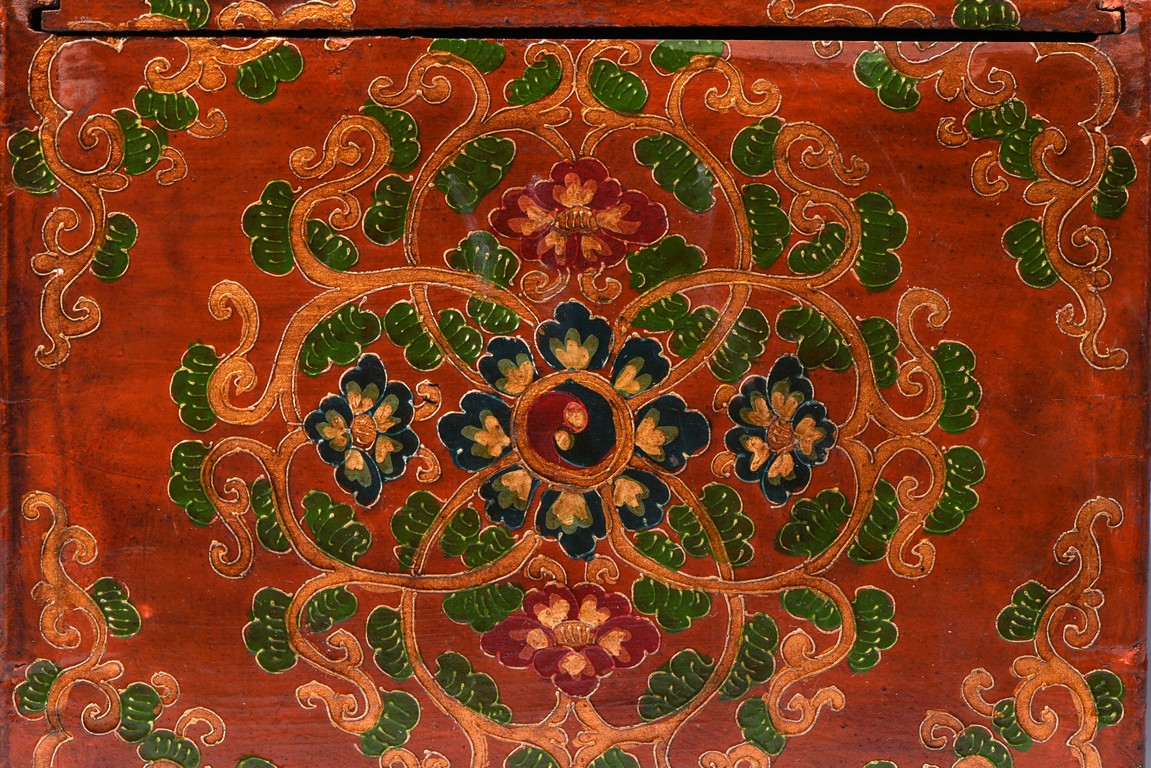Qing Dynasty period. Of rectangular form, the exterior on each side decorated with stylized flowers in red, blue, yellow, and green pigments.