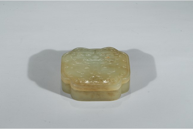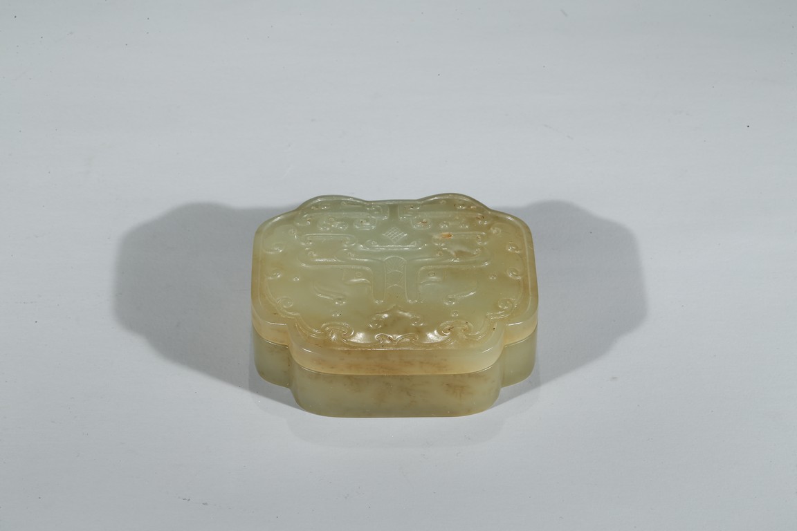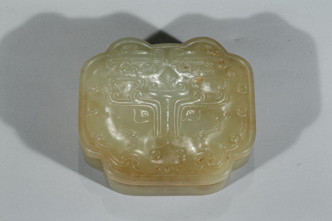 The box well carved in low relief on the top cover with stylized mythical taotie mask. Qing Dynasty period.