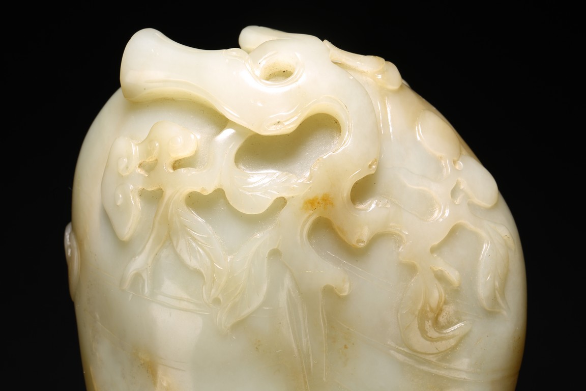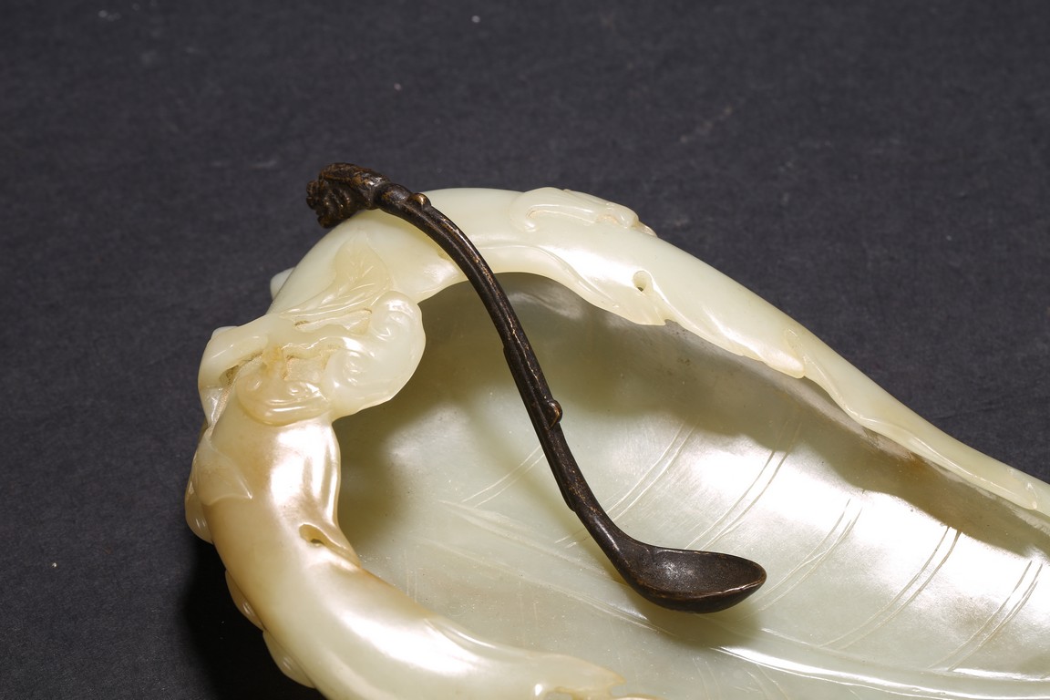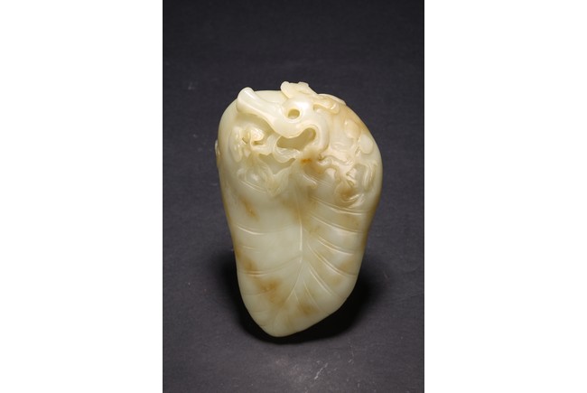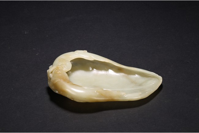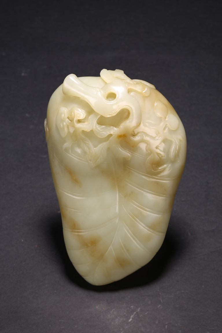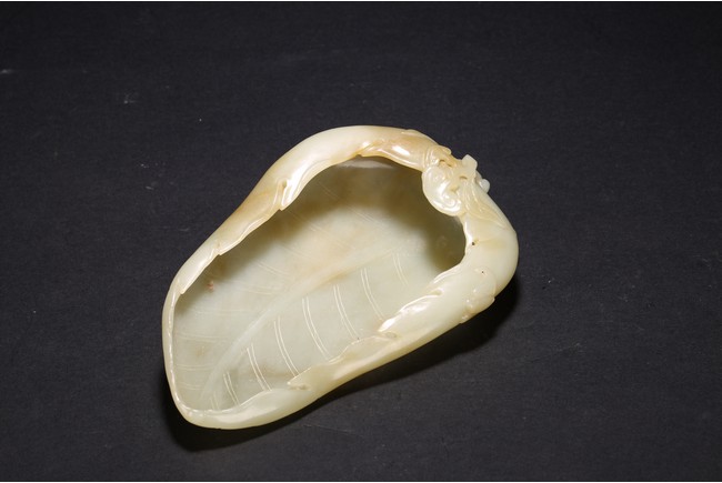 Qing Dynasty period. Of leaf shape, the washer carved on one end with lingzhi heads borne on gnarled branches extending from the base.