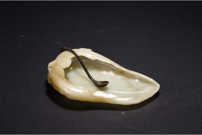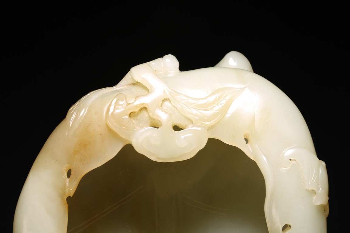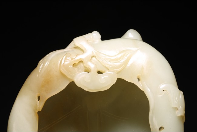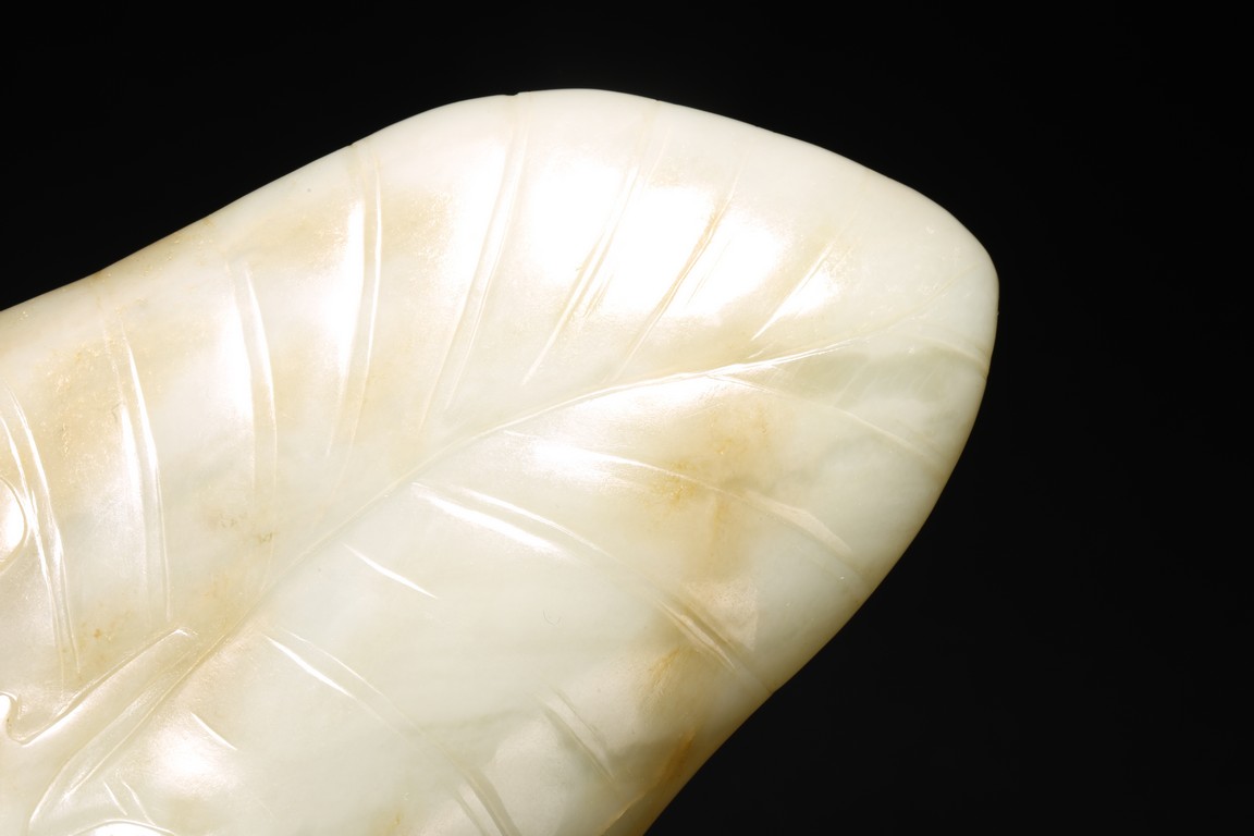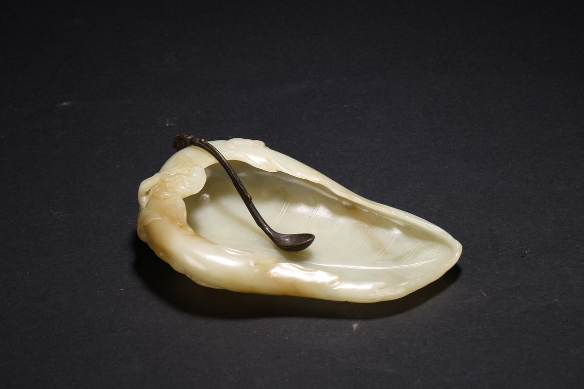 Qing Dynasty period. Of leaf shape, the washer carved on one end with lingzhi heads borne on gnarled branches extending from the base.