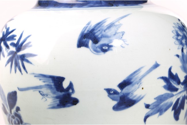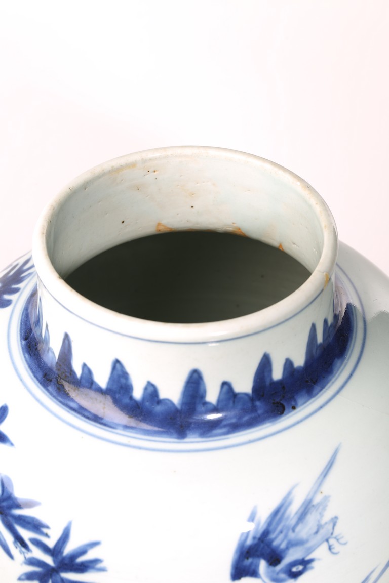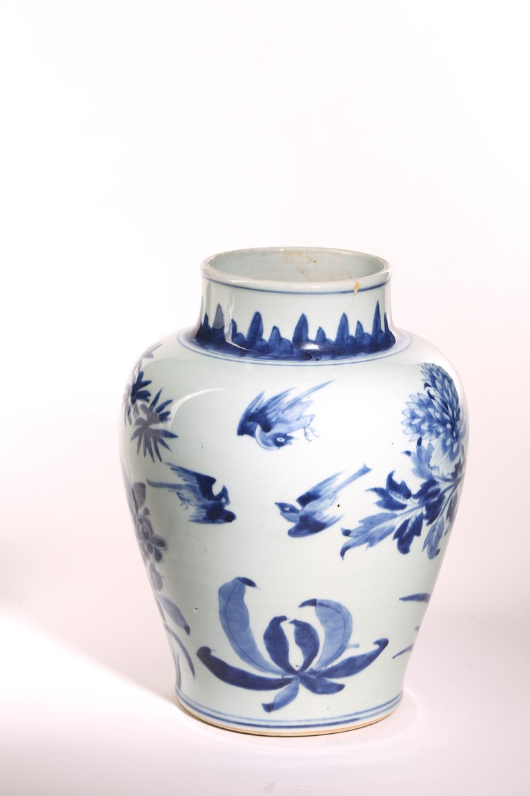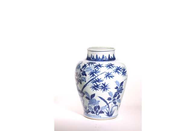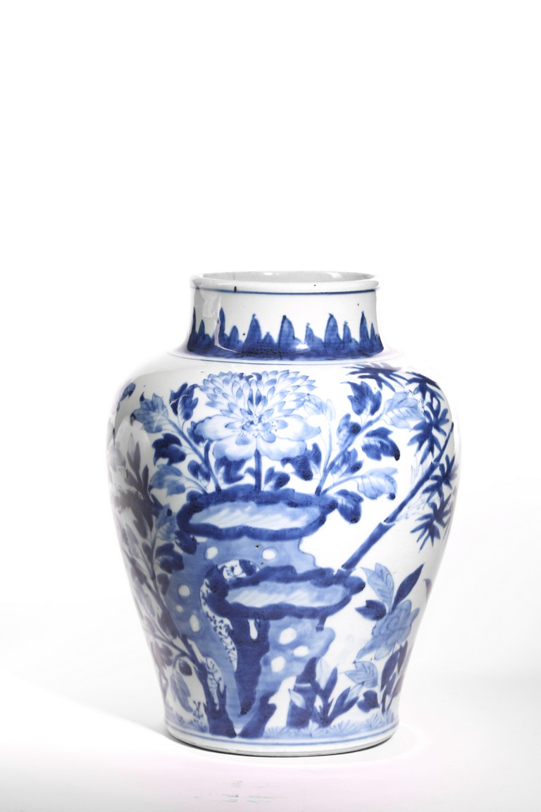Qing Dynasty Kangxi period. Of baluster form, the exterior boldly painted with various flowers issuing behind porous rockwork, including chrysanthemum, peonies, and bamboos next to three flying birds, base unglazed.