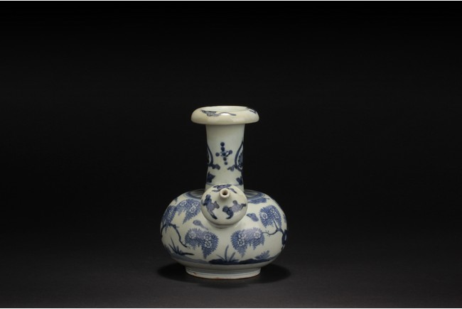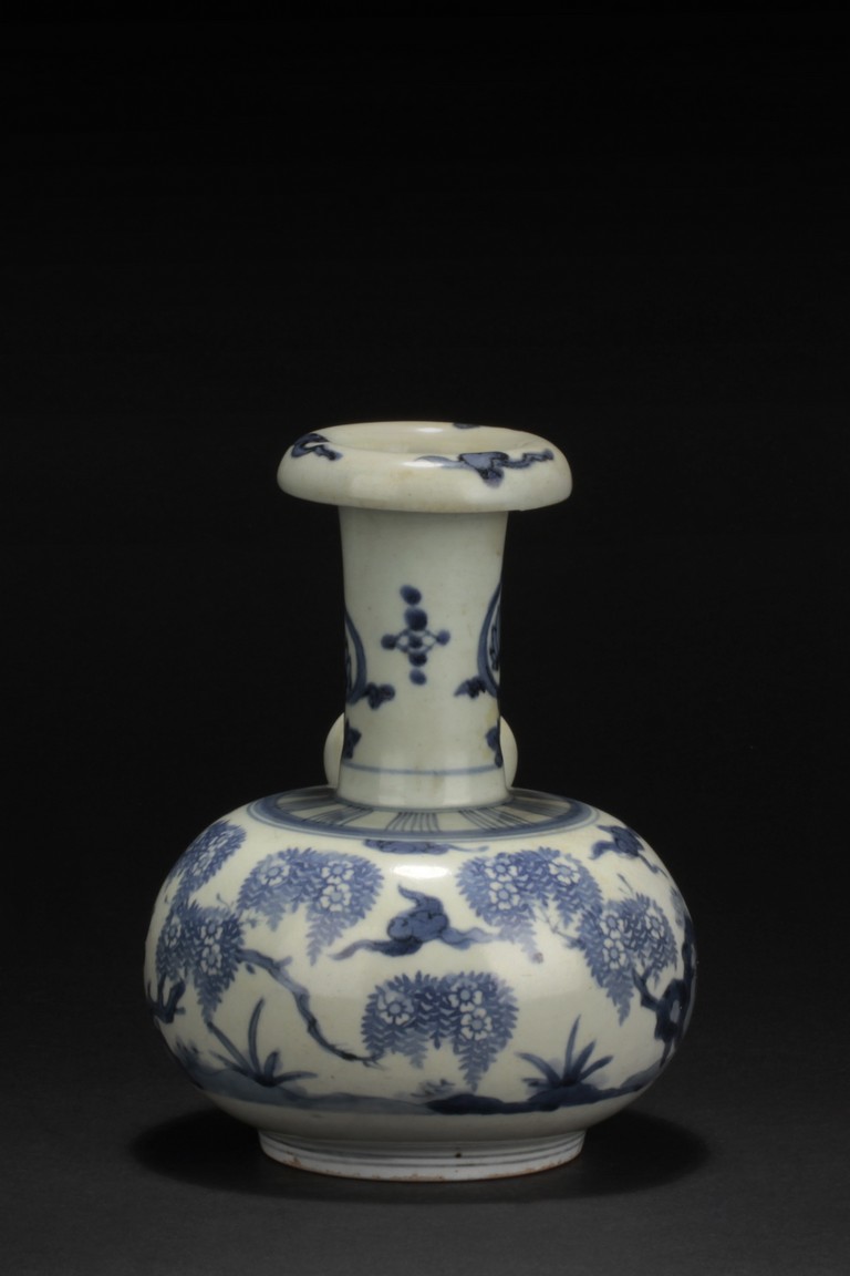 Qing Dynasty period. Of globular form with long straight neck and everted rim, the body painted with blossoming flowers, clouds, and viewing stones, the gourd form mouth and rim painted with cloud patterns, and the neck with similar themed flower patterns. Includes Hong Kong Art Craft Merchants Association Certificate of Antiquity No. B 197-1, dated May 1st, 1971, stating the vase is over 100 years old.