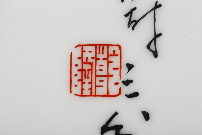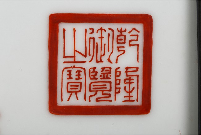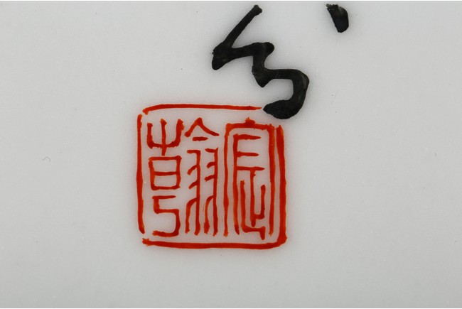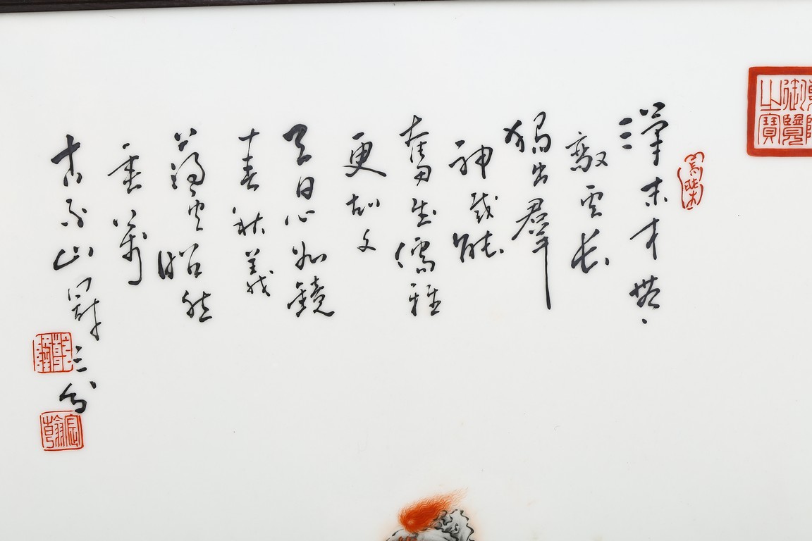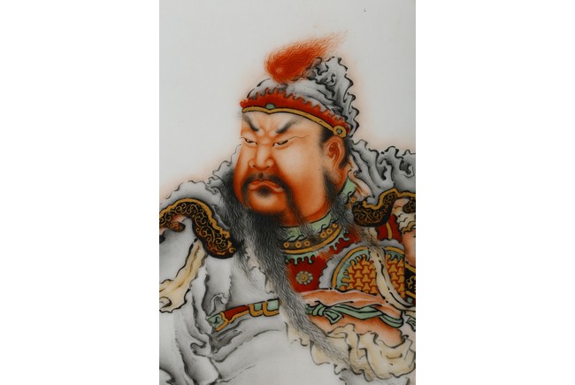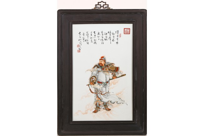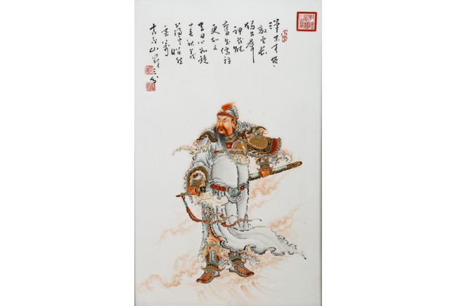 The rectangular panel finely painted to depict the legendary general Guan Gong holding a long sword and wearing armor, the upper side with inscription and four seal marks. Republic period.