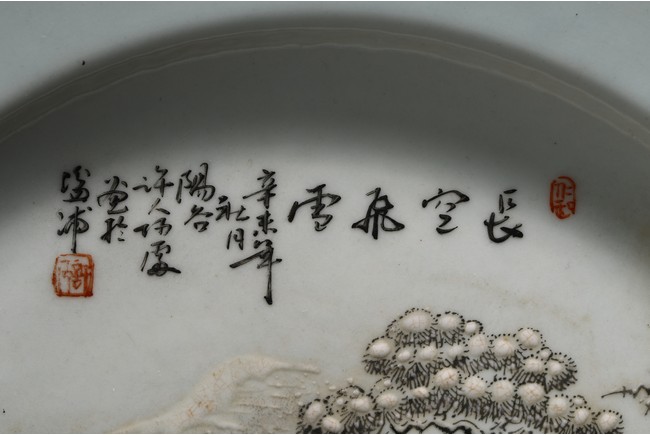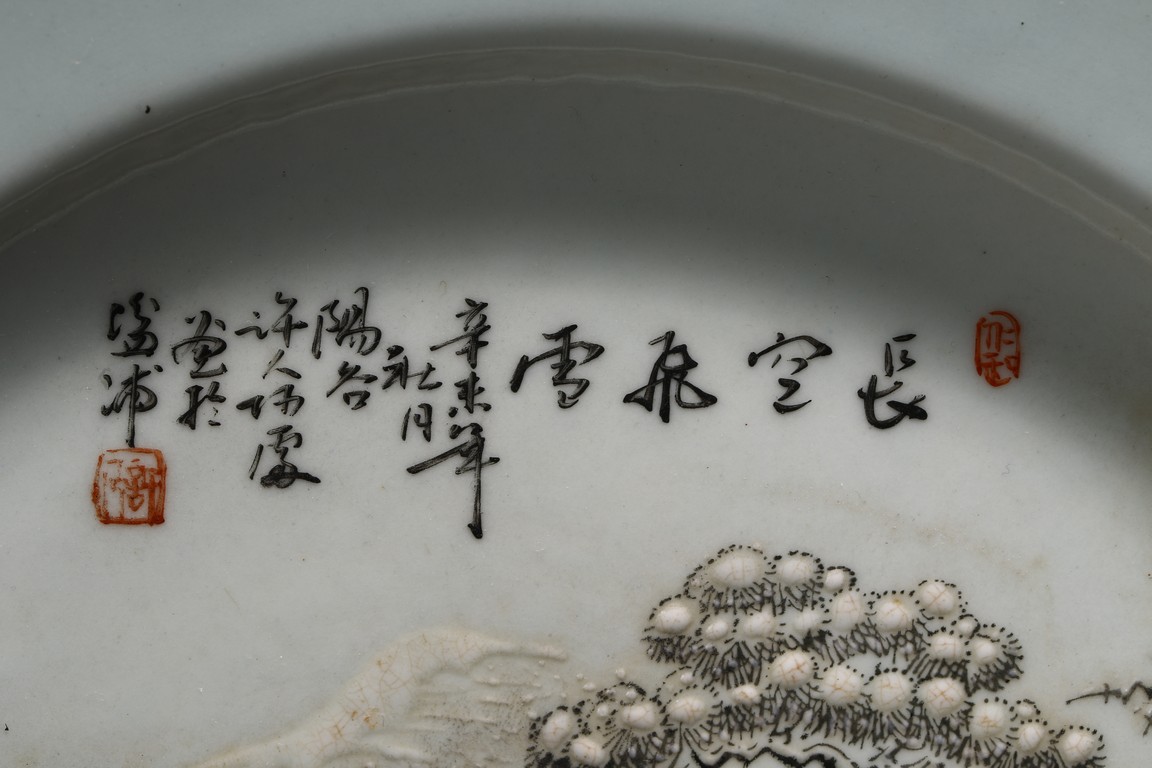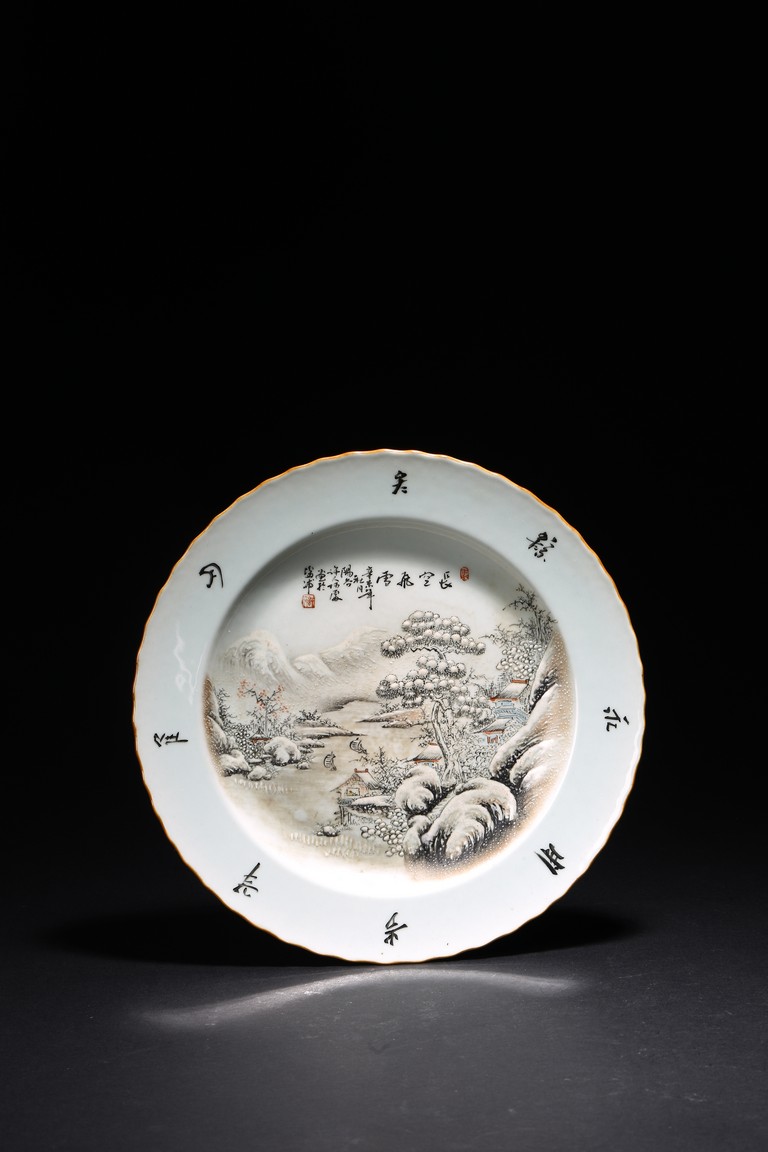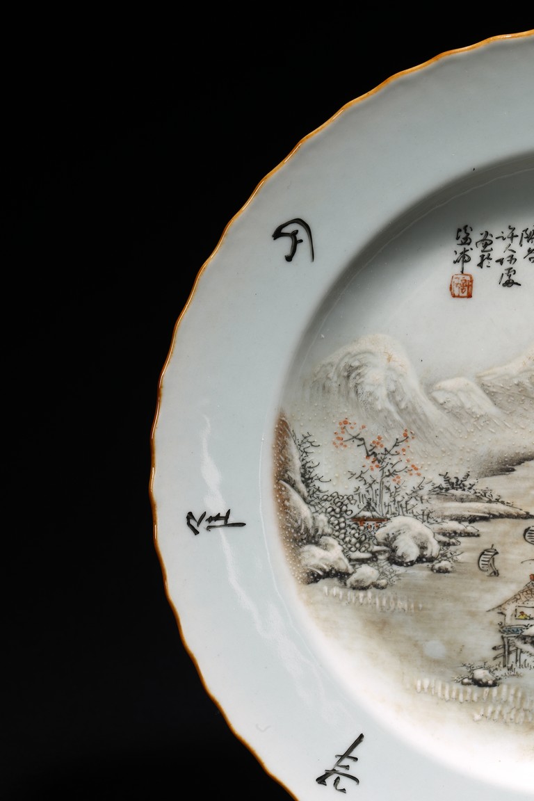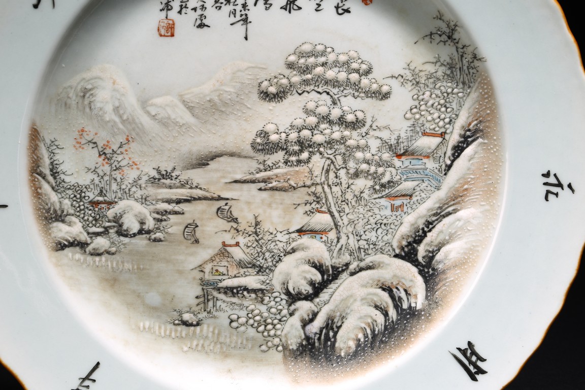 First Half 20th century. Of circular form with ribbed rim, the interior is finely painted with a winter riverscape scene depicting two boats sailing through river with snow covered village and pines on river banks, the upper with an inscription and signed Xu Ren with two seal marks, the rim inscribed with characters.