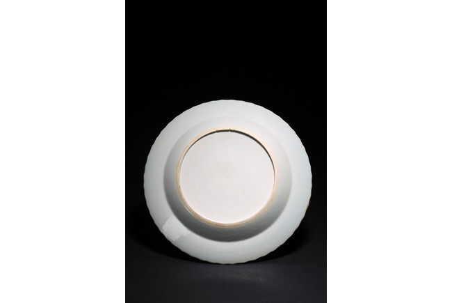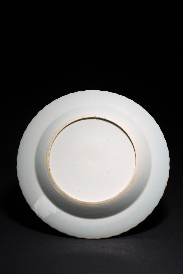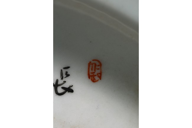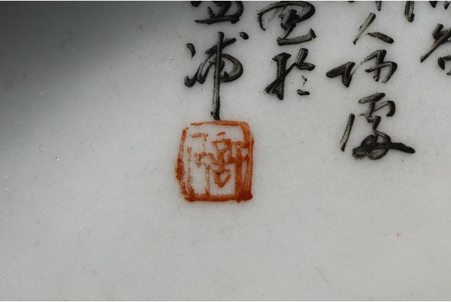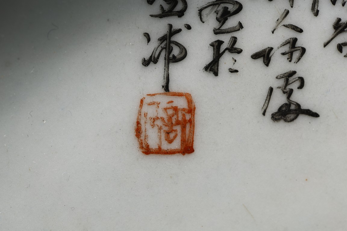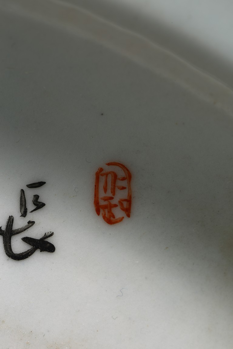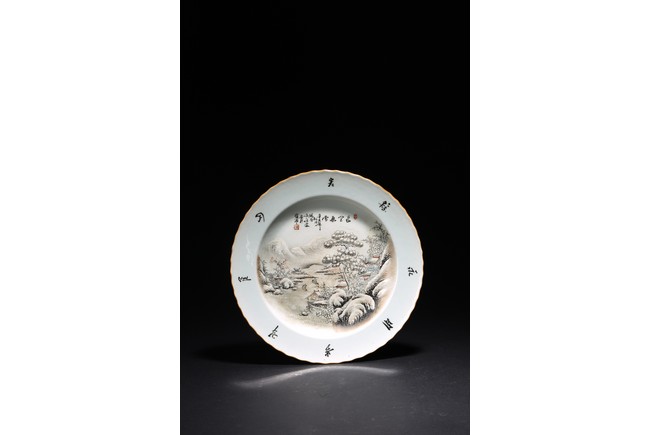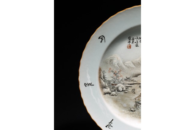 First Half 20th century. Of circular form with ribbed rim, the interior is finely painted with a winter riverscape scene depicting two boats sailing through river with snow covered village and pines on river banks, the upper with an inscription and signed Xu Ren with two seal marks, the rim inscribed with characters.