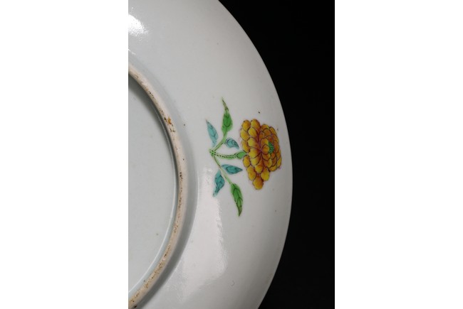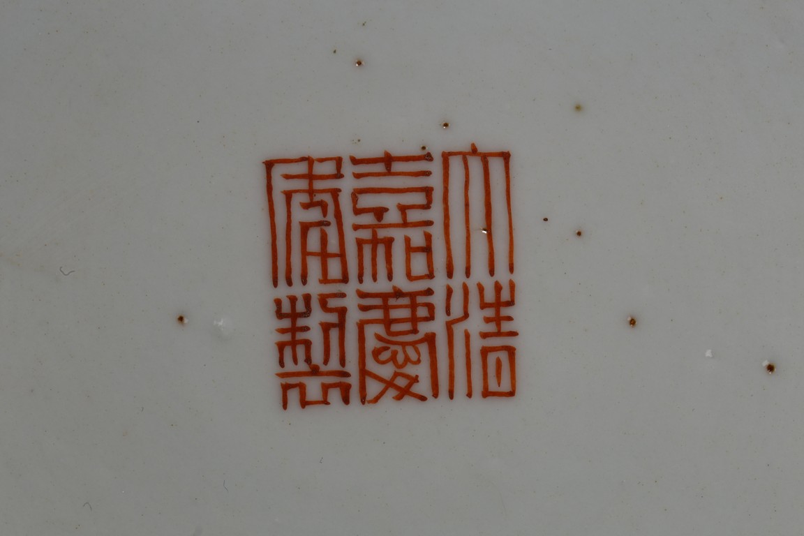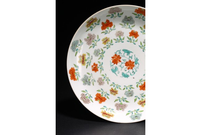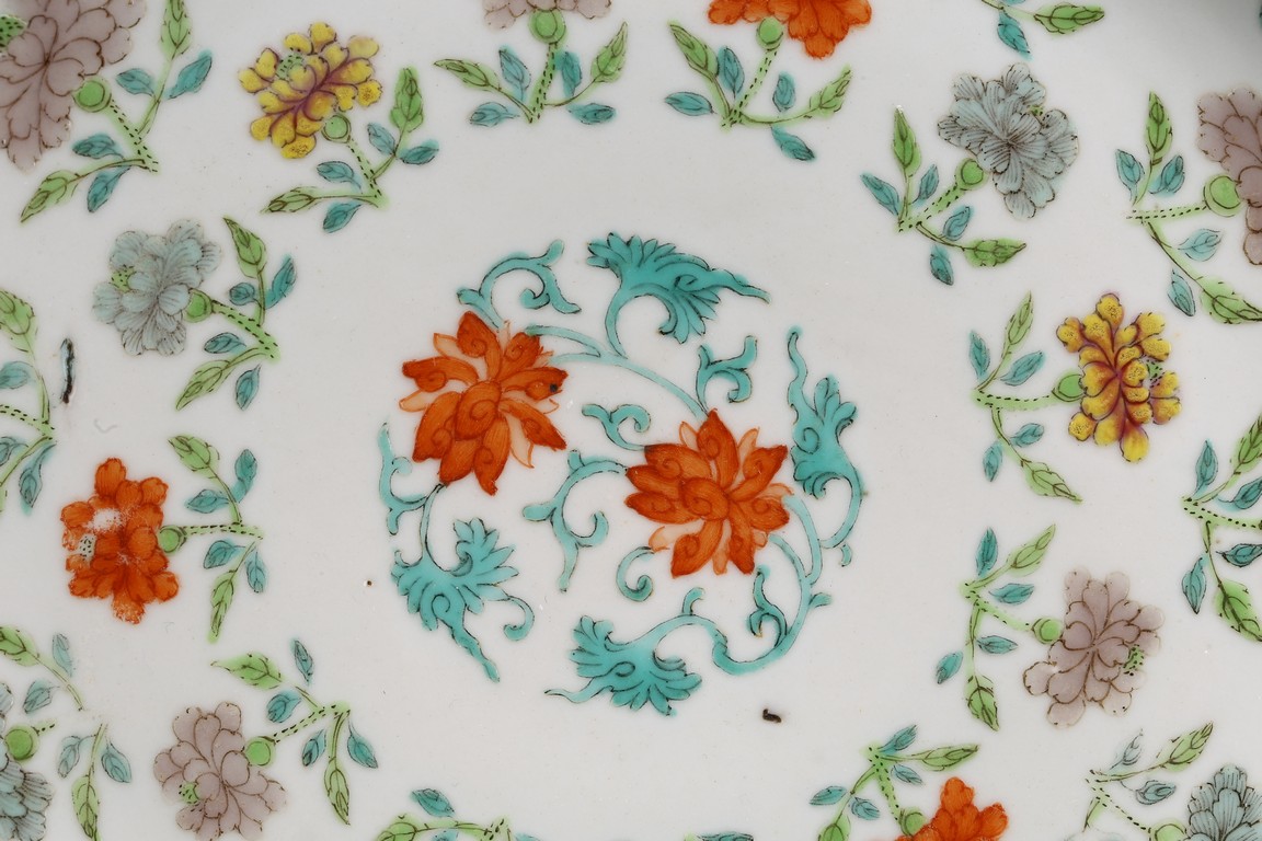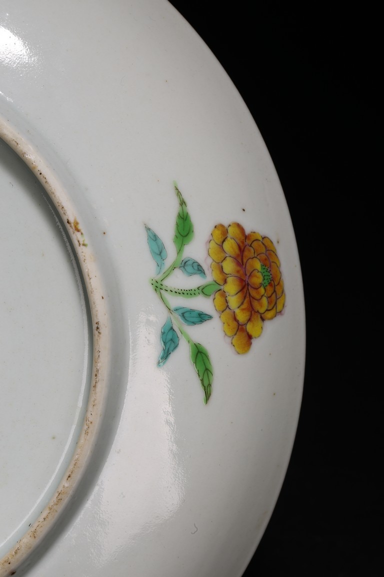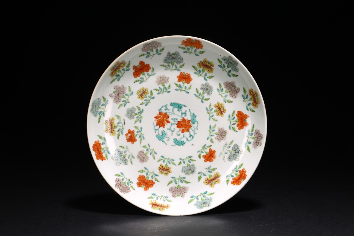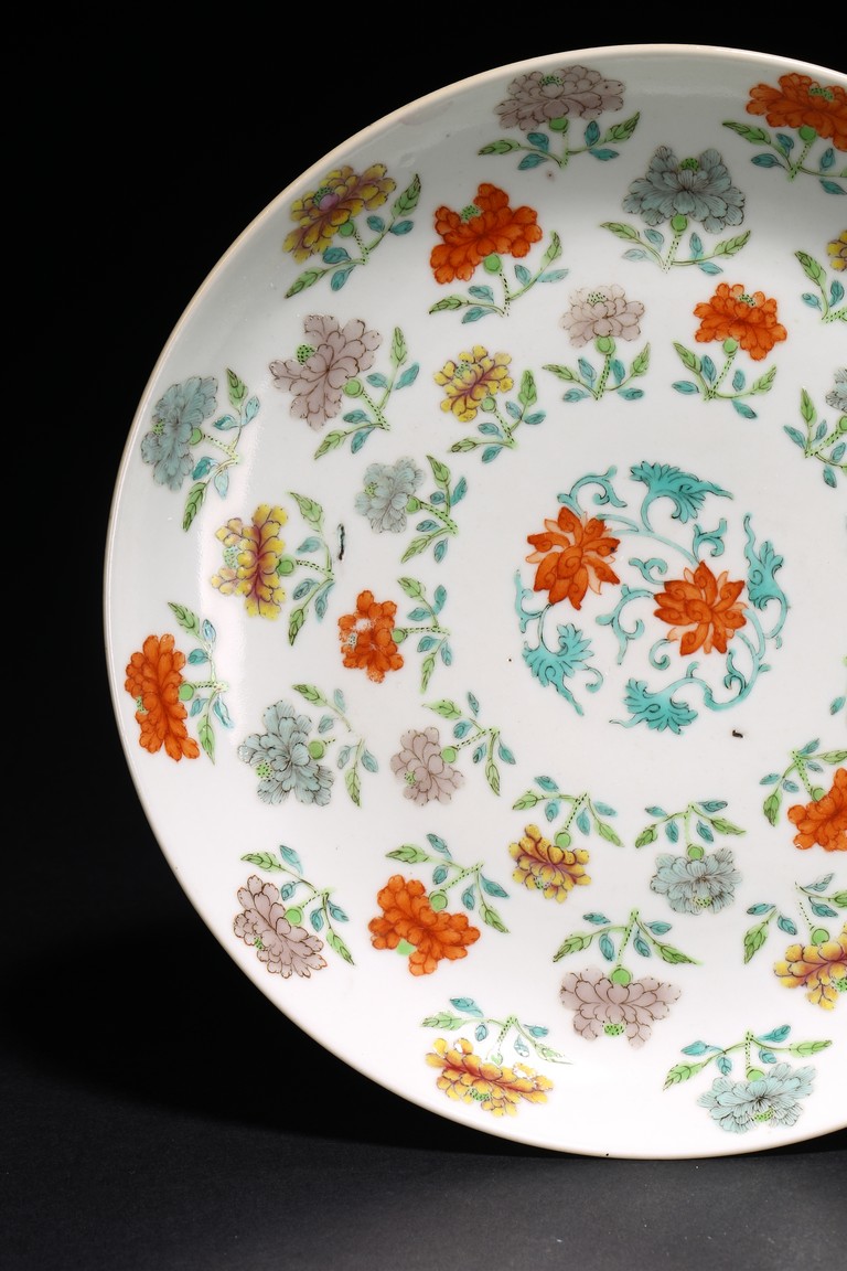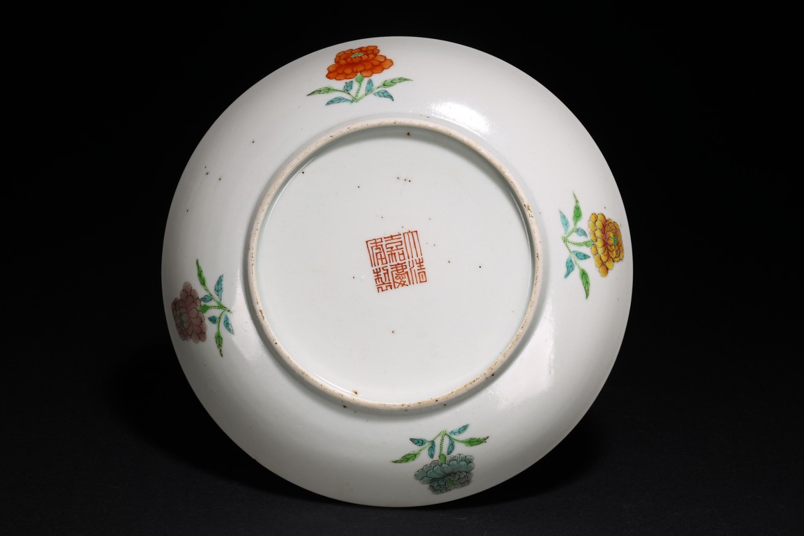 Qing Dynasty period. The dish finely painted to the interior with lotus medallion surrounded by sprigs of flowers in various tones in radiating arrangement, the exterior painted with four chrysanthemum flowers, the base inscribed with six character Jiaqing mark.