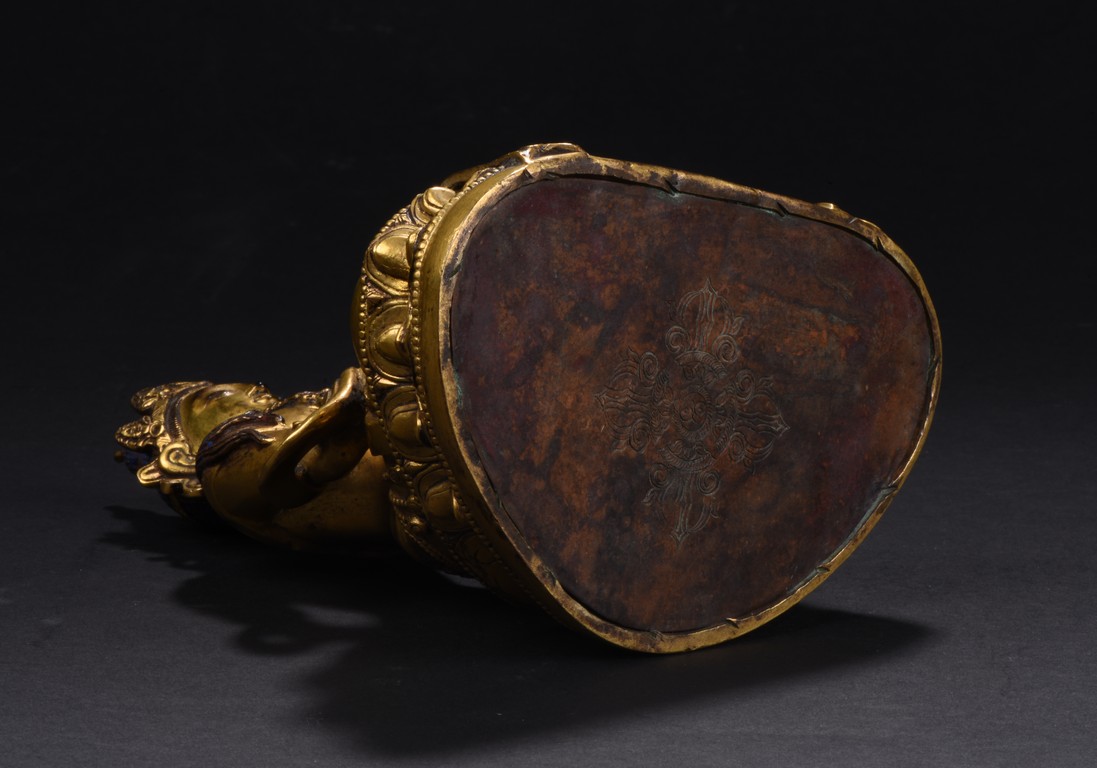 Seated in dhyanasana on an double-lotus base, the hems of his voluminous dhoti incised with an foliate motif adorned with an flowing sash over both arms, an elaborate beaded belt and various necklaces, the face with downcast eyes flanked by lotus earrings and flowing ribbons surmounted by an jeweled tiara, the hair pulled into an high chignon, the base sealed with an double-vajra. Qing Dynasty period.