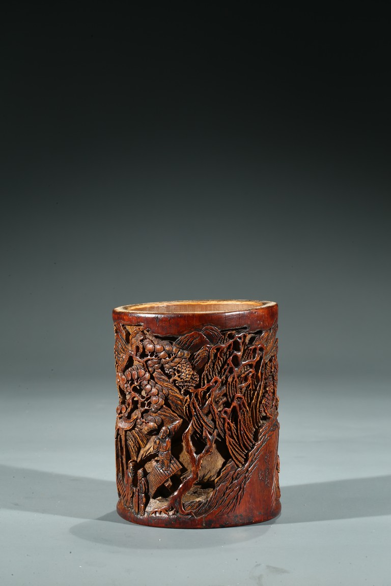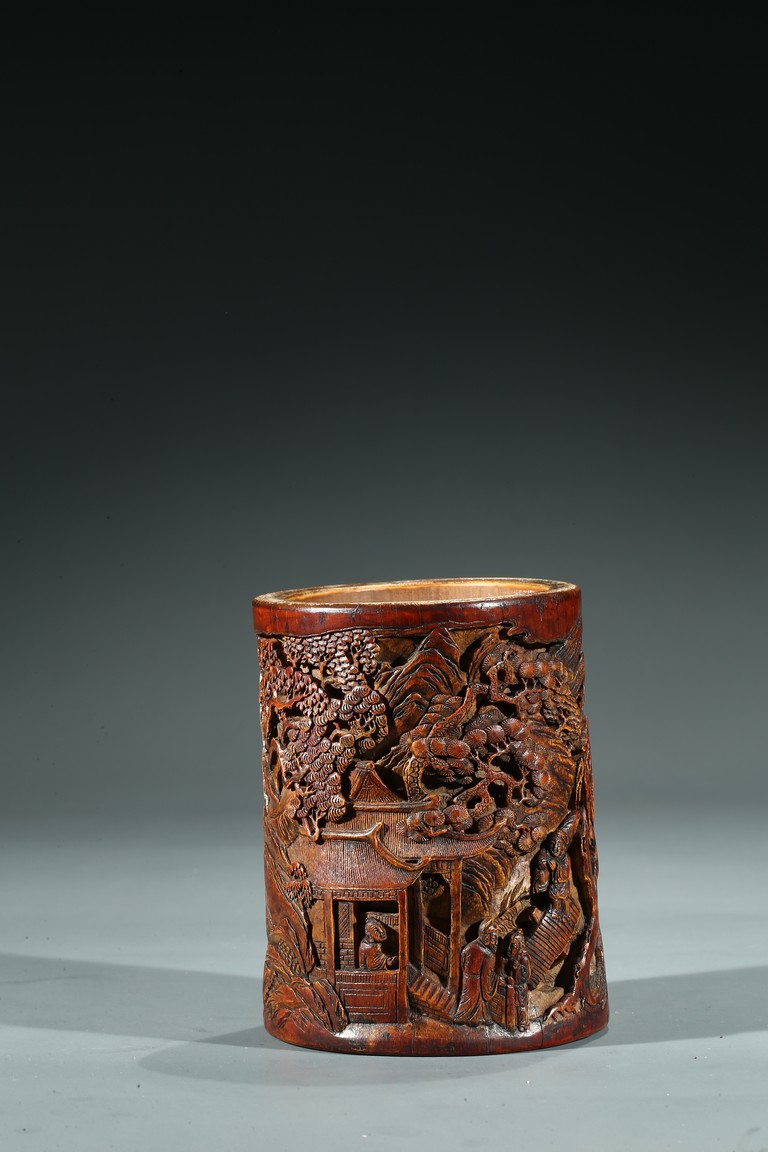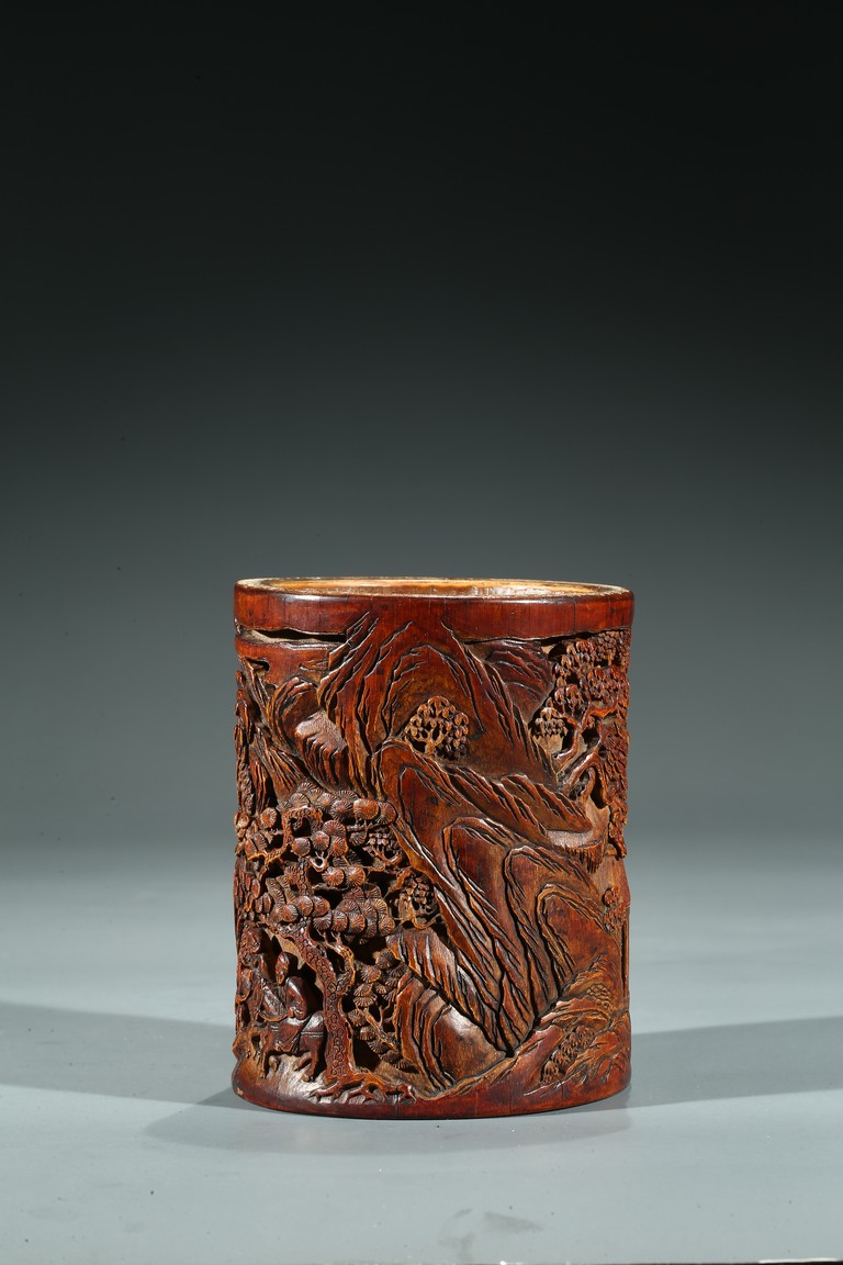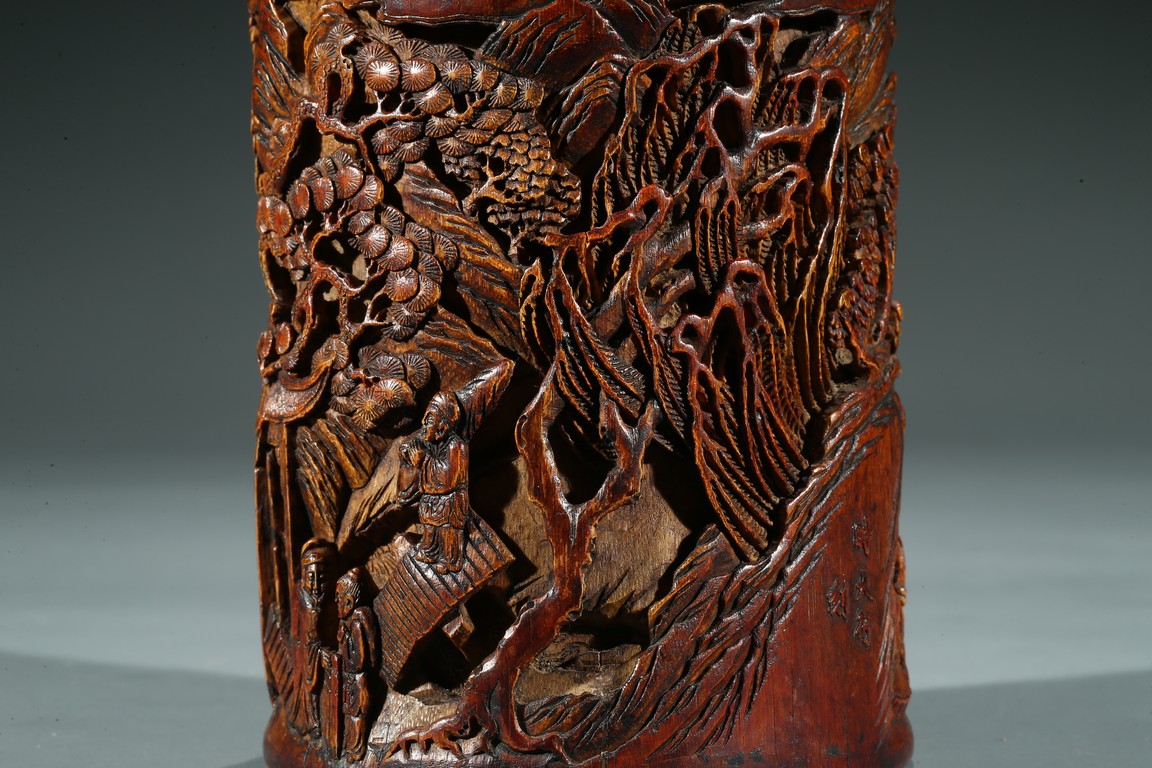 A CHINESE BAMBOO 'LANDSCAPE' INSCRIBED BRUSHPOT 清 雕竹人物故事筆筒
