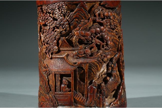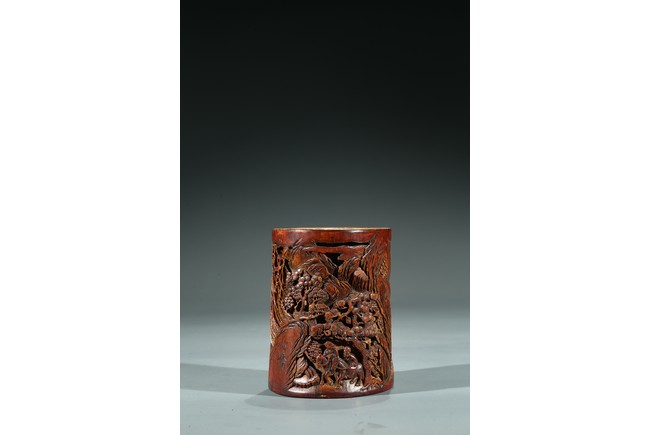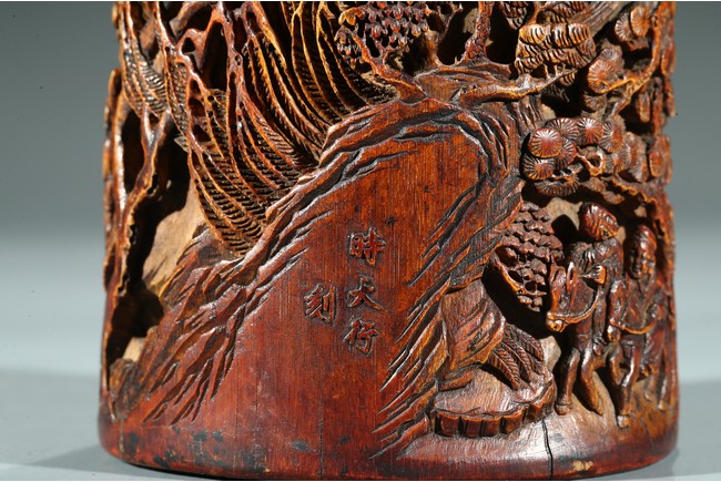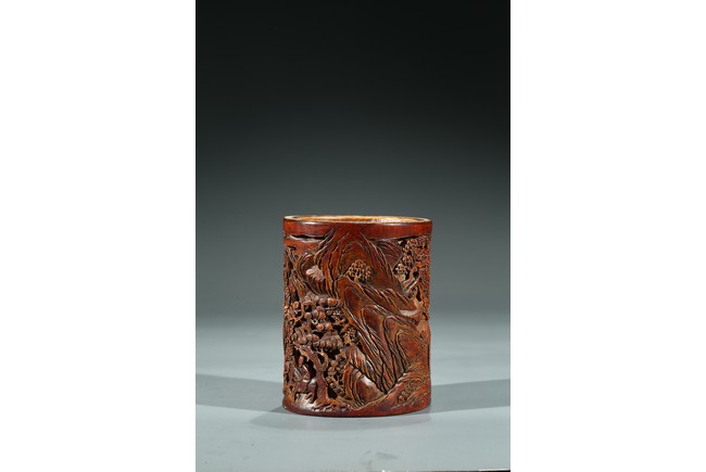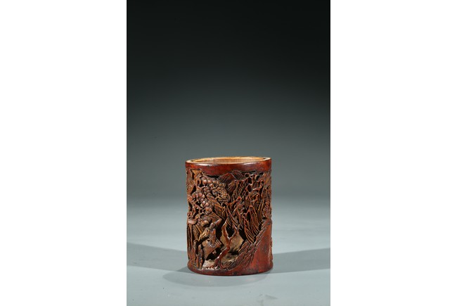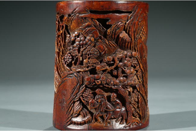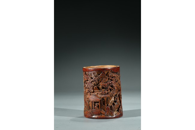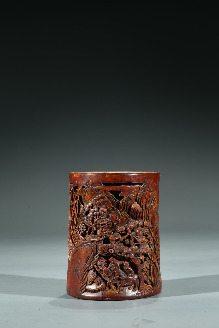 A CHINESE BAMBOO 'LANDSCAPE' INSCRIBED BRUSHPOT 清 雕竹人物故事筆筒