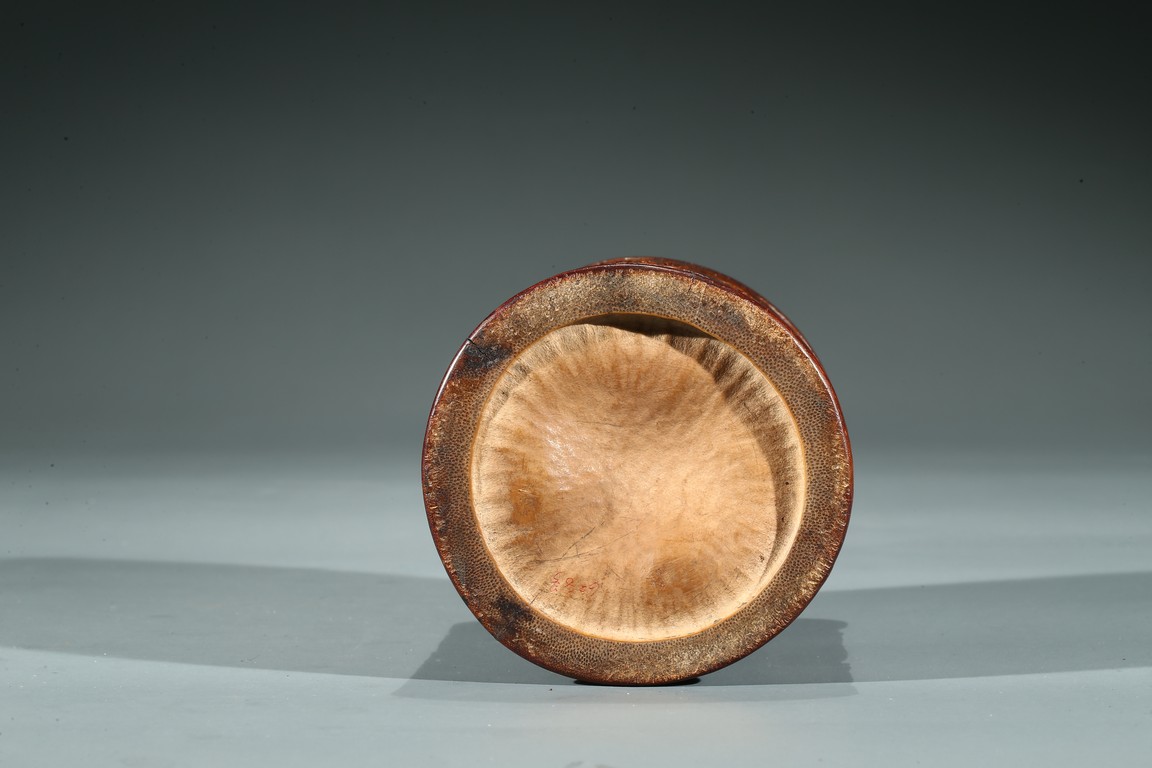 Of cylindrical form, the body carved to depict figures in mountain landscape, signed Shi Tian Xing.