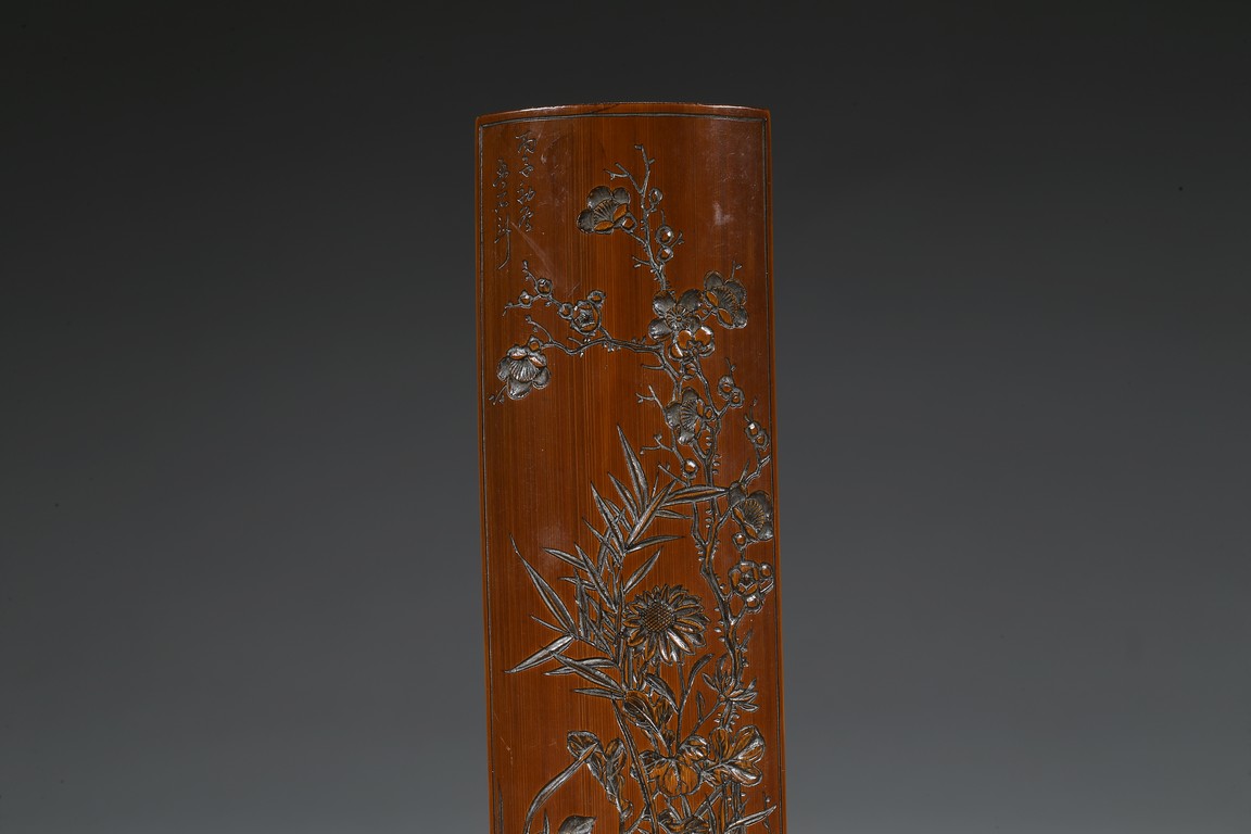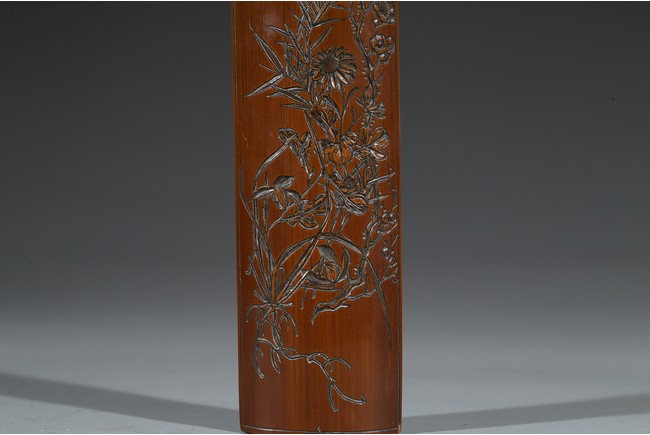The wristrest is of naturalistic form, one side carved in high relief with two cranes standing upon large gnarled pine tree branches, the wood patinated to a rich chocolate-brown tone. Qing Dynasty period.