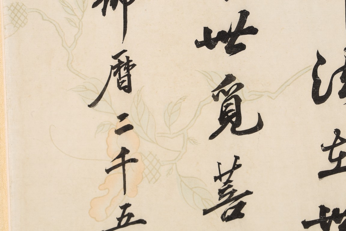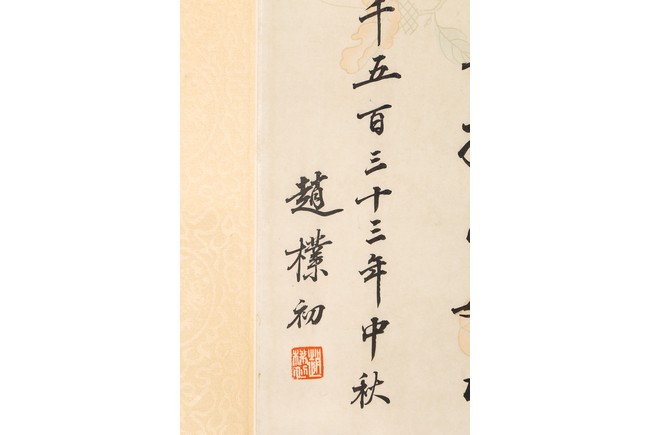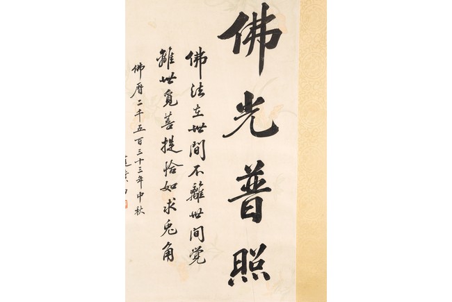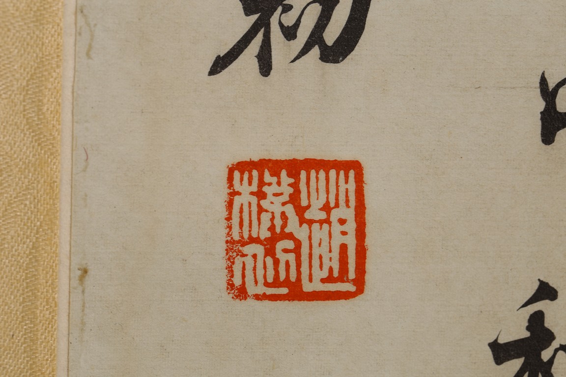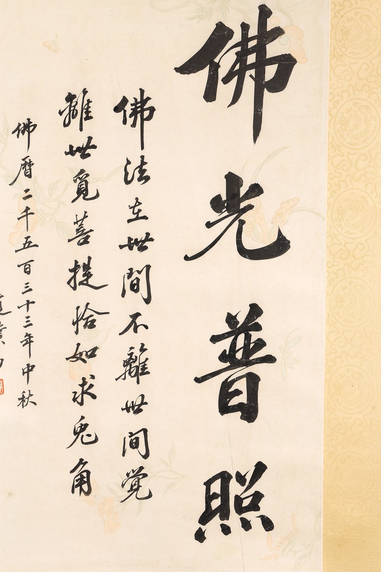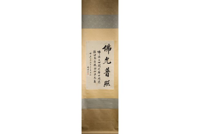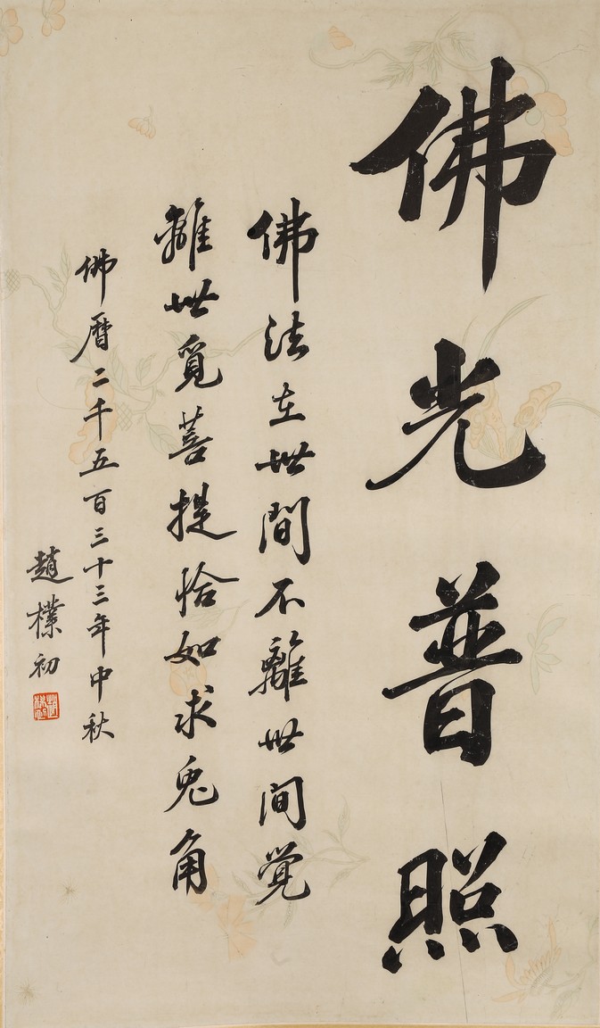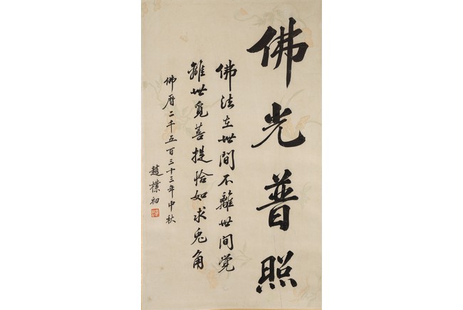 Ink on paper. Four character Running script calligraphy. Hanging scroll. Inscribed and signed Zhao Puchu, with one seal mark.