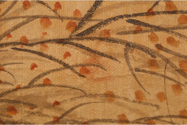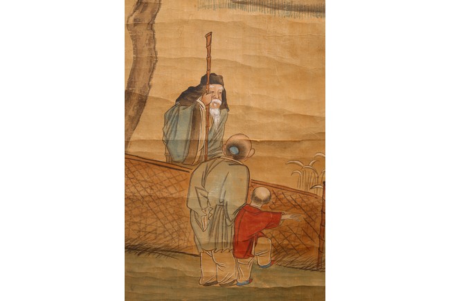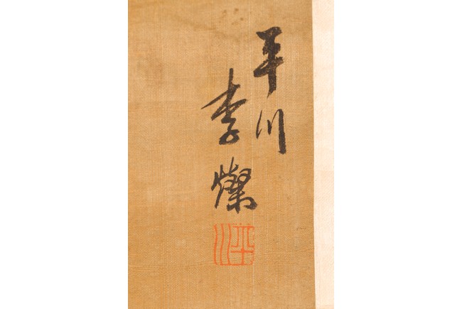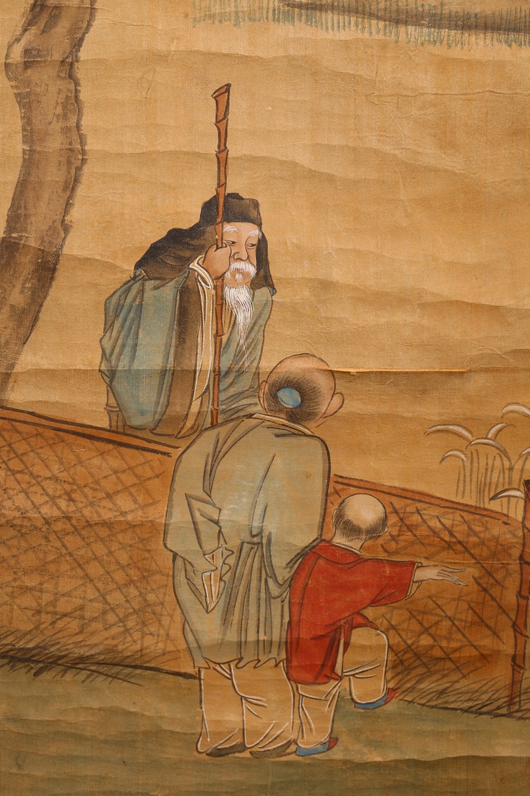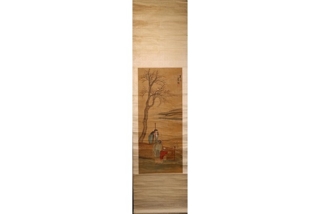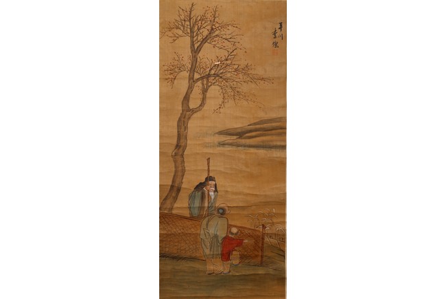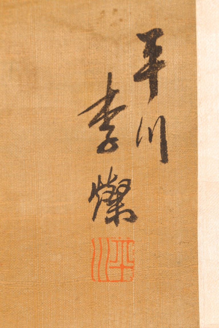 Color and ink on silk. Figures. Hanging scroll. Signed Li Can with one seal mark.
