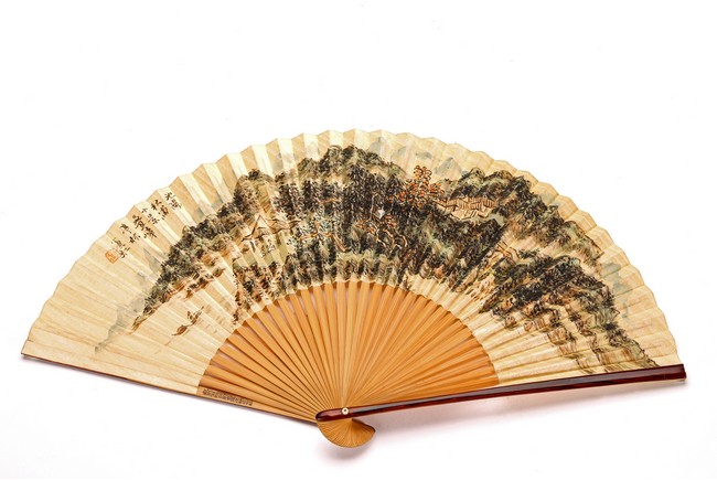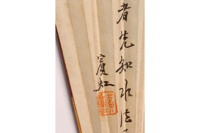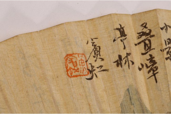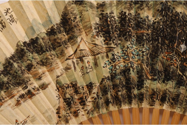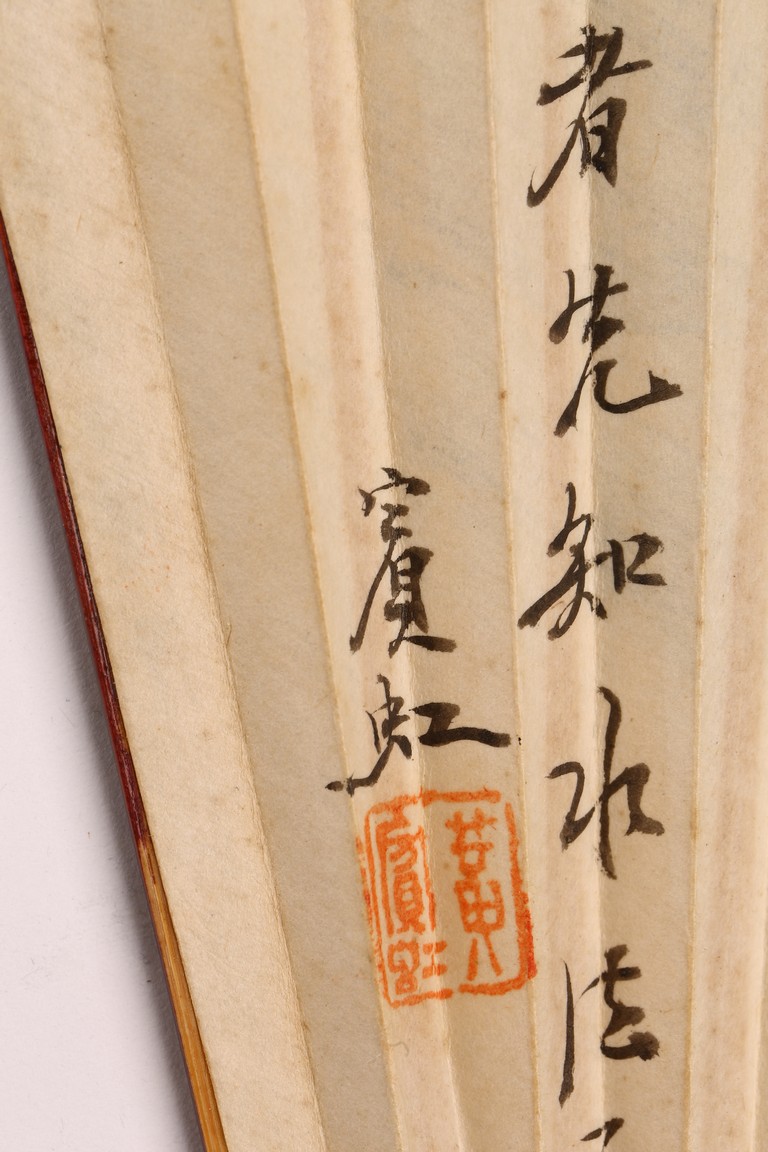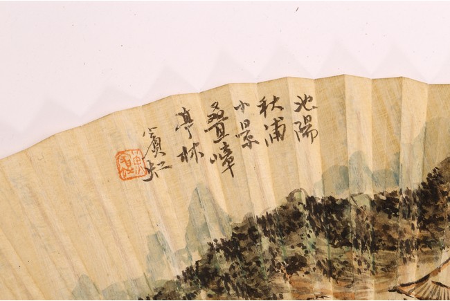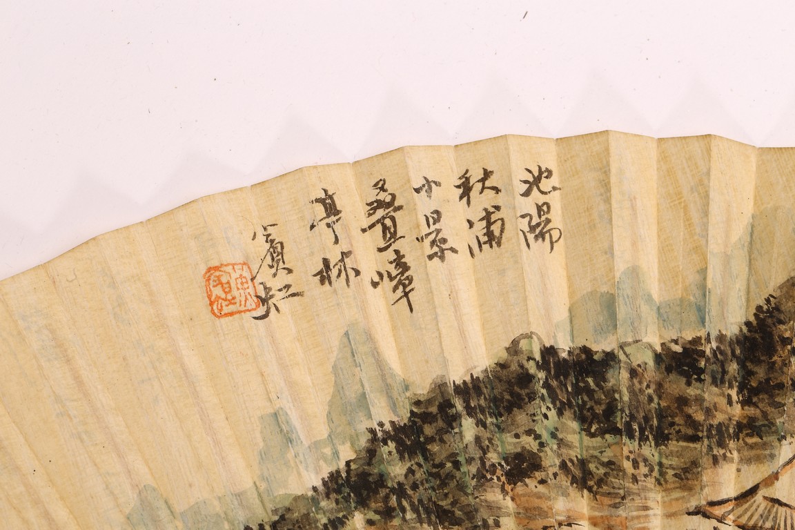 Color and ink on paper. Landscape. Fan painting. Inscribed and signed Binhong, with one seal mark.