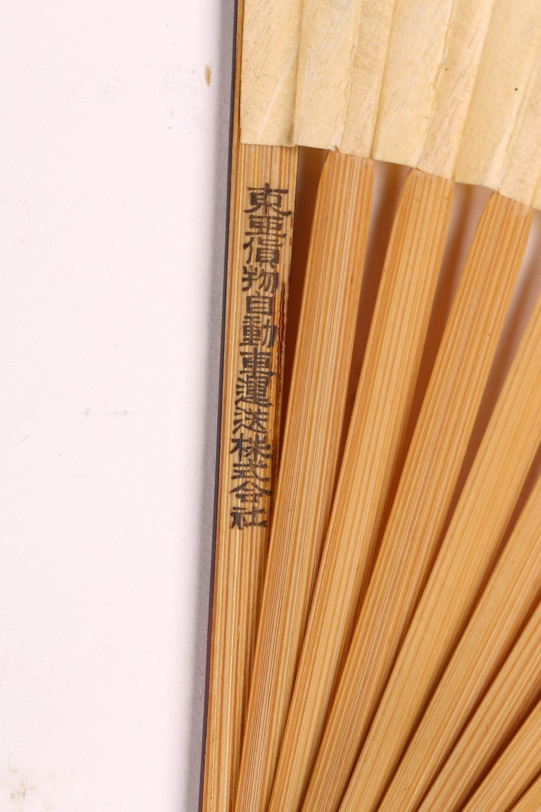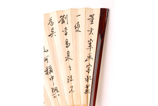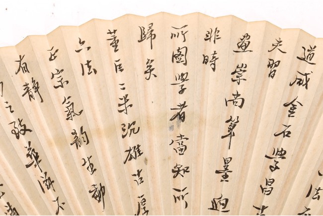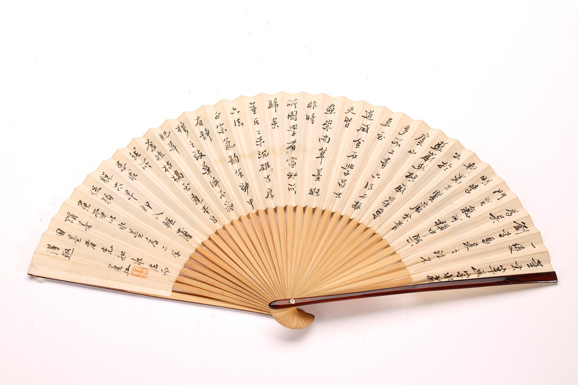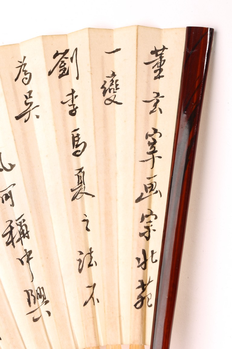 Color and ink on paper. Landscape. Fan painting. Inscribed and signed Binhong, with one seal mark.