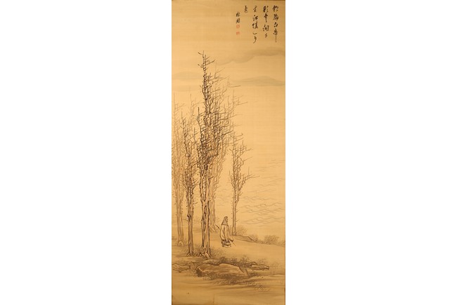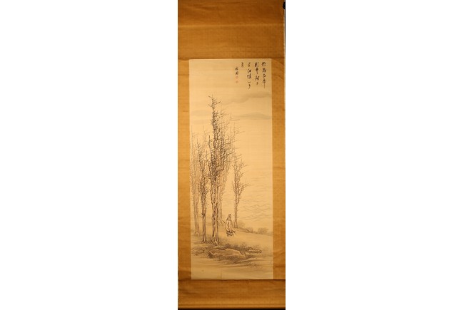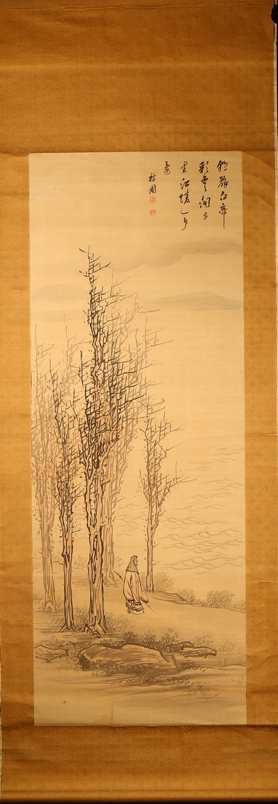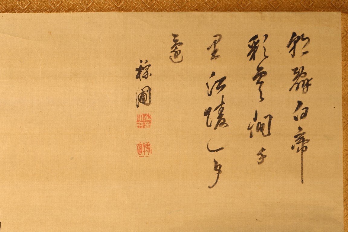 Color and ink on paper. Riverscape. Hanging scroll. Inscribed and signed Jia Pu, with two seal marks of the artist.