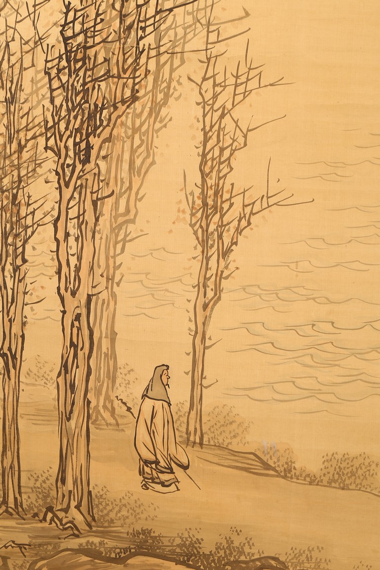 A CHINESE COLOR AND INK ON PAPER 'RIVERSCAPE' PAINTING    江稼圃 山水人物 紙本 立軸