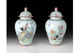A CHINESE PAIR OF FAMILLE ROSE JARS WITH COVERS