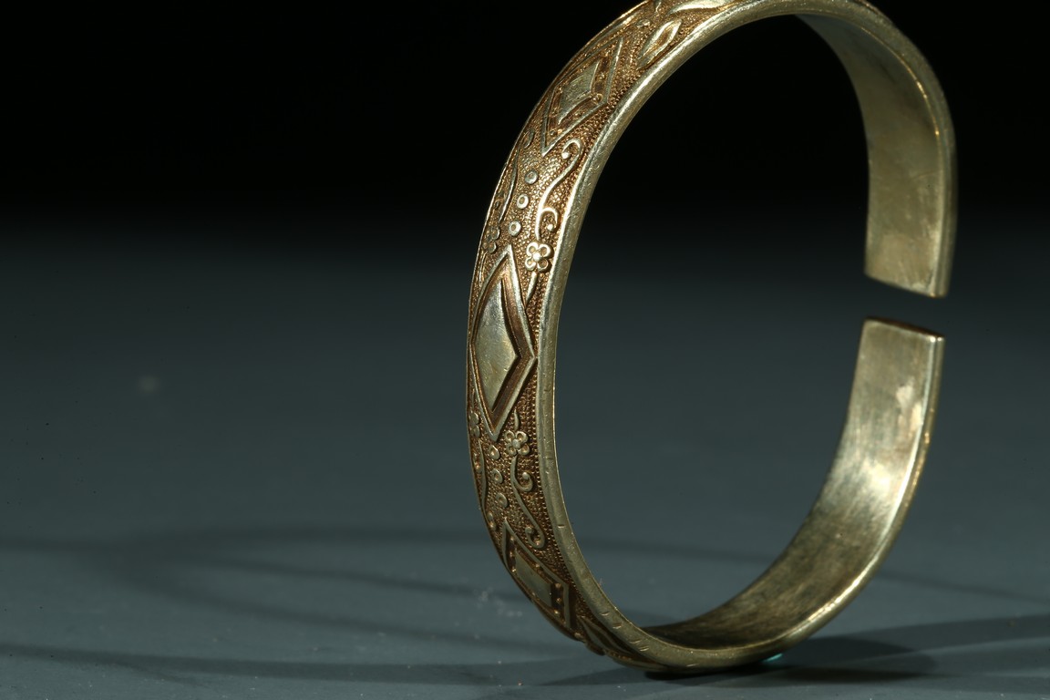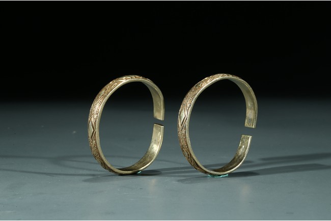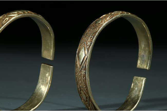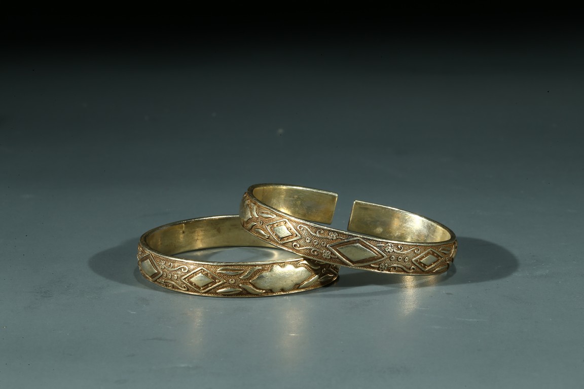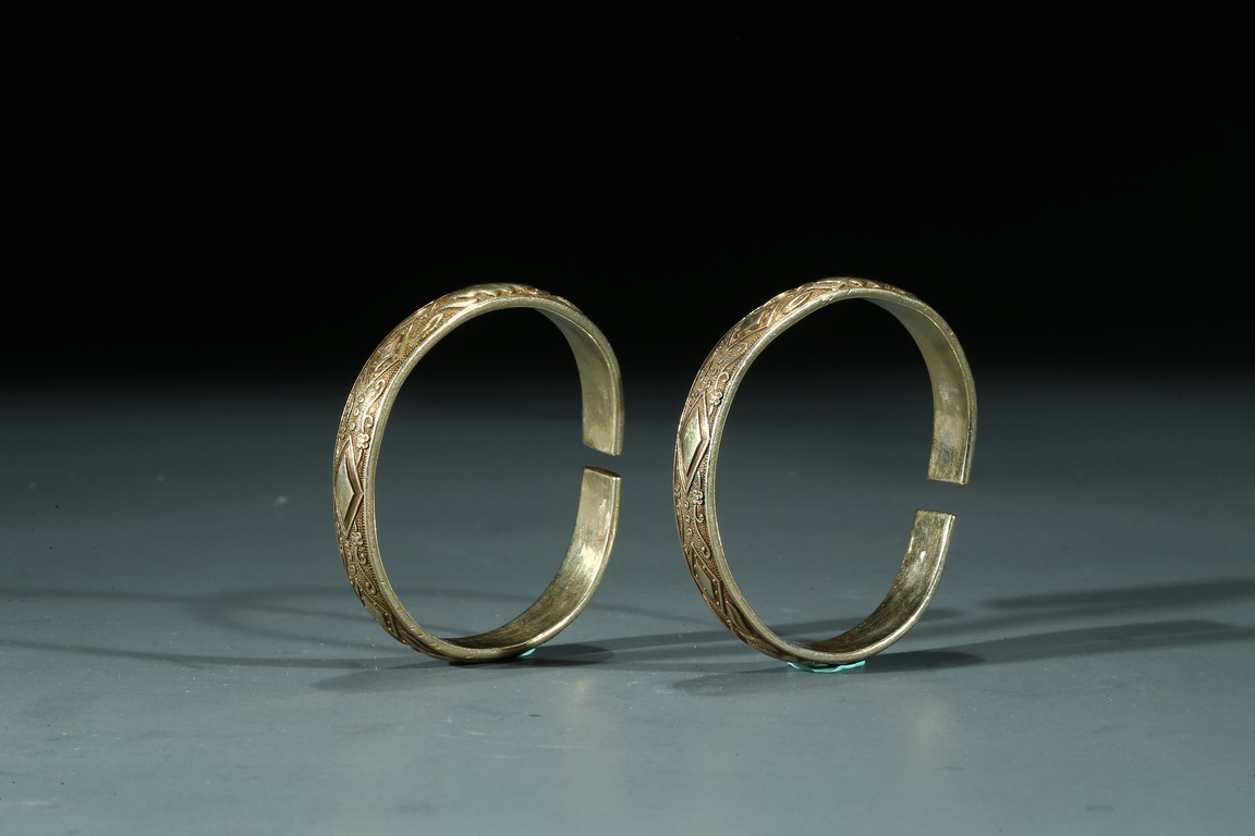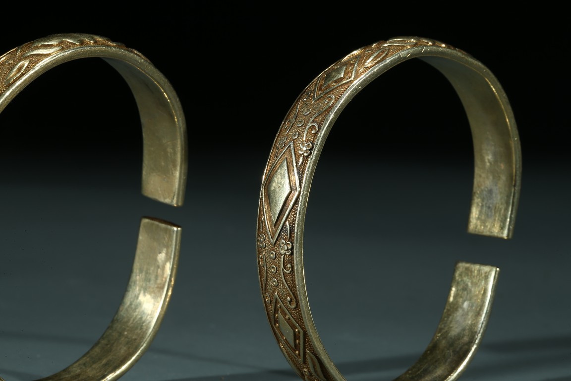 Each of C-shape, the side delicately engraved with repeated rhombus design separated by floral scrolls.