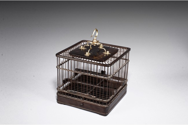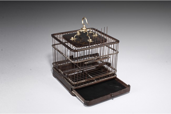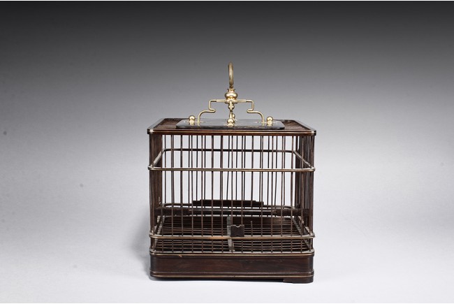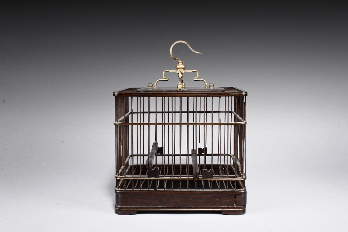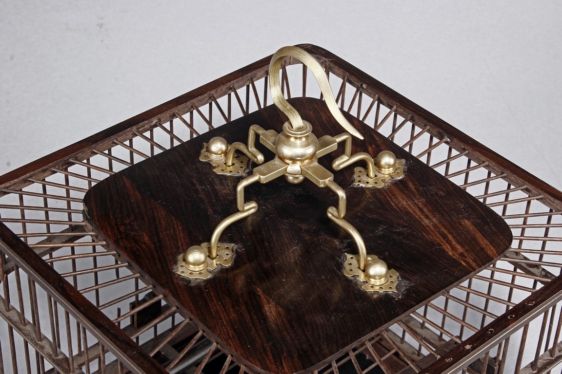 Of squared form, the cage was carved out of hongmu hardwood, the top with gilt bronze hanging hook. Qing Dynasty period.