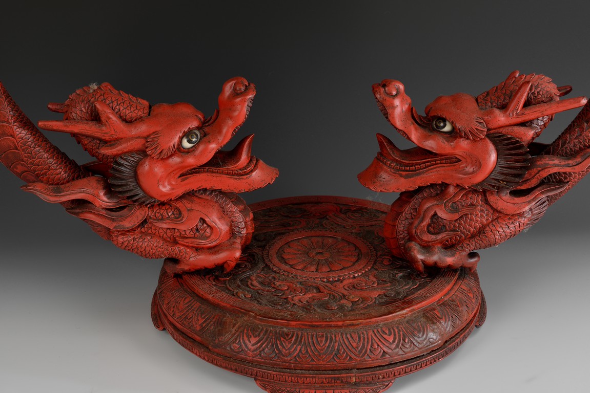 A wood carved stand with twin dragons and overall covered with red lacquer. The two dragons have the tail on top, forming support for the top leiwen covered stand, and the heads confronting, with open eyes and mouths, the claws are attached to the bottom base, which is carved with intricate patterns. Qing Dynasty period.