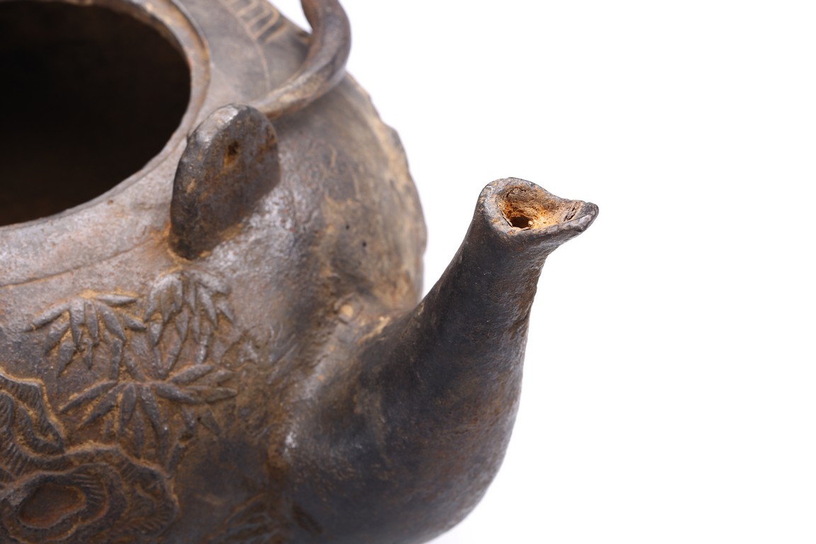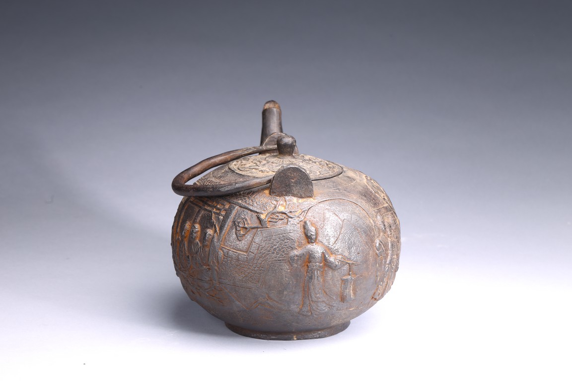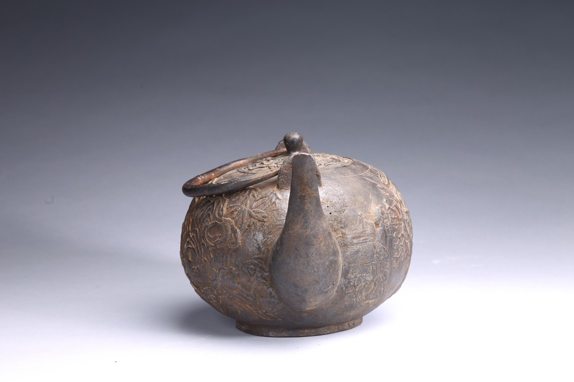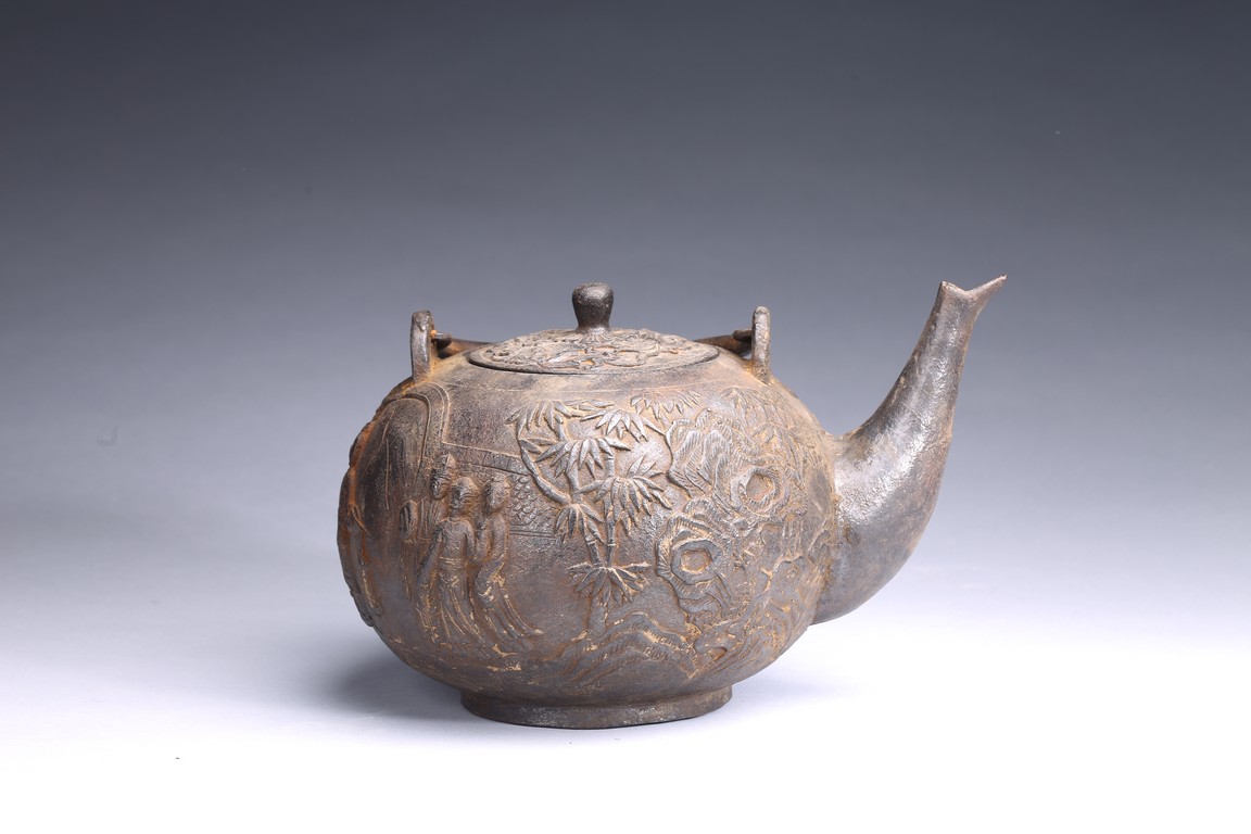 Well casted, the iron teapot is of globular form, the body depicts a scene of gathering in the garden, with the ladies on the side with bamboo trees and rocks, and men seated under a small pavilion, bottom bears four character mark.