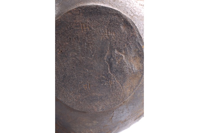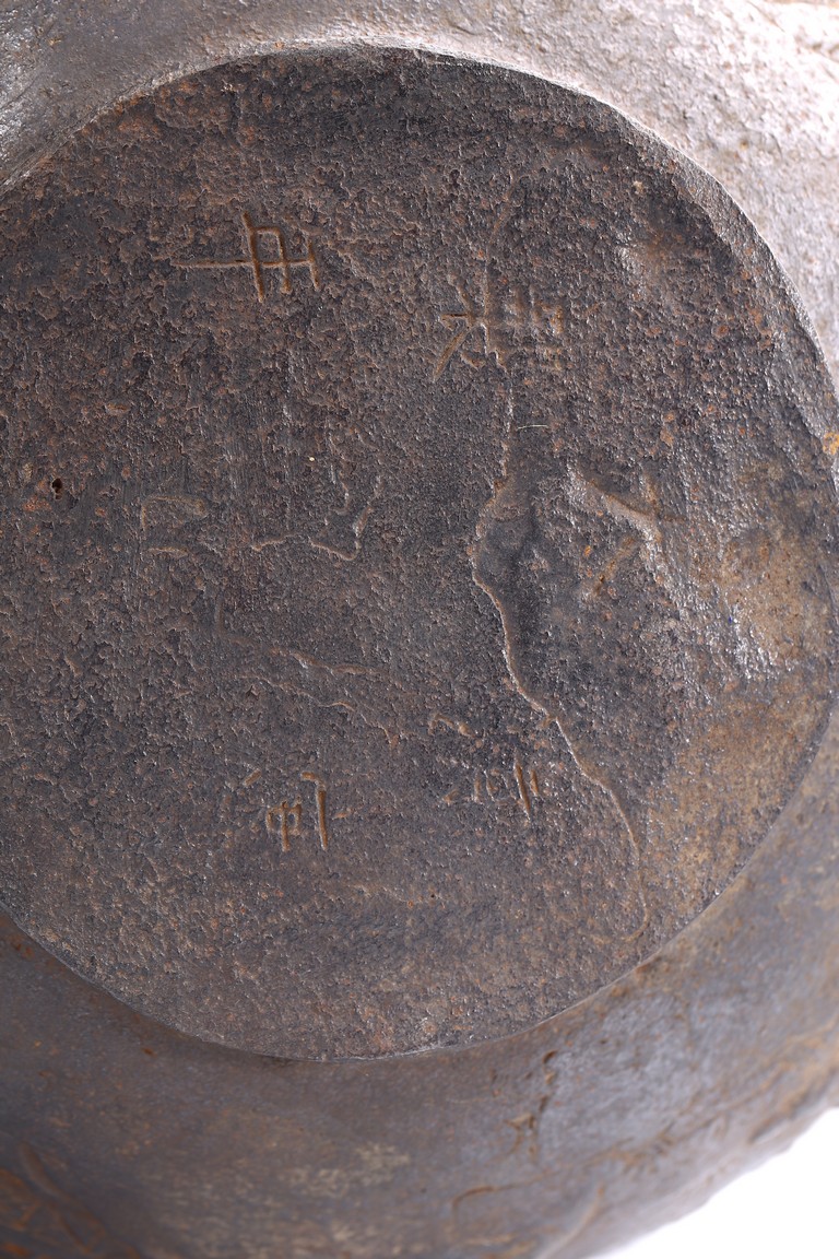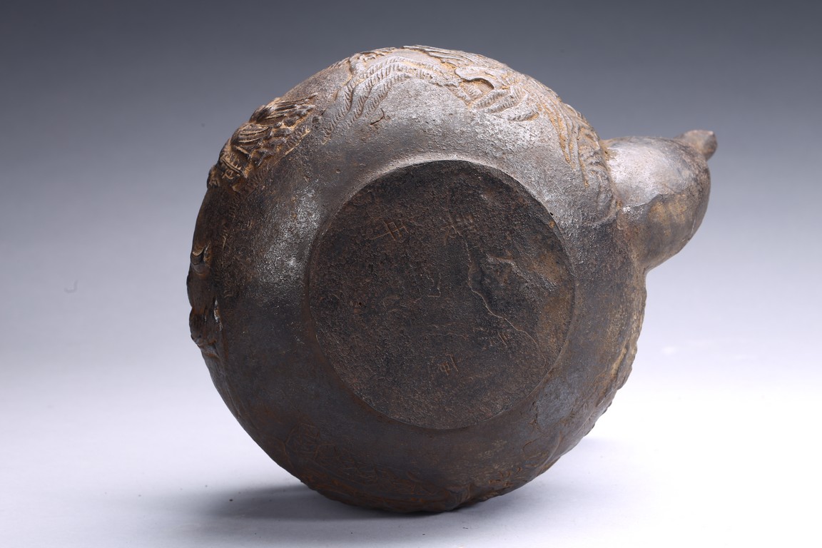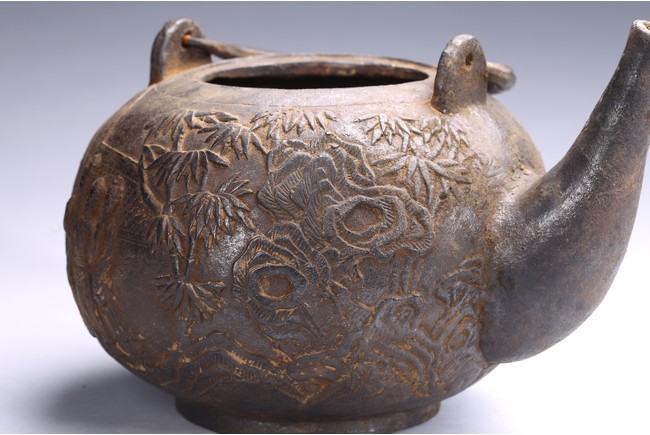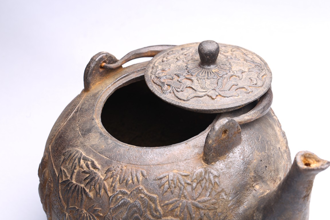 Well casted, the iron teapot is of globular form, the body depicts a scene of gathering in the garden, with the ladies on the side with bamboo trees and rocks, and men seated under a small pavilion, bottom bears four character mark.