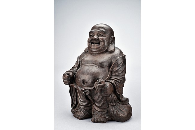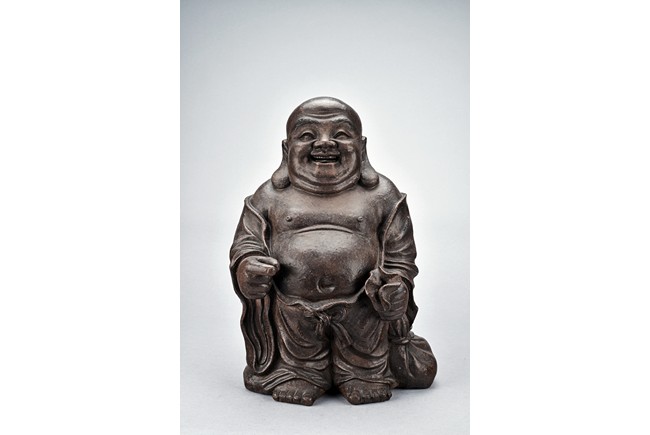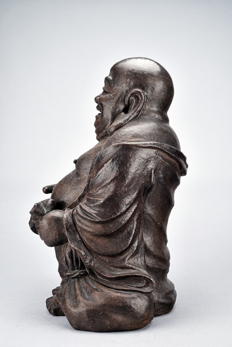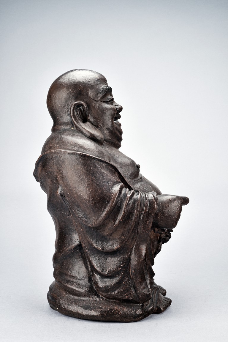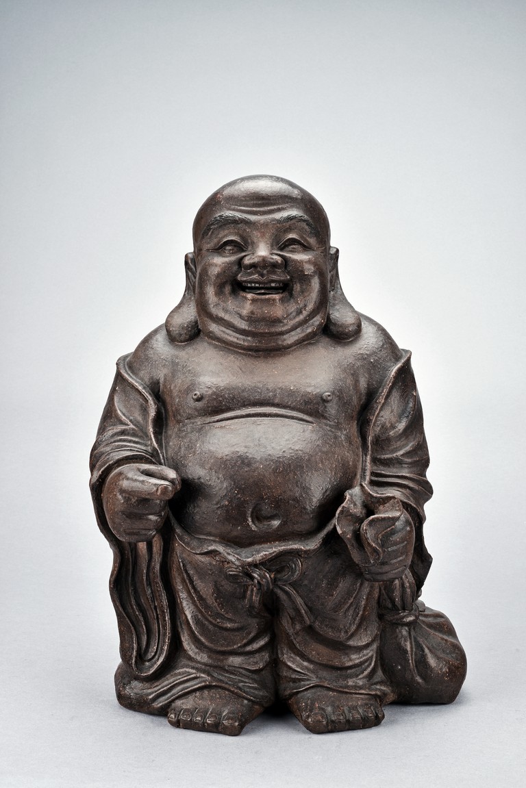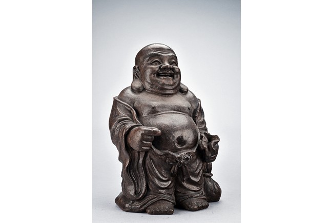 The figure is shown wearing long flowing robe, the large belly exposed, left hand dragging a bag, the face with laughing expression flanked by two large and pendulous earlobes.