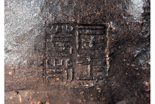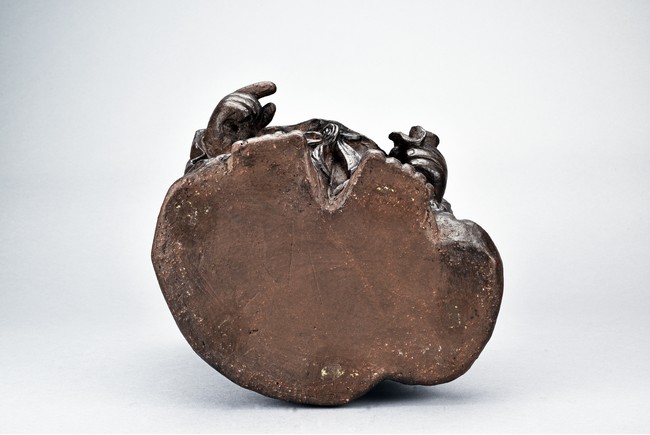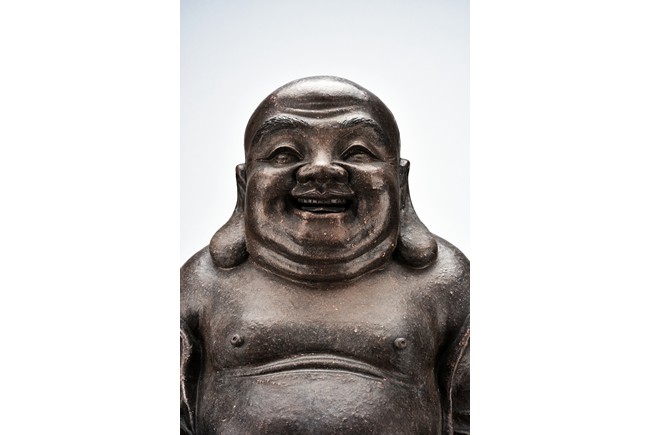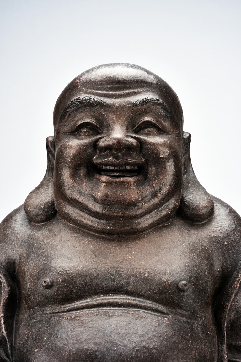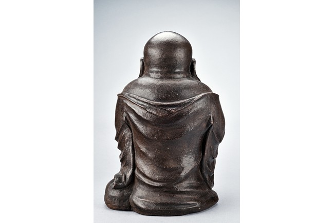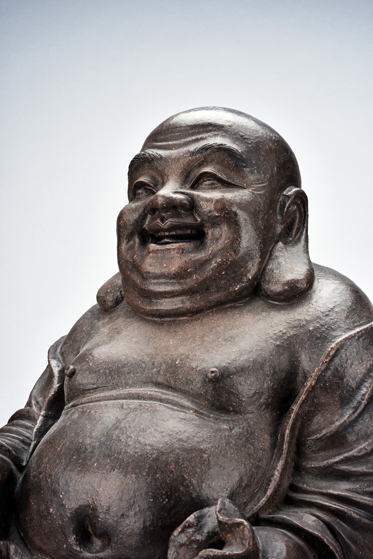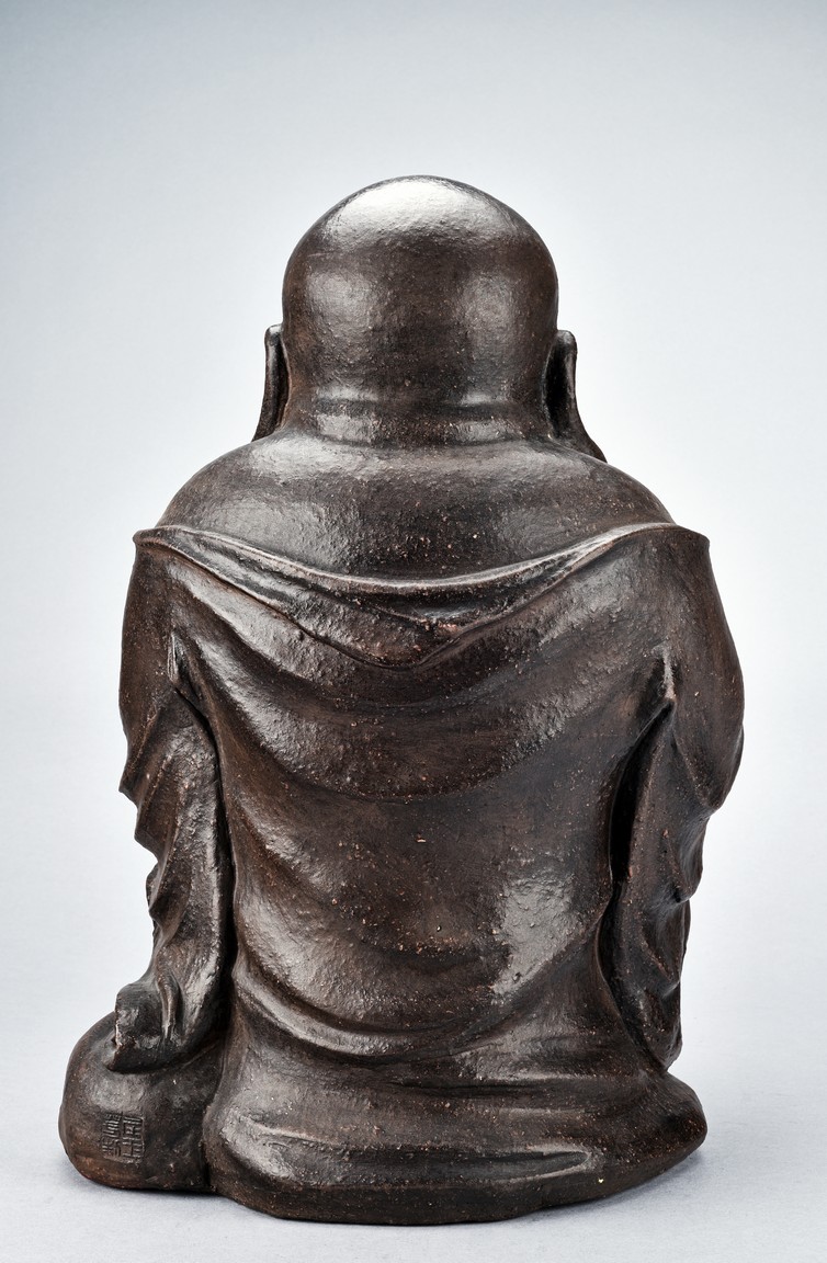 The figure is shown wearing long flowing robe, the large belly exposed, left hand dragging a bag, the face with laughing expression flanked by two large and pendulous earlobes.