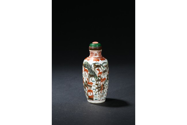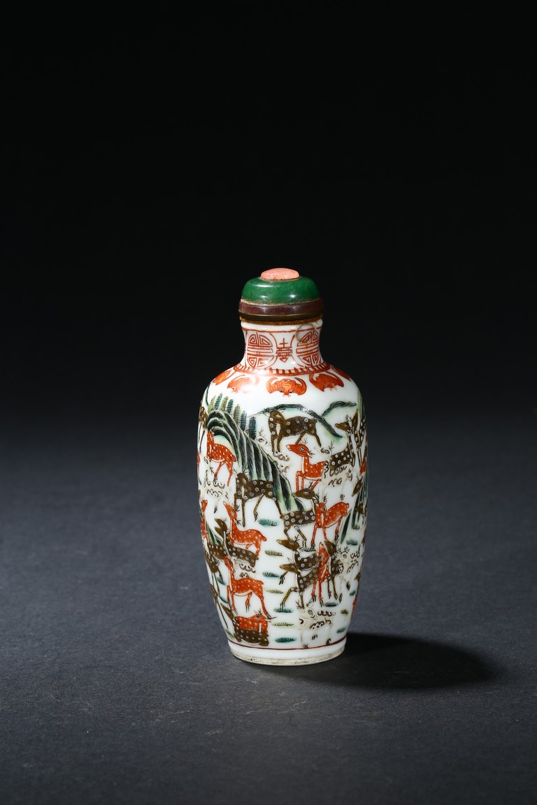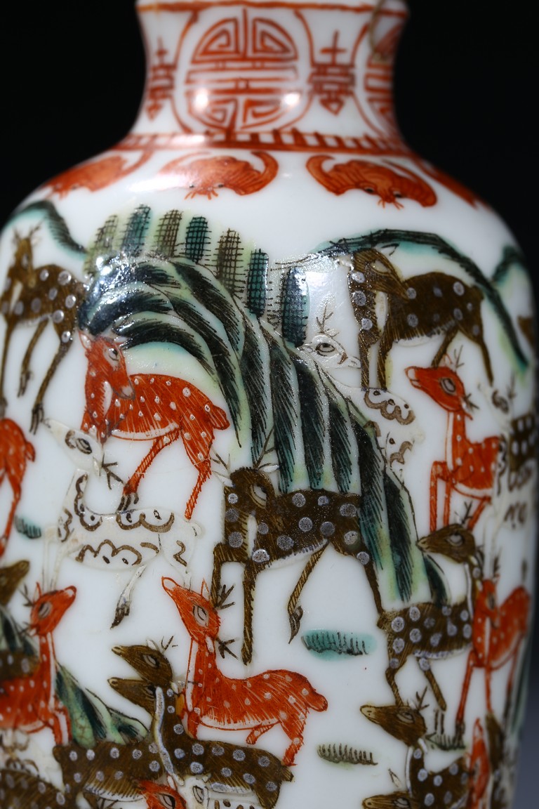 The body painted with numerous deer in a garden scene, the neck decorated with a band of auspicious bats and shou medallions. The base decorated with a single deer. Qing Dynasty period.