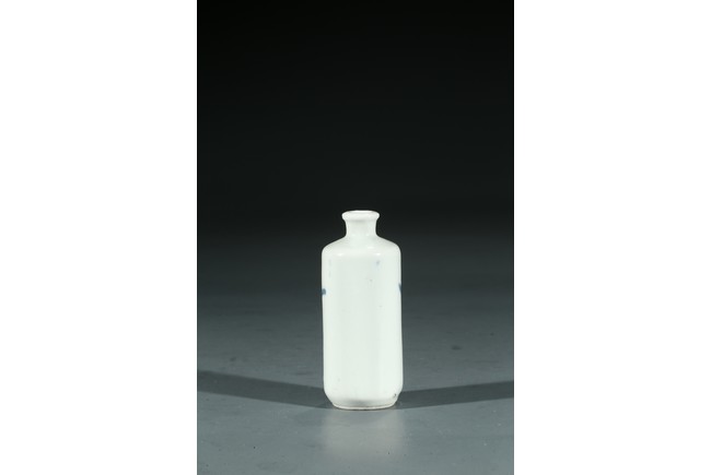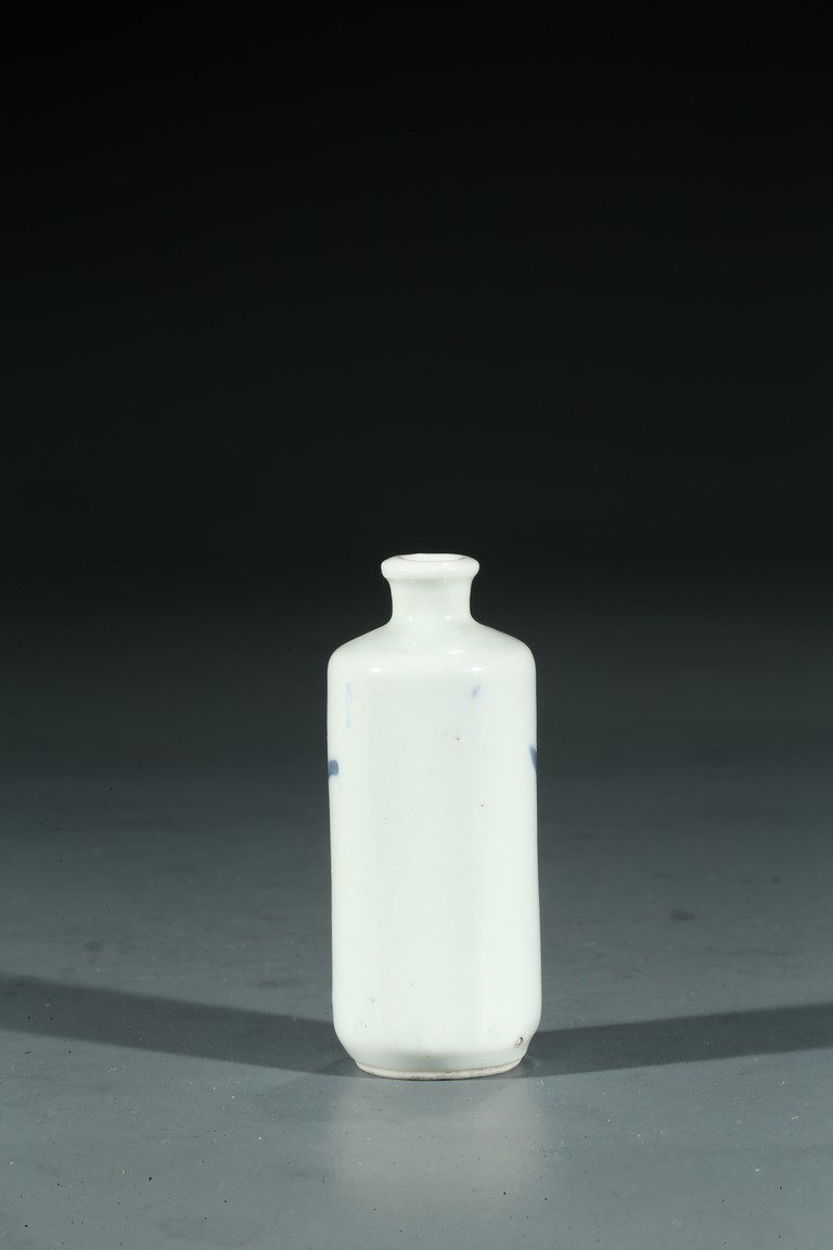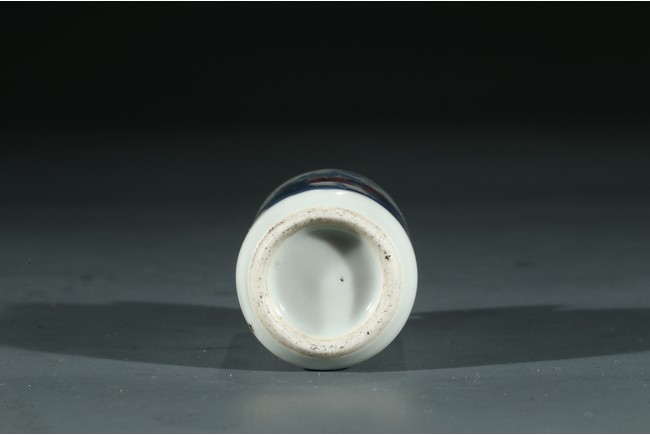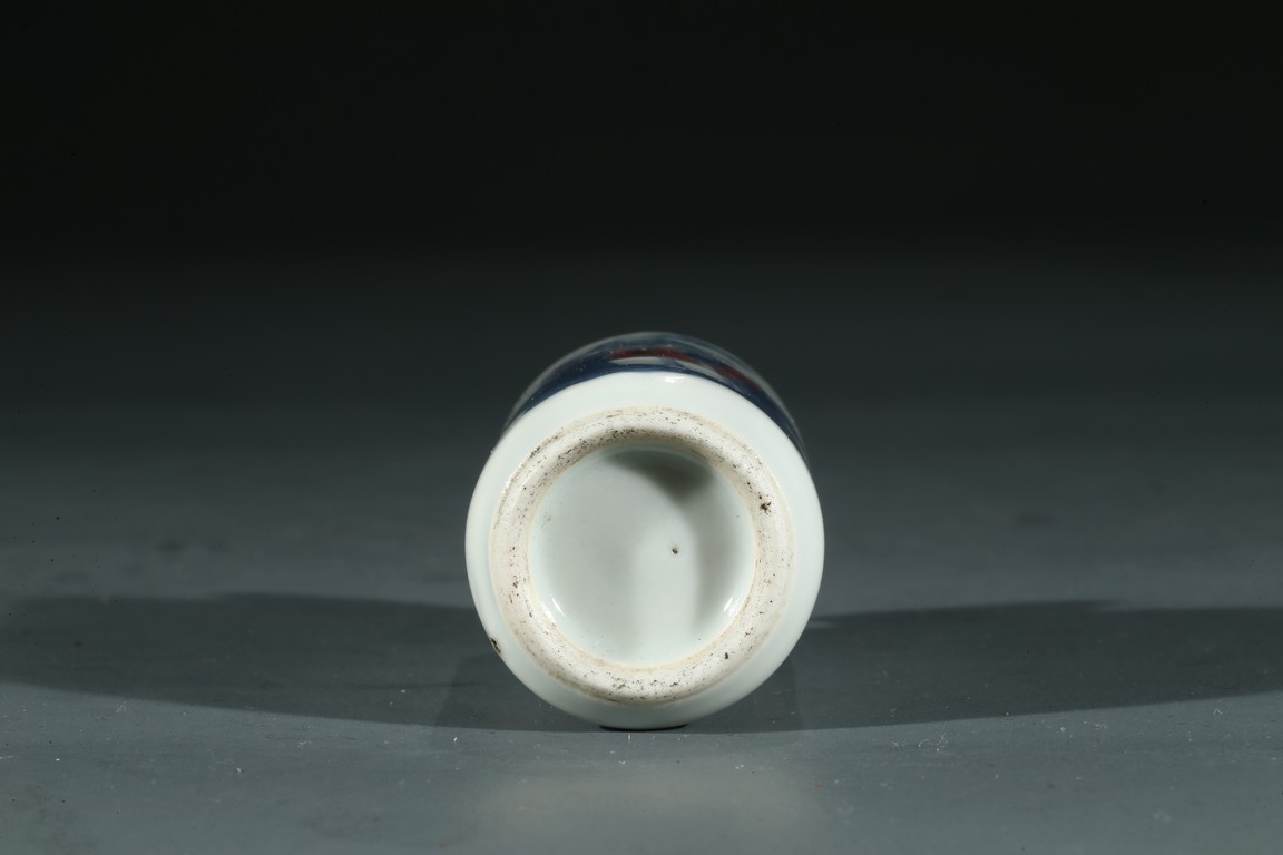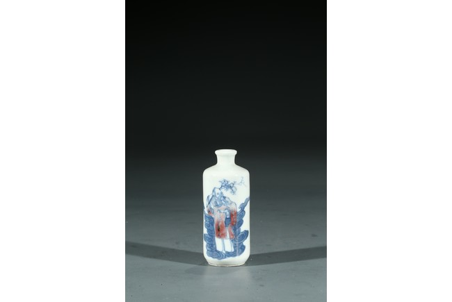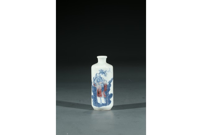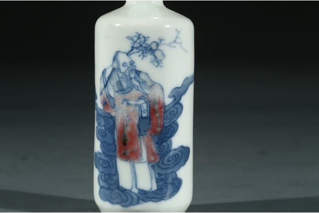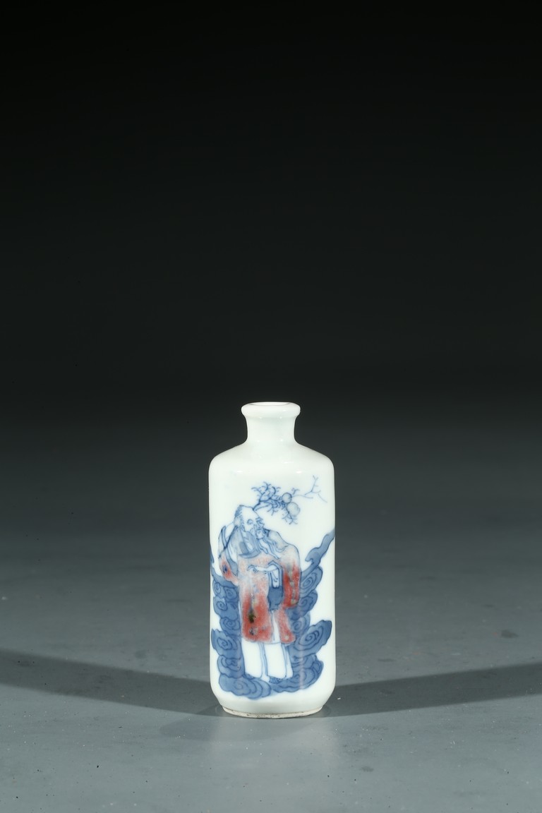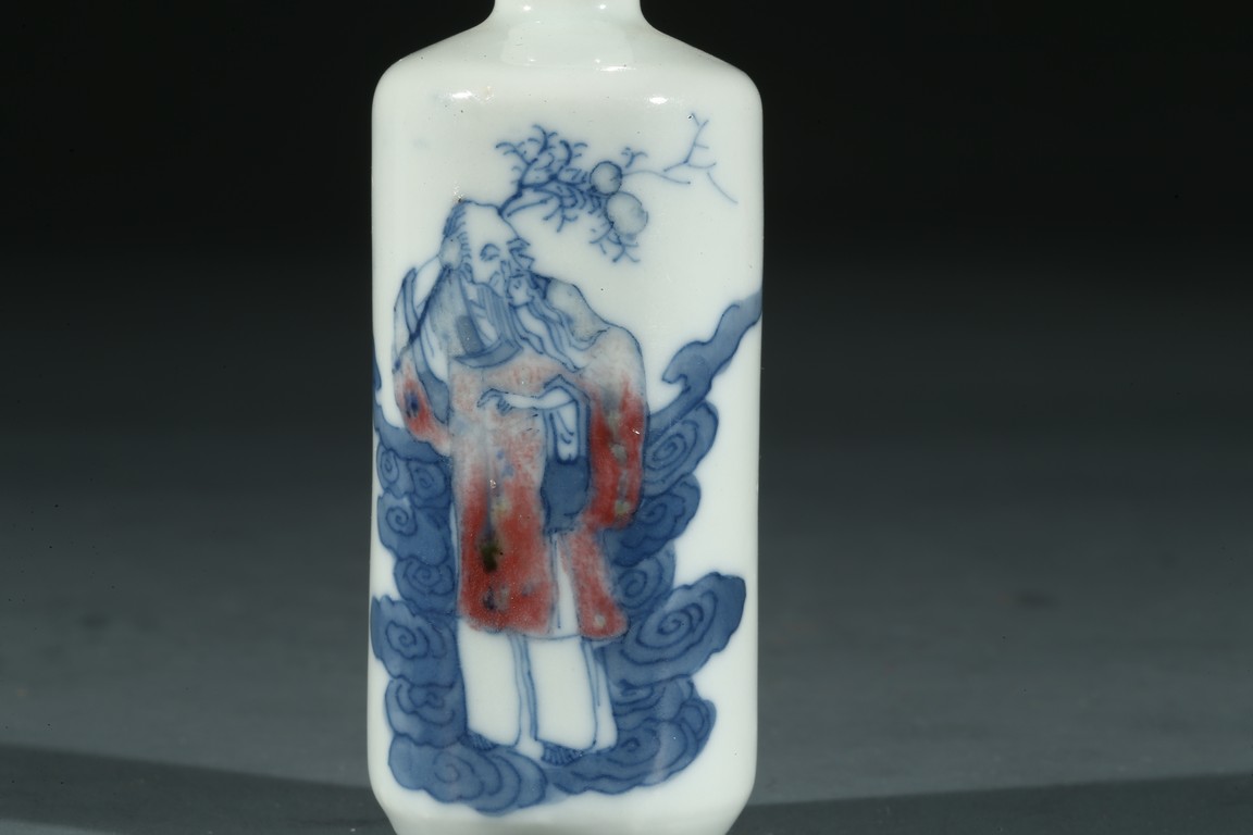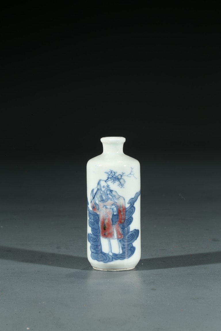 Qing Dynasty period. Painted with an elderly immortal holding wearing underglaze red robe holding peach sprigs on one hand while standing upon clouds, the base rim unglazed, cap missing.