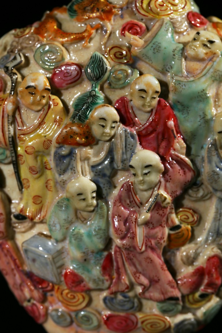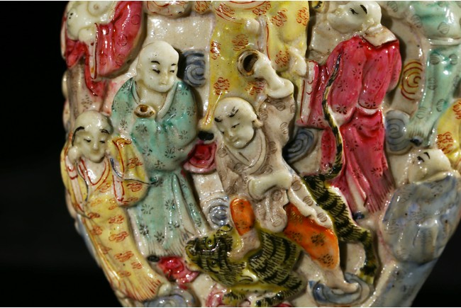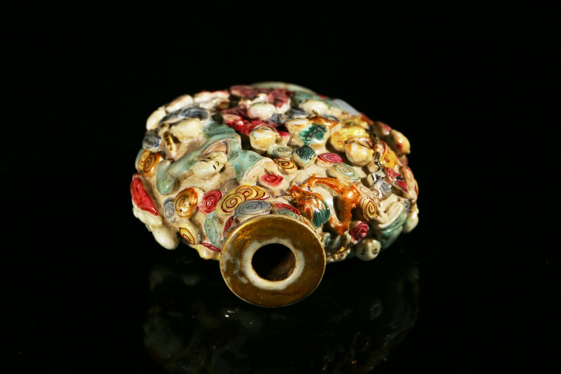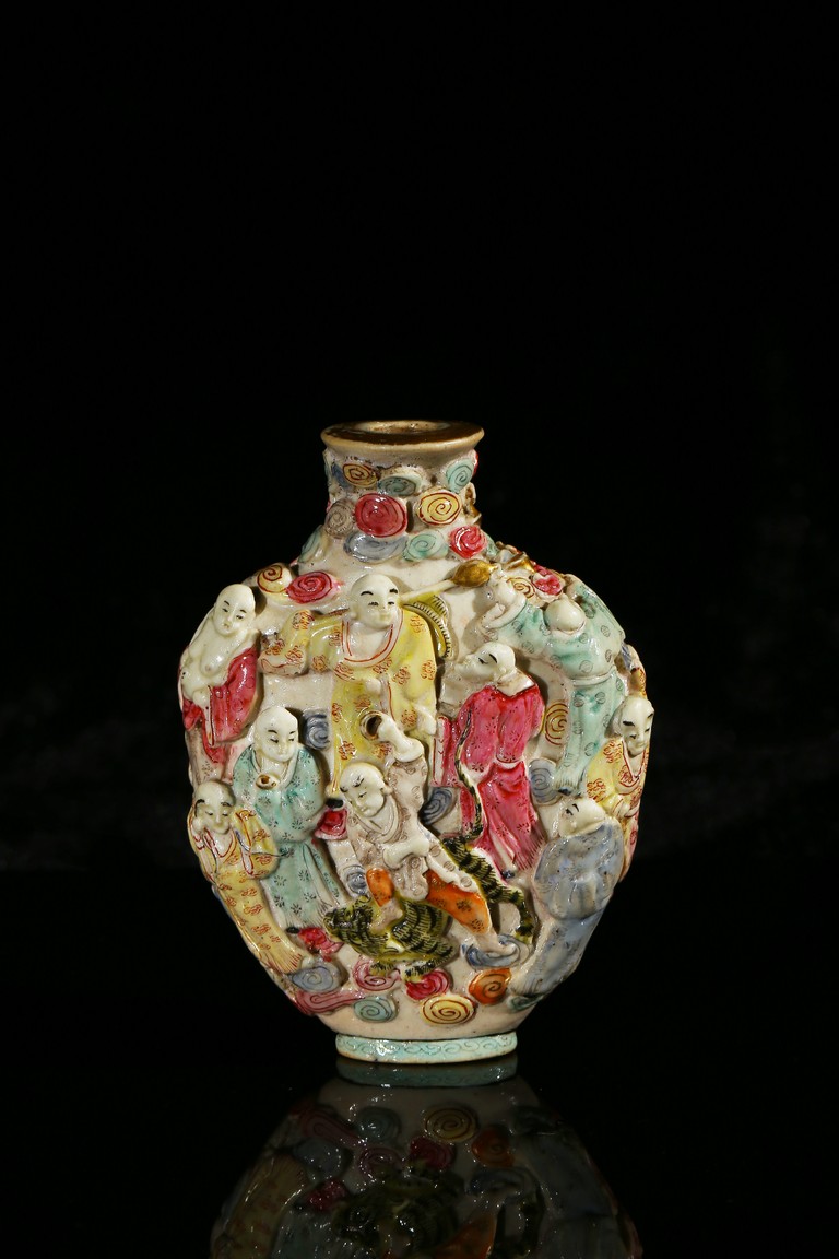 The bottle is crisply molded with a dragon and the Eighteen Luohan, each with his attribute, standing on clouds against a formalized wave ground. The mouth rim is gilt-painted. The base painted with four character 'QIANLONG' mark. Qing Dynasty period.