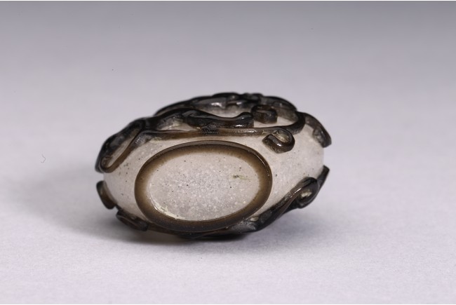 The semi-translucent white bottle carved through a layer of black glass to depict a sinuous chilong on both front and reverse. Qing Dynasty period.