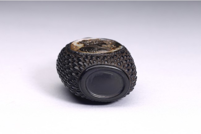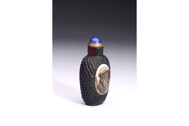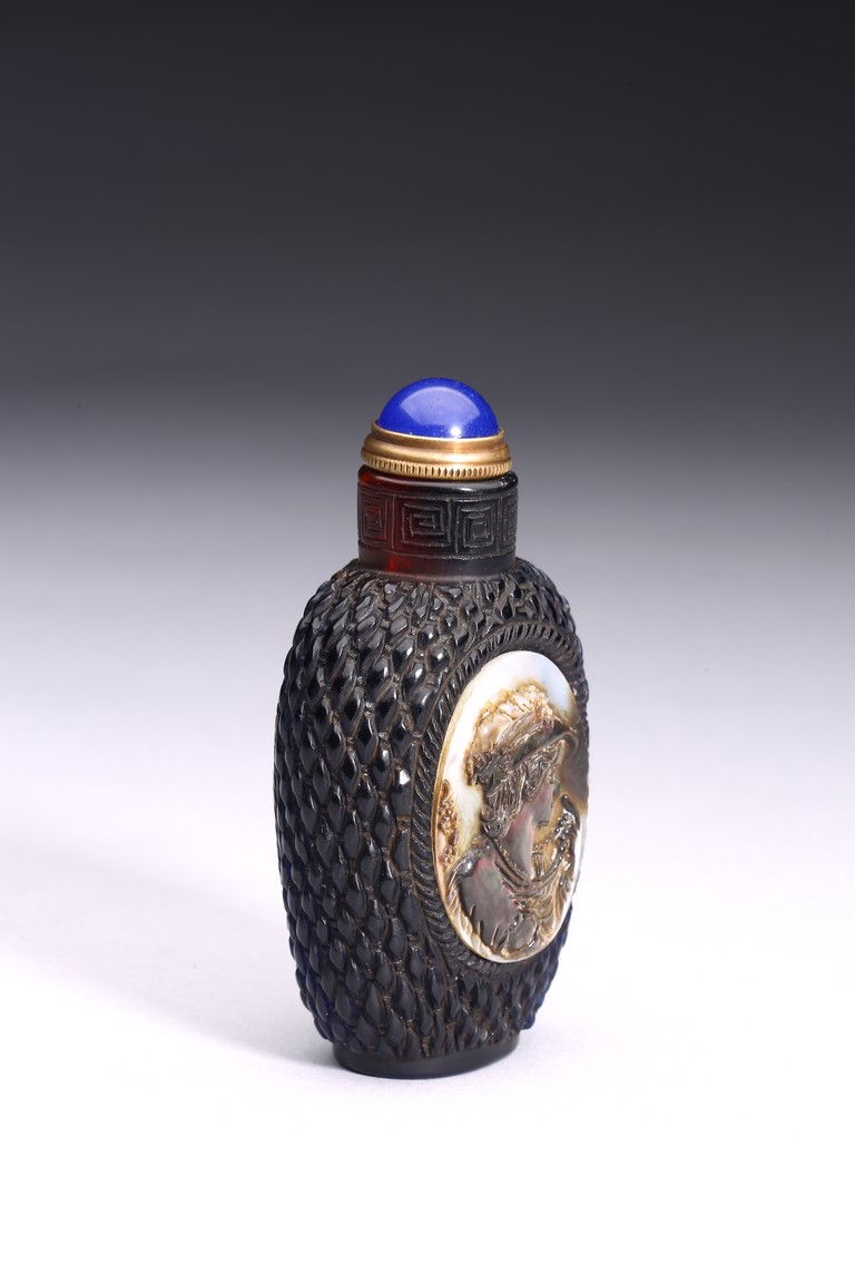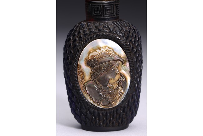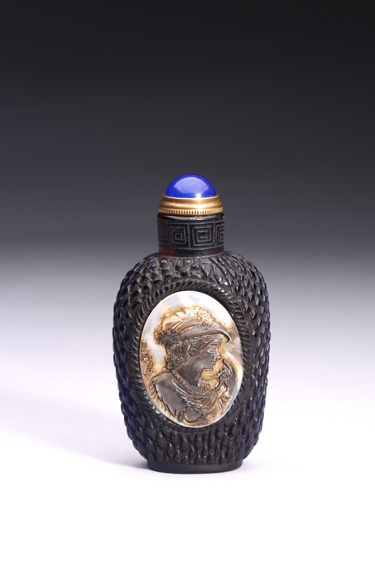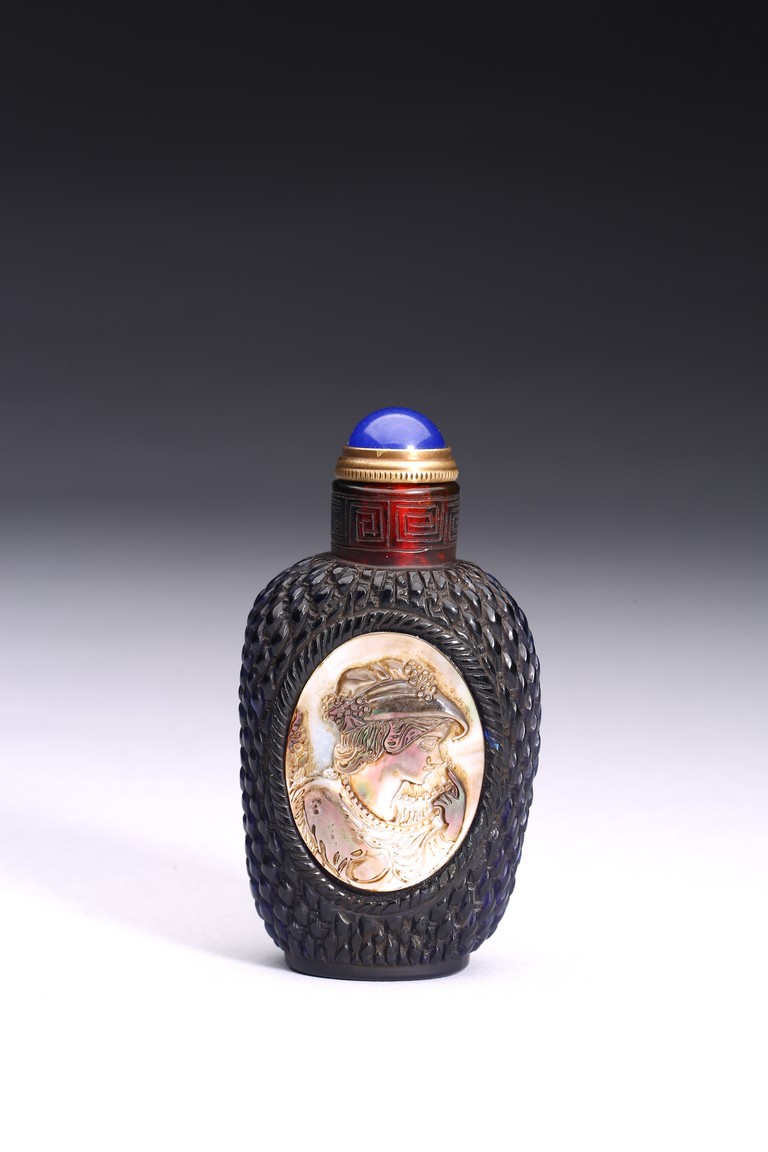 Of rounded rectangle form, the mother of pearl body carved western figure to the front and reverse, with shallow basket waves decorated throughout the body, blue stopper.