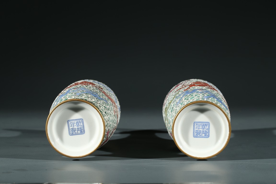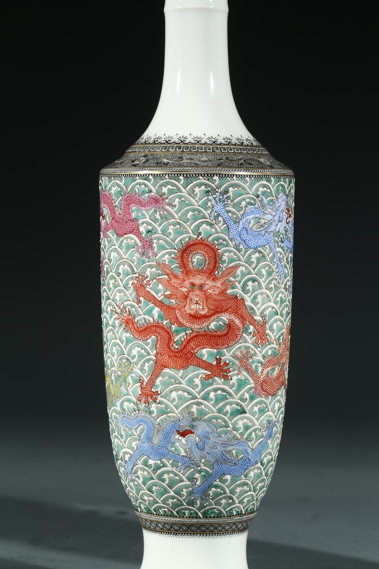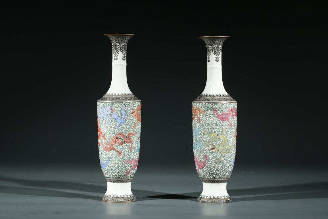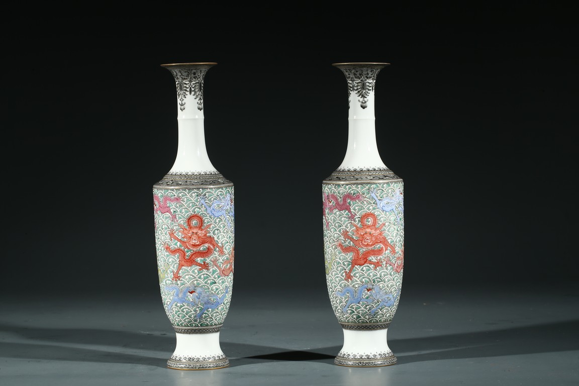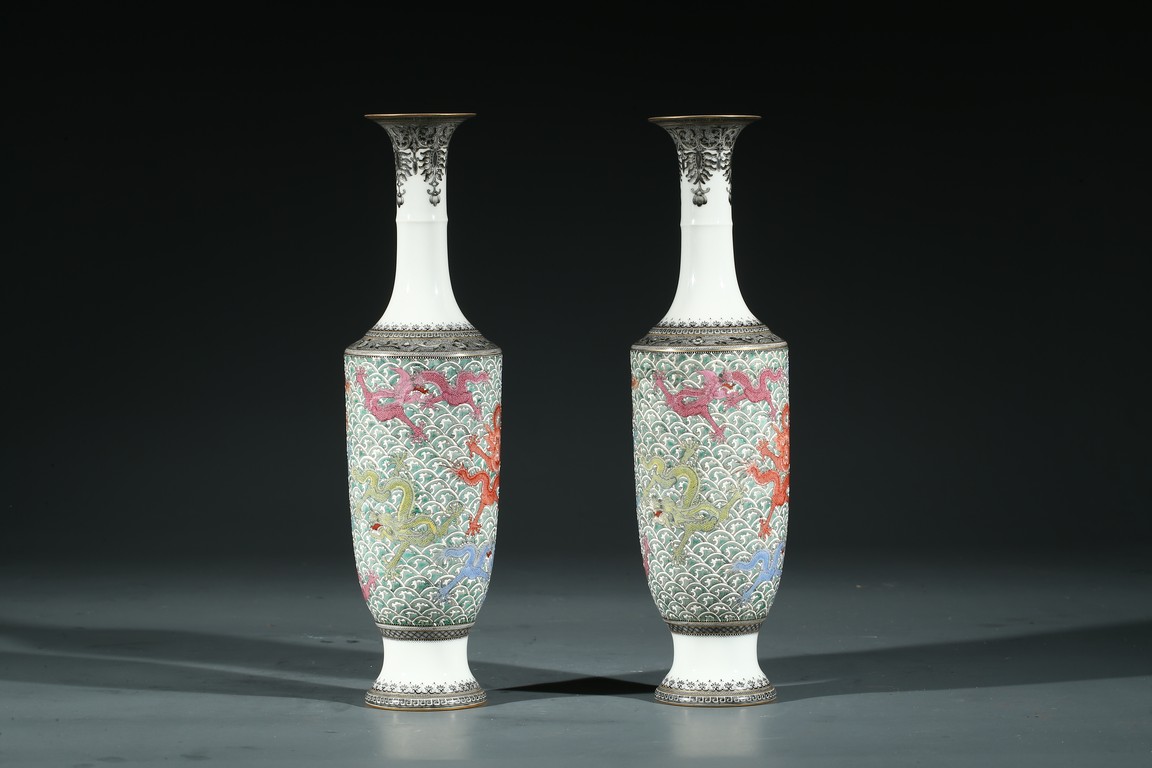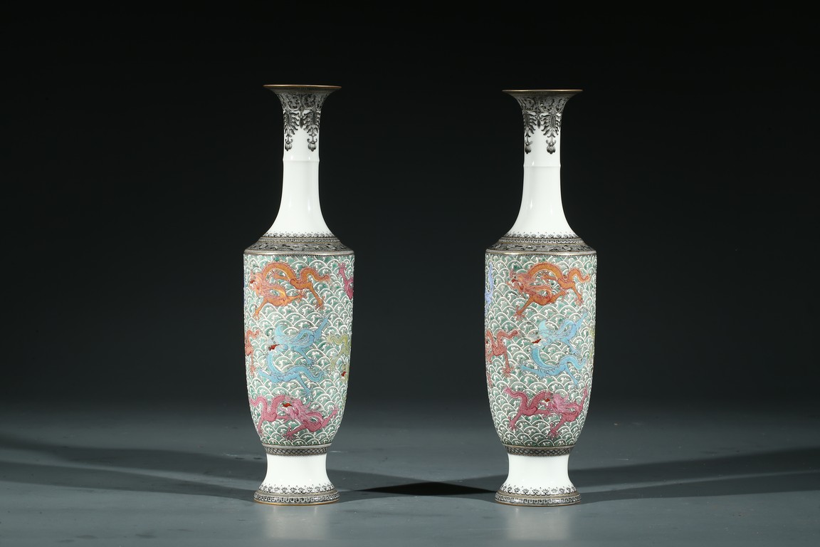 Each vase body vividly painted with five ferocious dragons amidst turbulent waves, rising to a flared rim from a tall slender neck, base with apocryphal four character Qianlong mark.