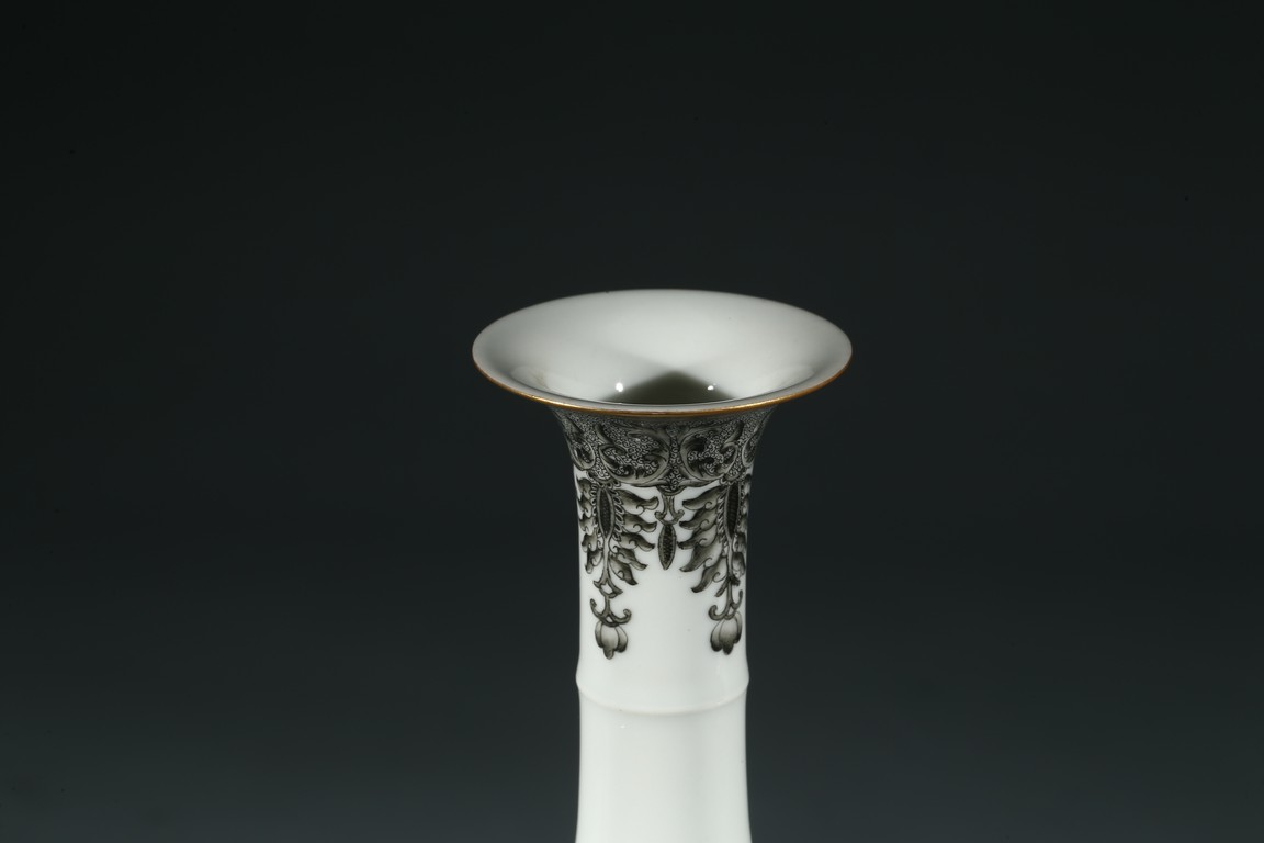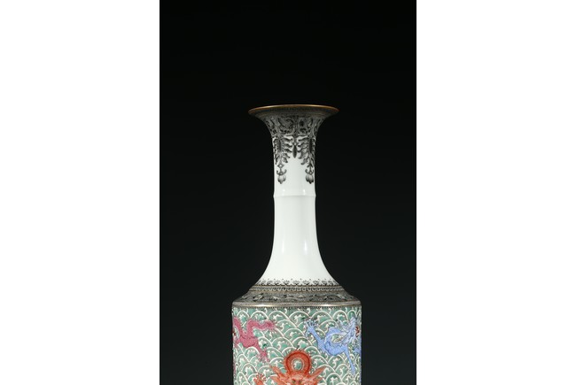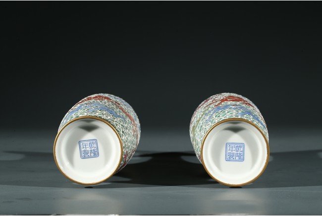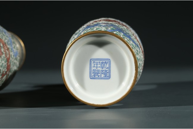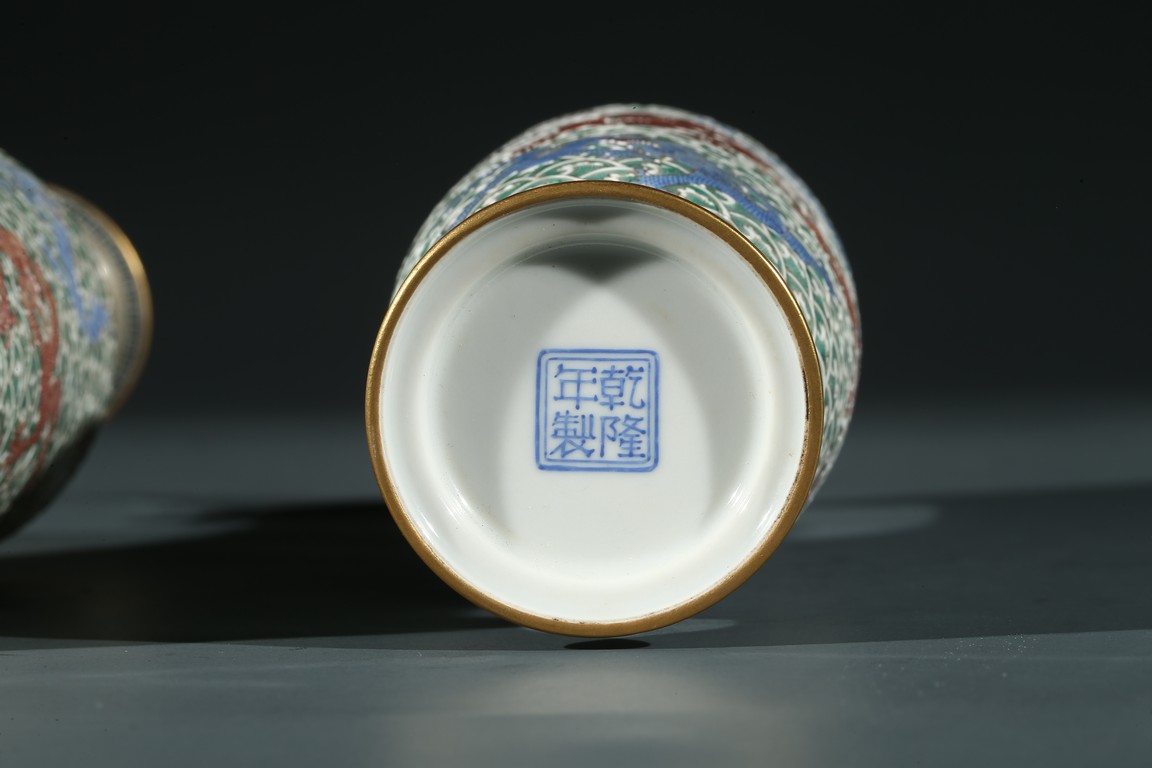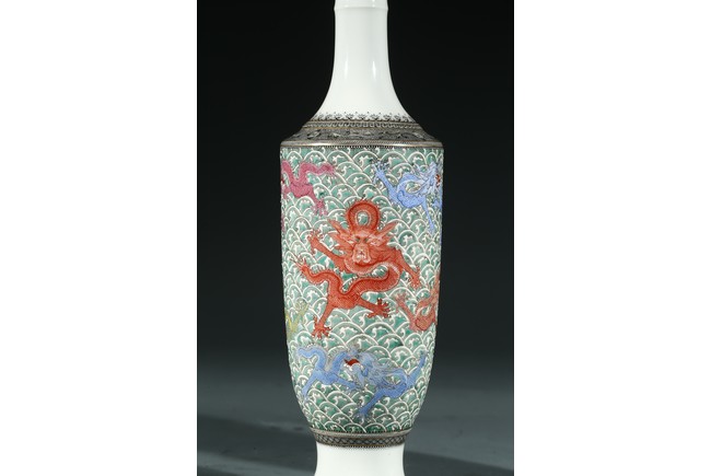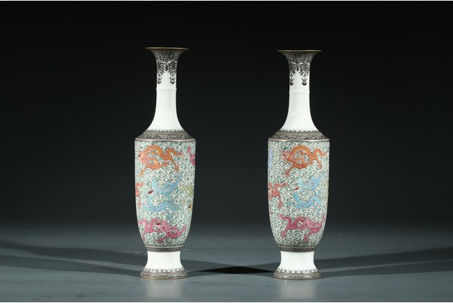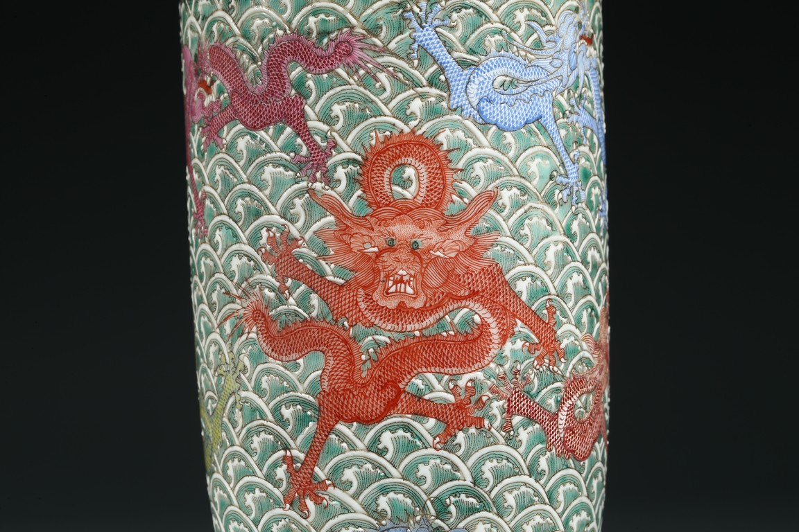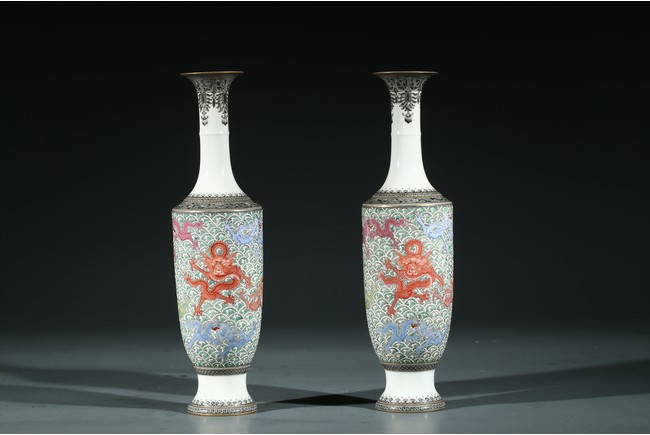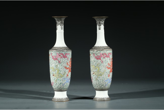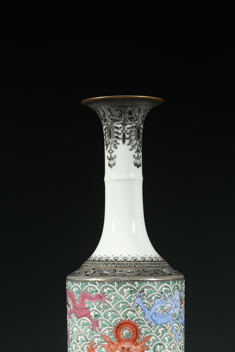 Each vase body vividly painted with five ferocious dragons amidst turbulent waves, rising to a flared rim from a tall slender neck, base with apocryphal four character Qianlong mark.