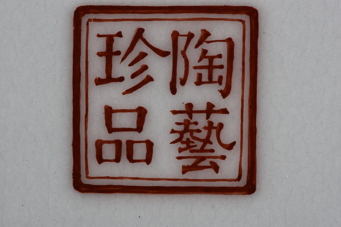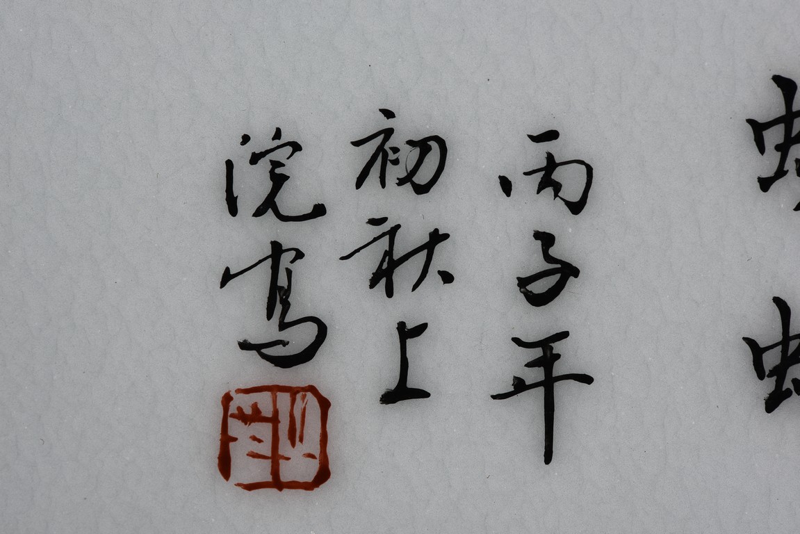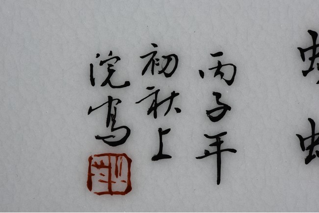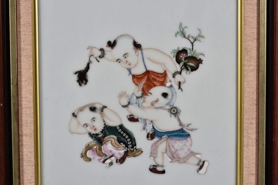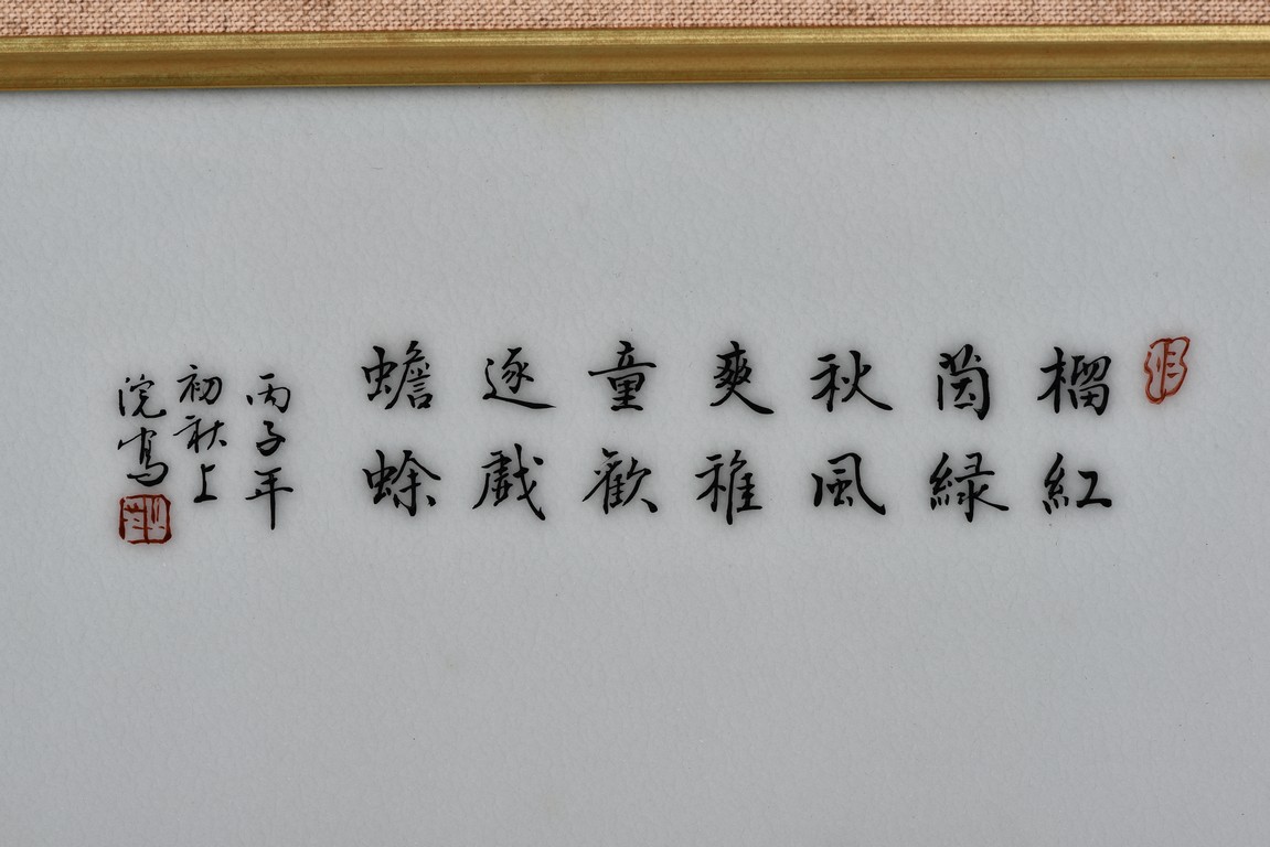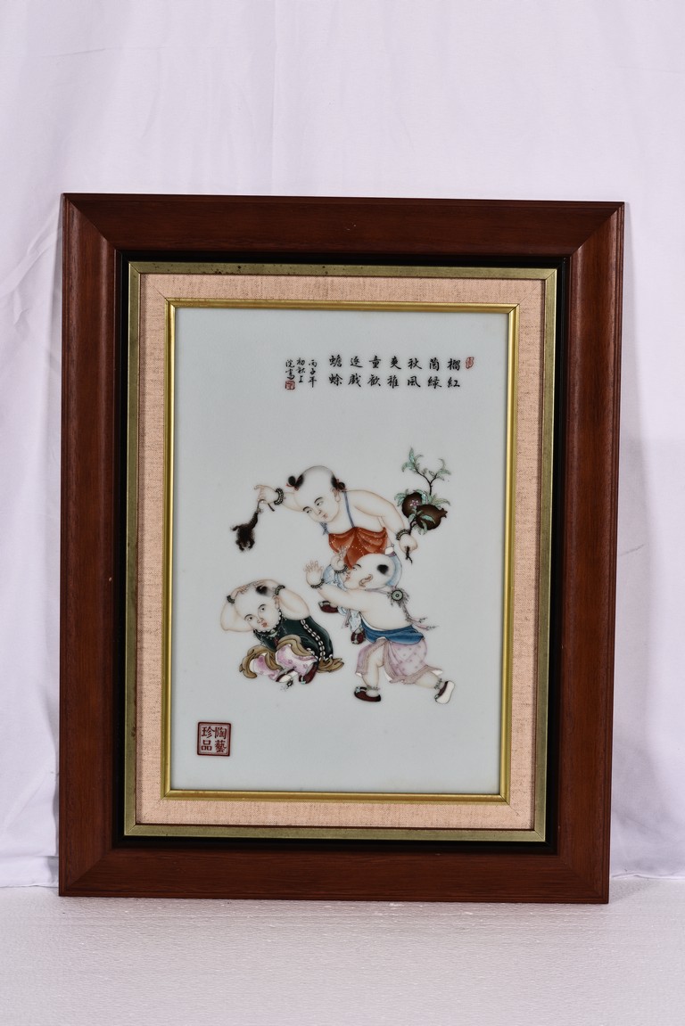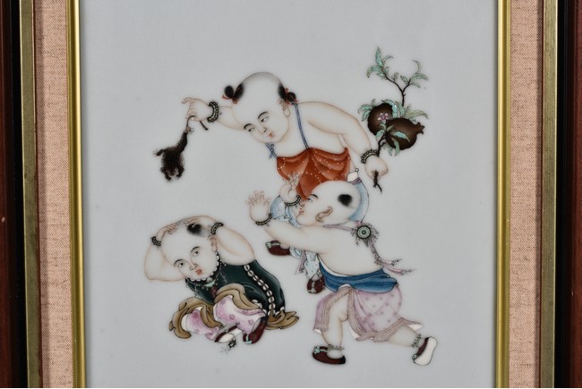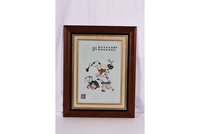 In rectangular shape, with depiction of three boys playing, with inscription, artist signature, and seals.