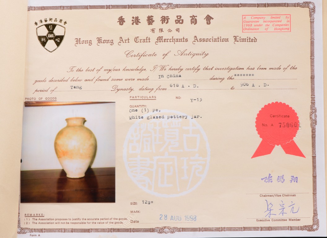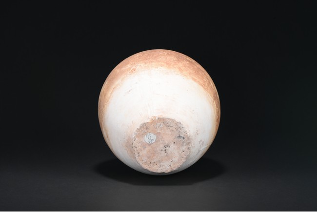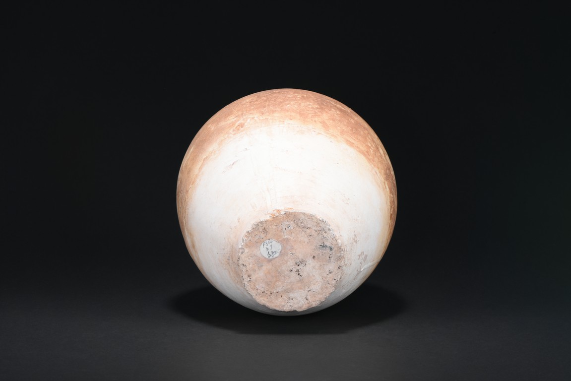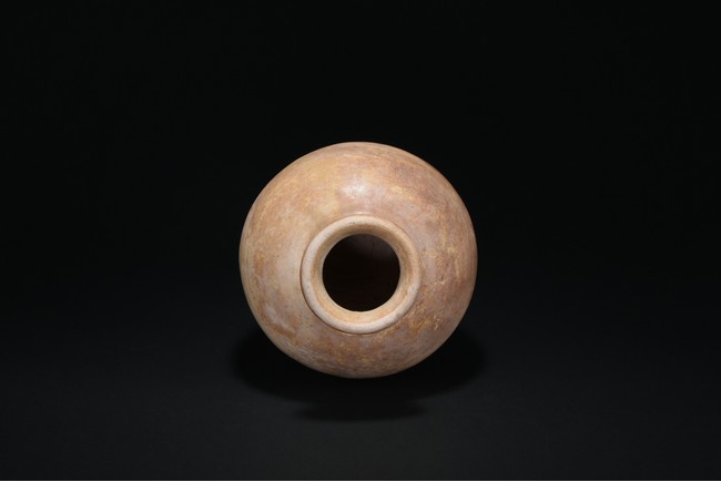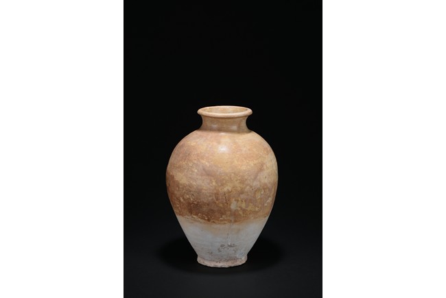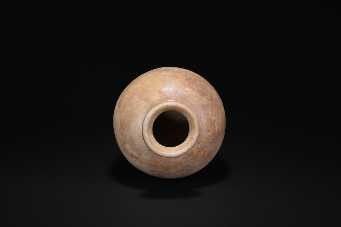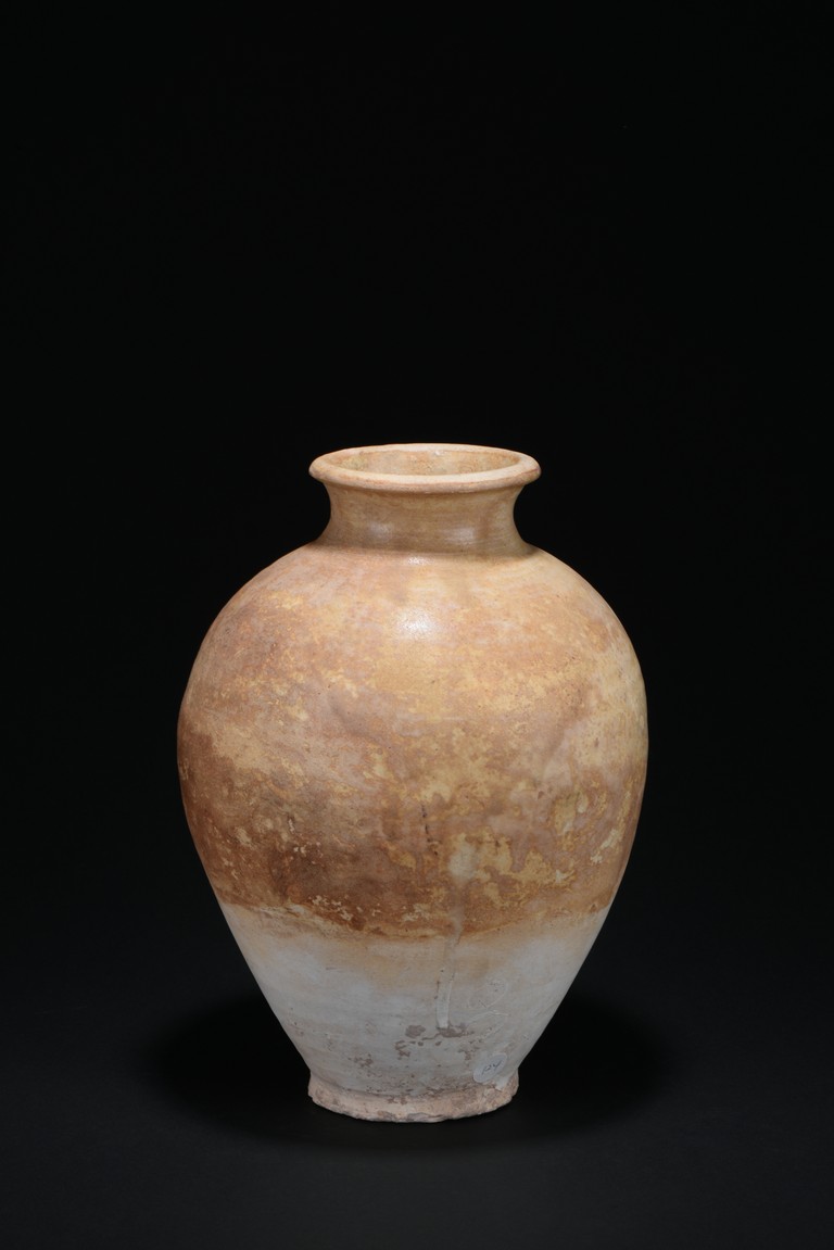 Rising from a short flaring foot, the compressed globular body with high shoulders surmounted by a short waisted neck and a flat everted rim, the brownish body covered in a white glaze tinged with russet tone and suffused with crackles over the white slip, pooling in the recesses and stopping irregularly above the foot.