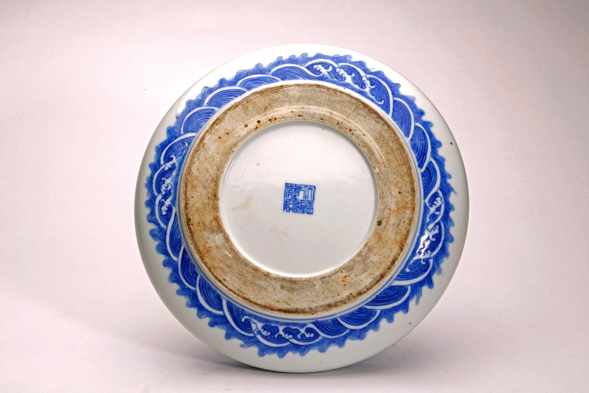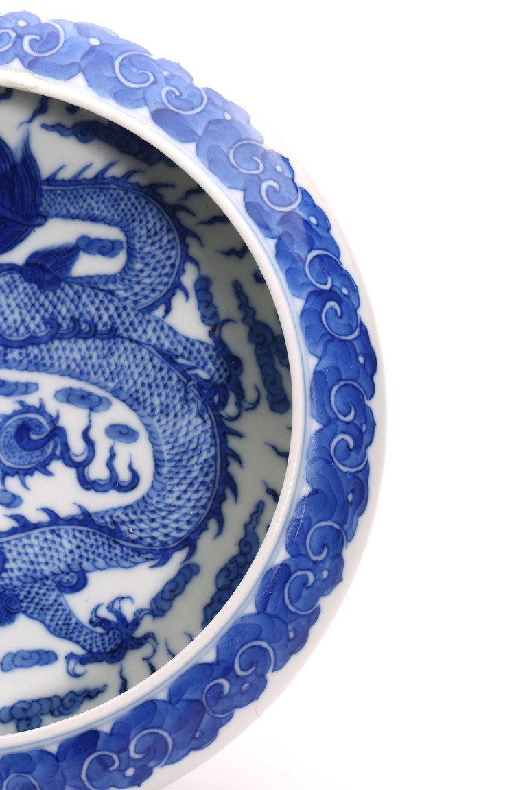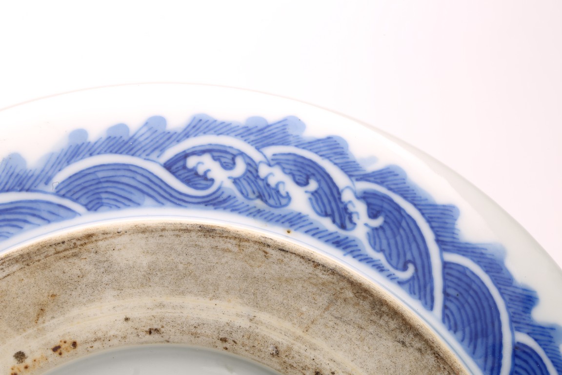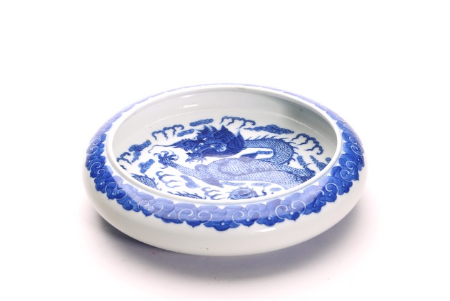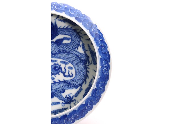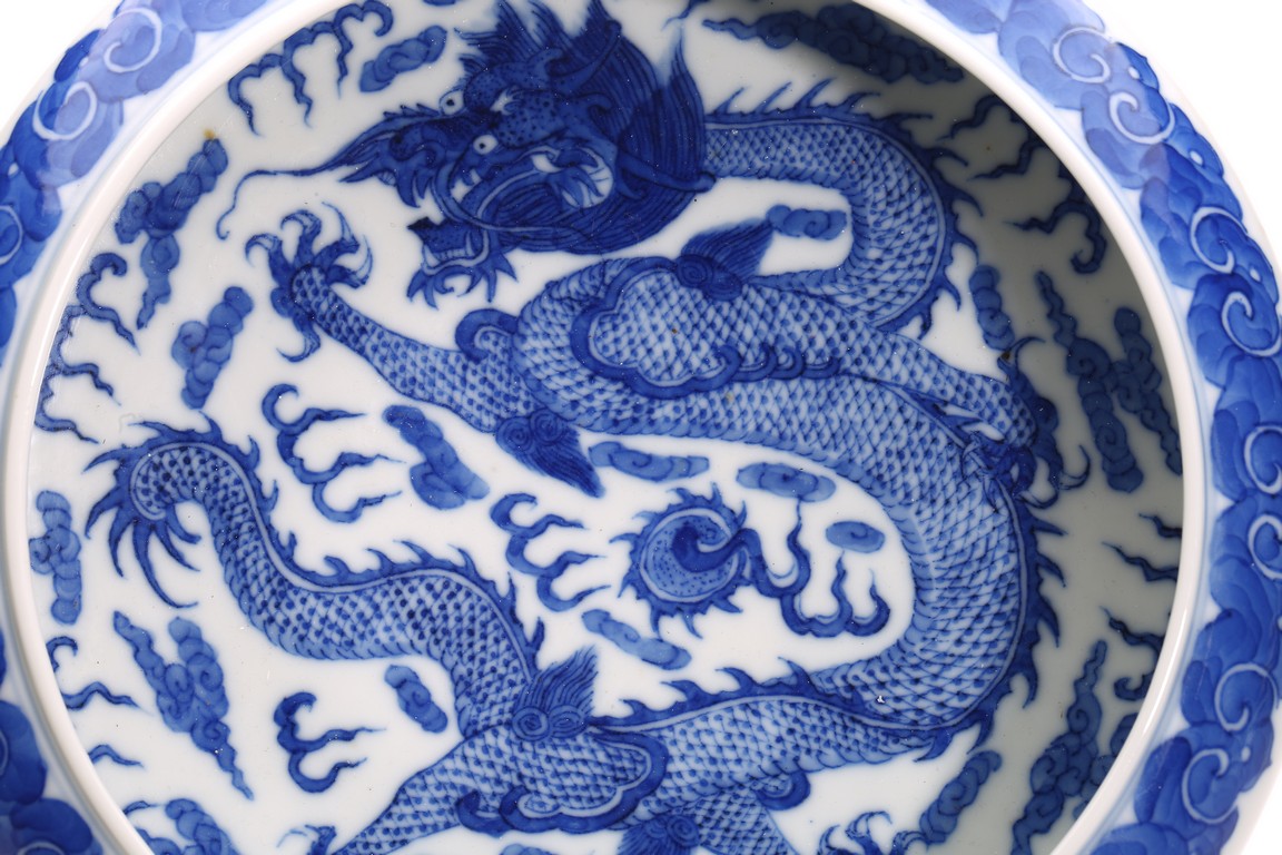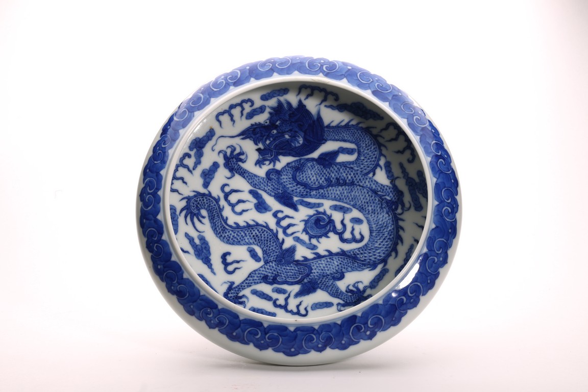此件筆洗敞口、鼓腹、內圈足,外壁一圈青花如意紋飾,底足一圈青花海浪紋飾,簡潔明快,筆洗中心繪青花雲龍紋飾,蒼龍矯健有力,畫工細膩精湛,青花發色青翠,底刻“大清乾隆年制”六字三行款。