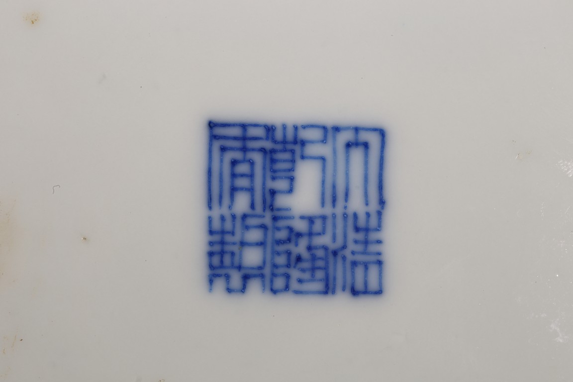 Qing Dynasty period. Of compressed circular form, the incurved mouth rim exterior encircled with a band of ruyi heads, the interior painted with a wrathful flying five-clawed dragon chasing flaming pearl, base inscribed with six character Qianlong mark with unglazed foot ring.