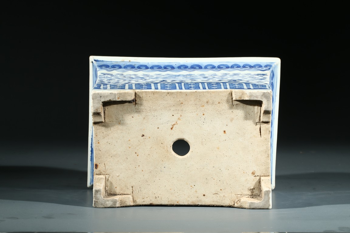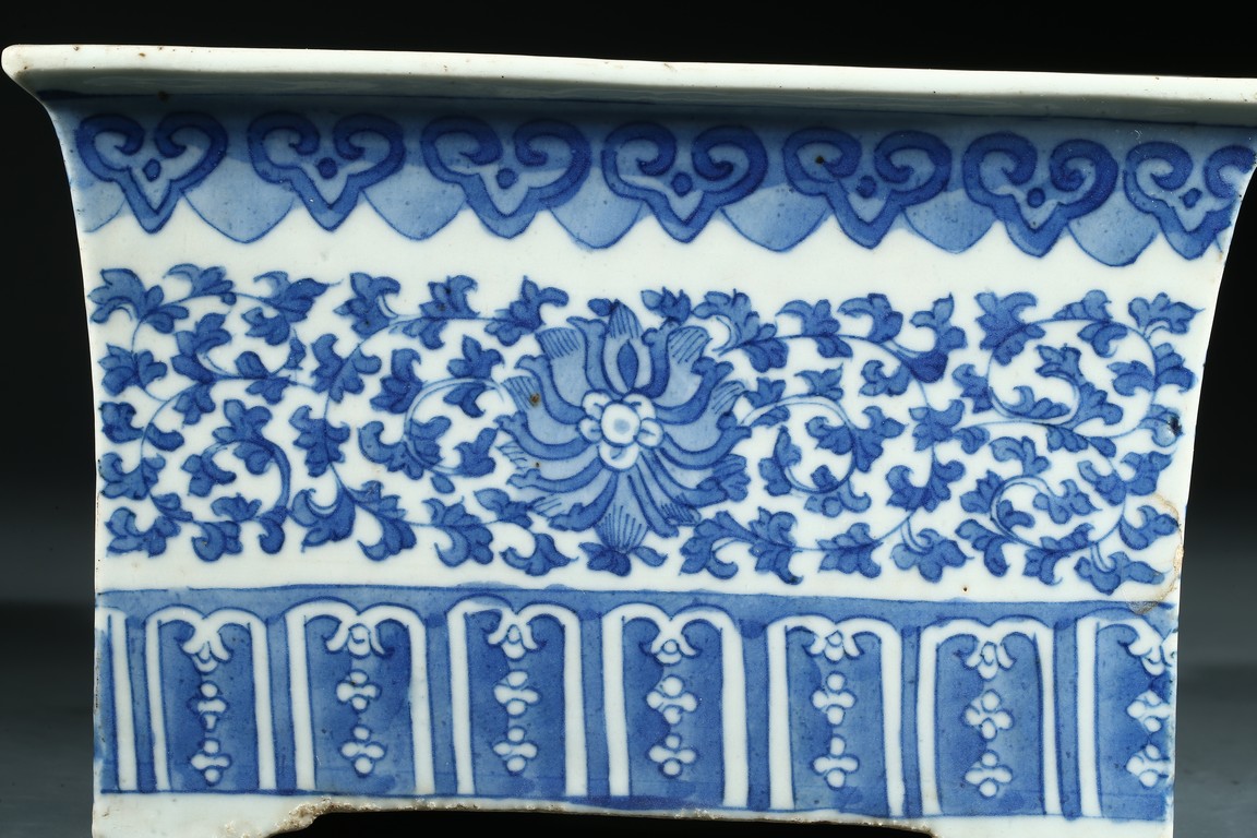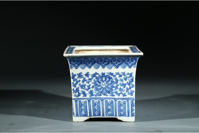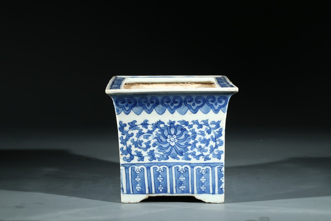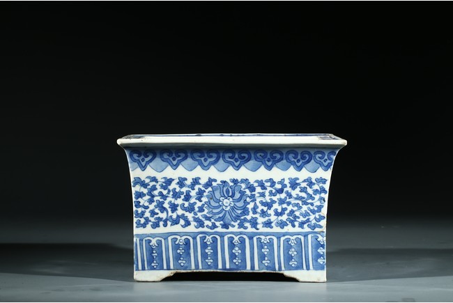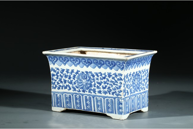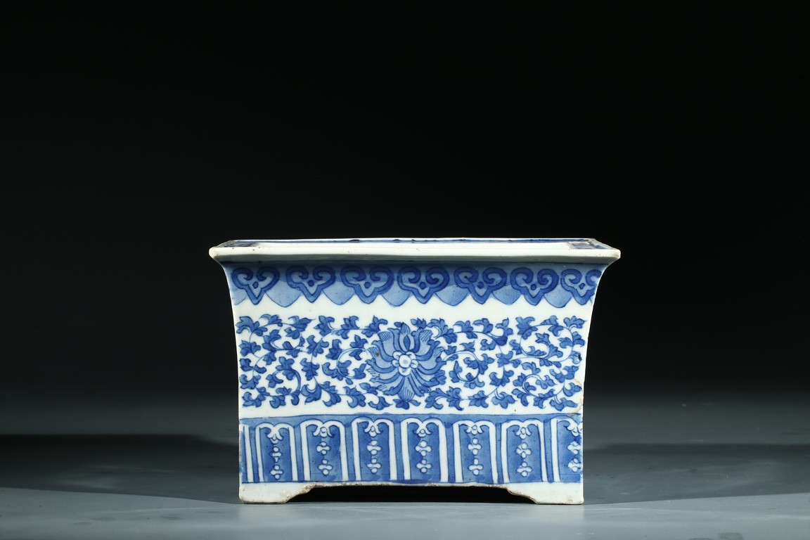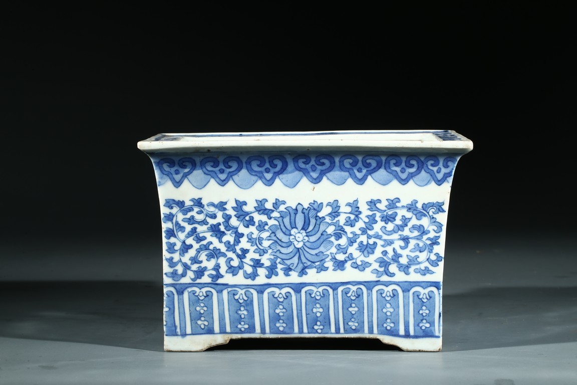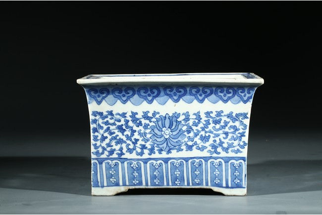 The jardiniere with slightly flaring rim supported on four feet, the body decorated with leafy foliate scrolls, below a ruyi-head border and above a stylized panel of petal motifs.