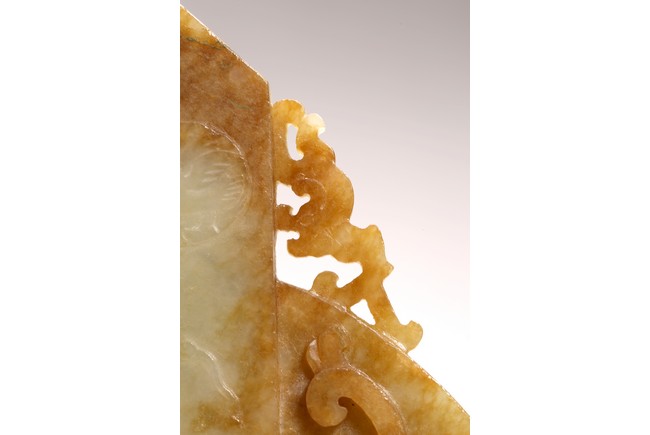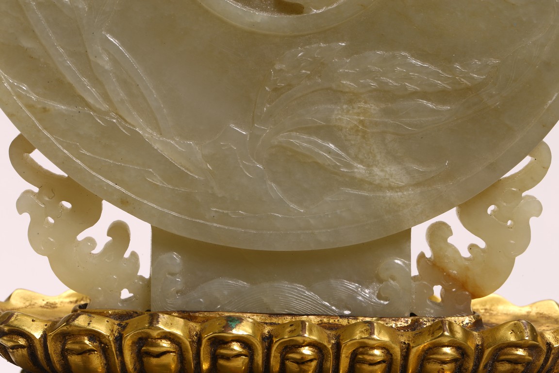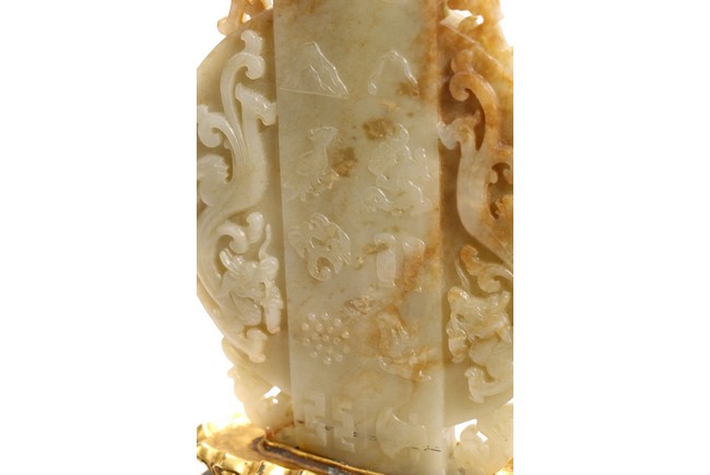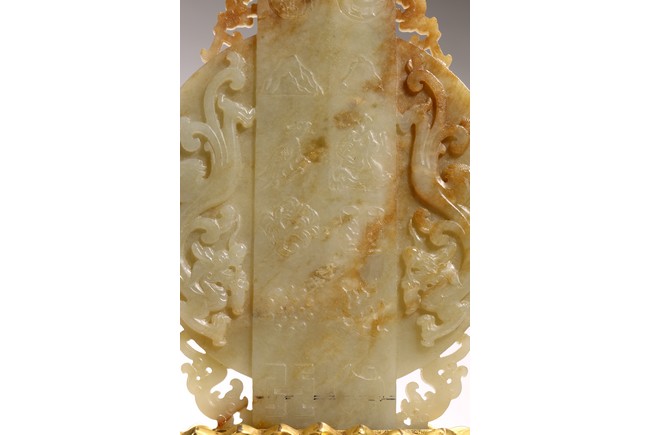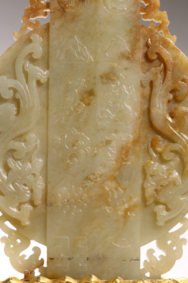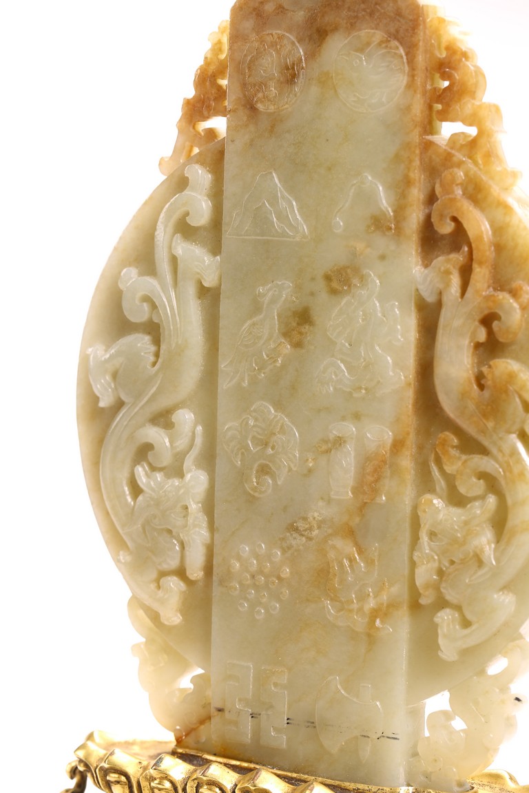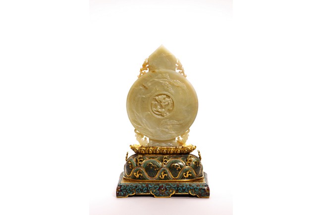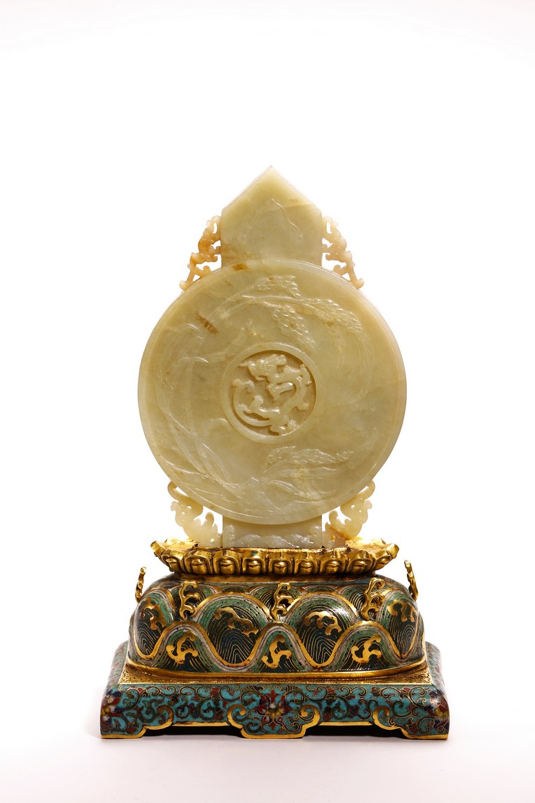 玉圭以浮雕的十二章組合圖案為主紋飾,將日、月、星辰、山龍、華蟲等十二古人之象分兩組對稱排列,此為古代宮廷特有的代表符號和象徵,寓意江山永固,壽與天齊的美好含義。史載,皇帝冕服自舜帝起就服十二章,以後帝王皆承襲古法,歷數千年未變,十二章各有專紋,各有象徵。玉璧一面浮雕雙龍,形神威嚴,面對玉圭所雕十二章;另一面正中圓心內雕一龍,環壁浮雕隨風而動的穀穗,有歲歲平安之美意。下呈銅胎掐絲琺瑯鎏金海水紋底座,保存完整,非常難得。