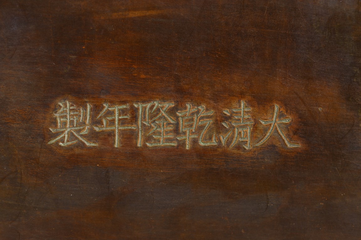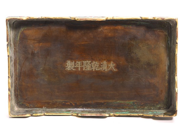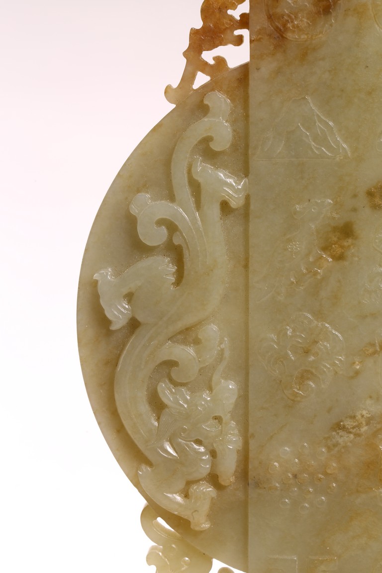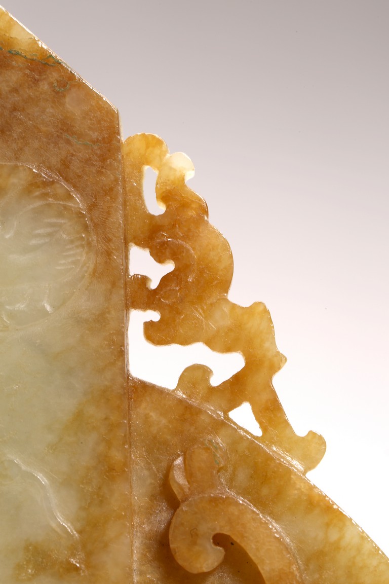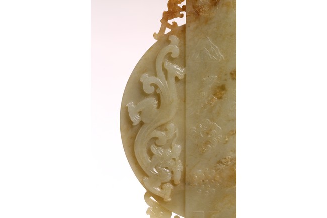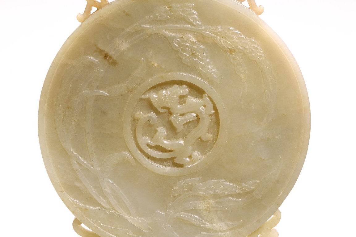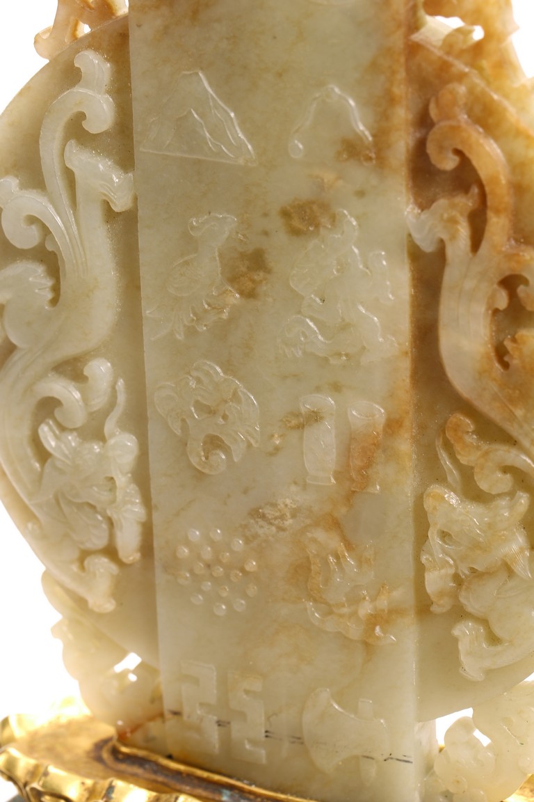 玉圭以浮雕的十二章組合圖案為主紋飾,將日、月、星辰、山龍、華蟲等十二古人之象分兩組對稱排列,此為古代宮廷特有的代表符號和象徵,寓意江山永固,壽與天齊的美好含義。史載,皇帝冕服自舜帝起就服十二章,以後帝王皆承襲古法,歷數千年未變,十二章各有專紋,各有象徵。玉璧一面浮雕雙龍,形神威嚴,面對玉圭所雕十二章;另一面正中圓心內雕一龍,環壁浮雕隨風而動的穀穗,有歲歲平安之美意。下呈銅胎掐絲琺瑯鎏金海水紋底座,保存完整,非常難得。
