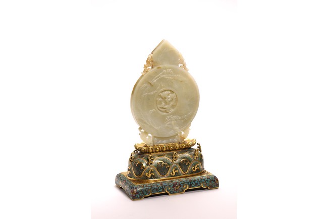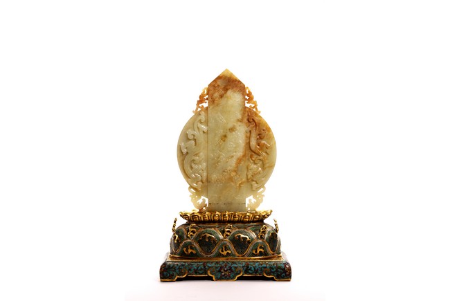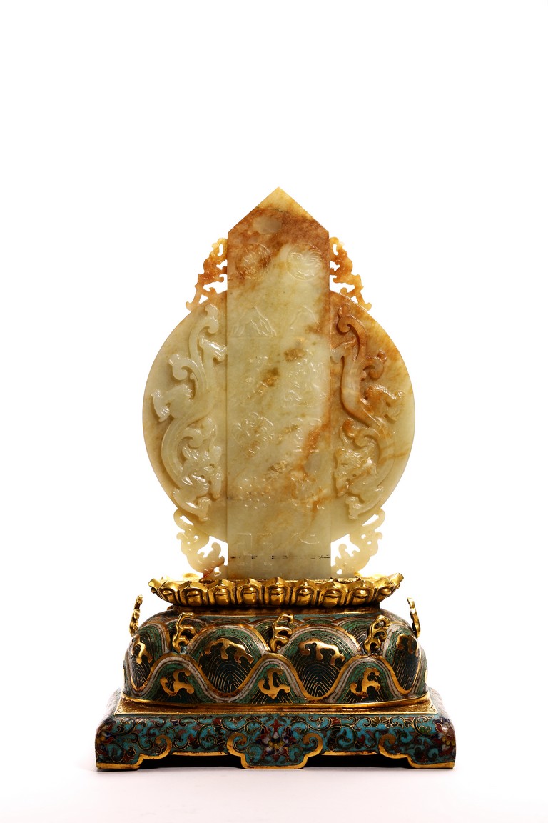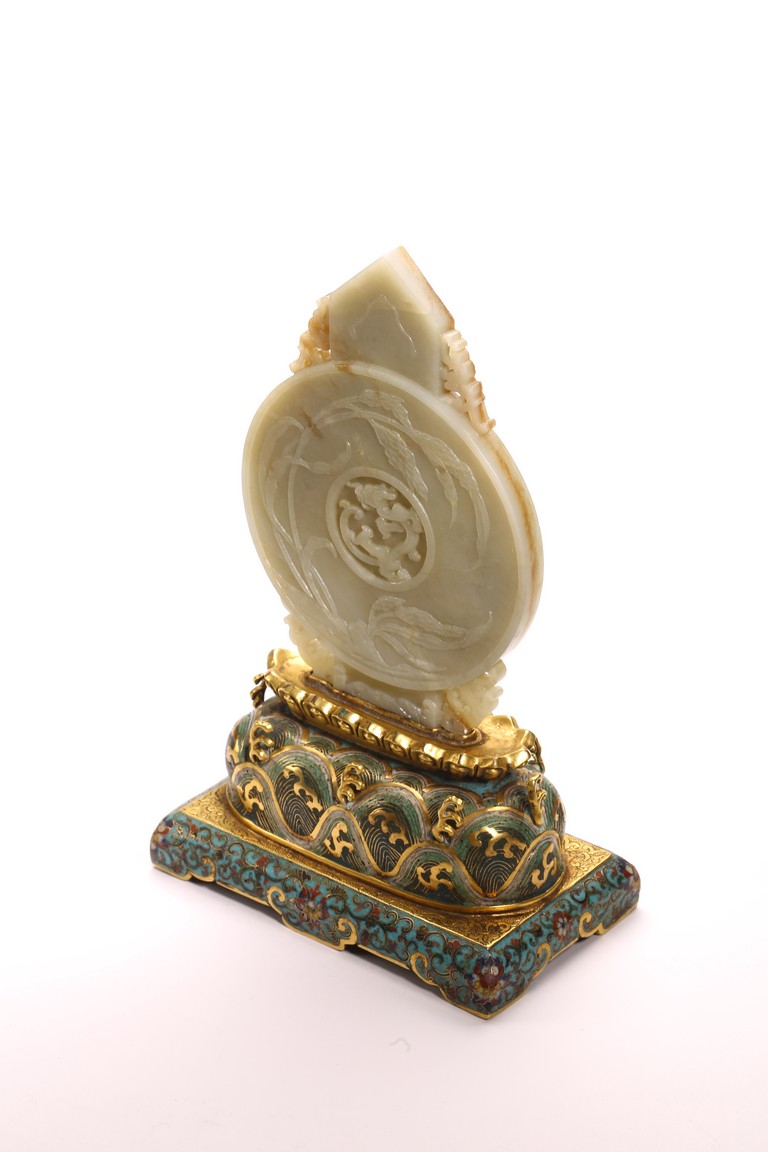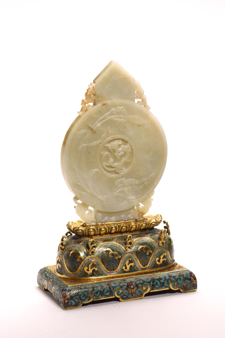 The jade tablet carved in the form of archaistic gui jade with both sides carved in shallow relief with decorations, all supported on cloisonne enamel stand.