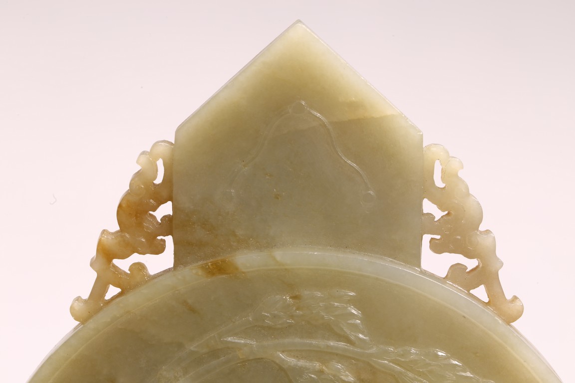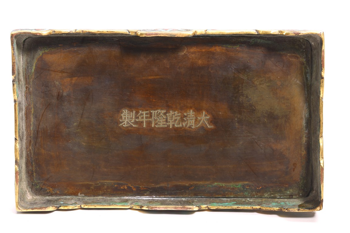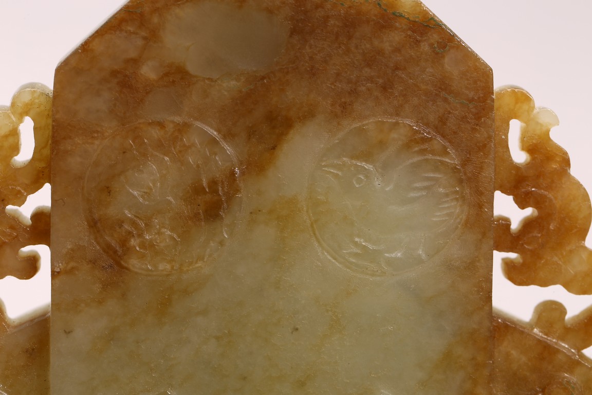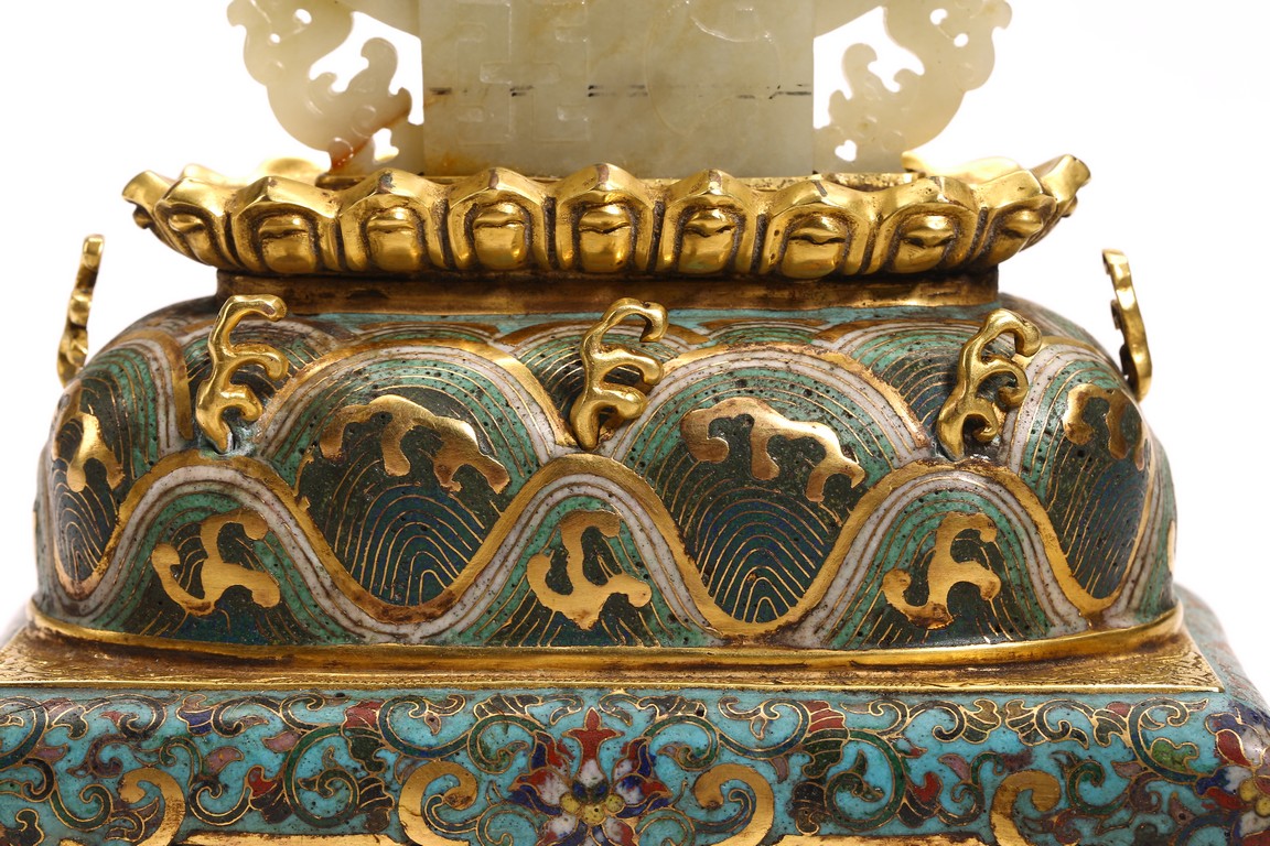 The jade tablet carved in the form of archaistic gui jade with both sides carved in shallow relief with decorations, all supported on cloisonne enamel stand.