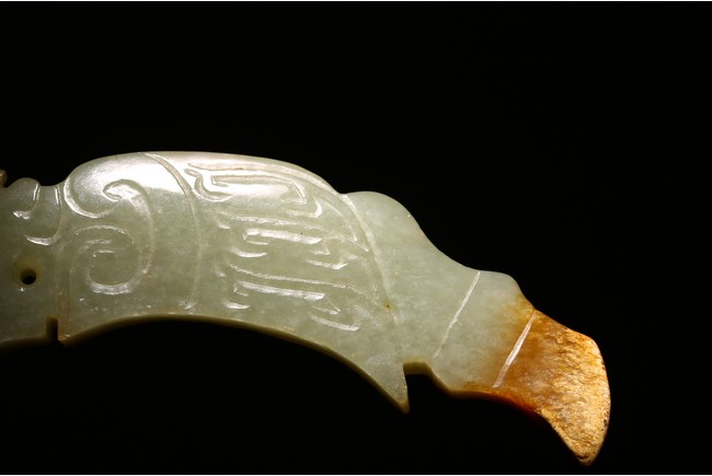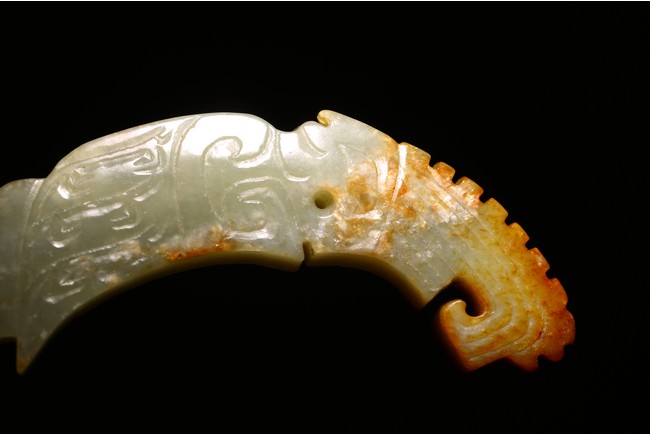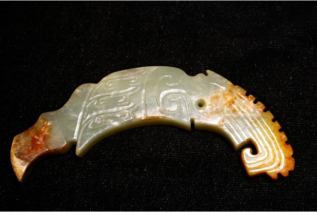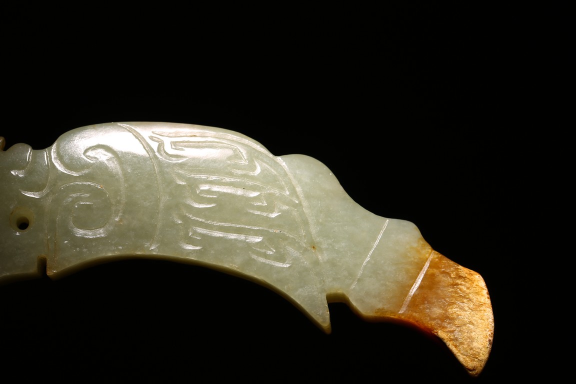 Carved in the form of an archaic style dragon form with stylized wings and head, the center drilled with an aperture.
