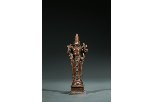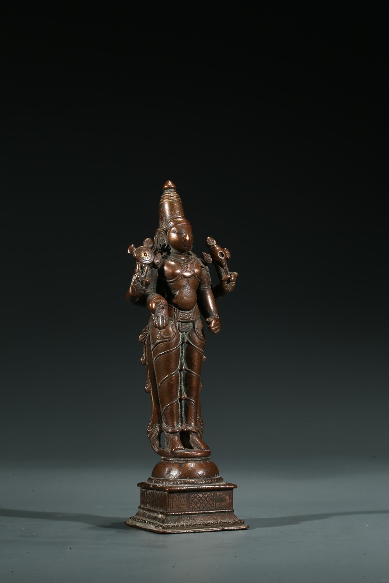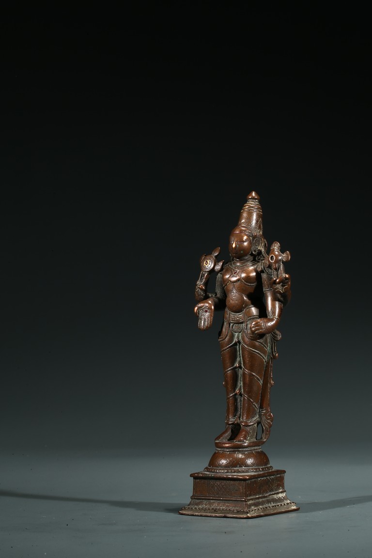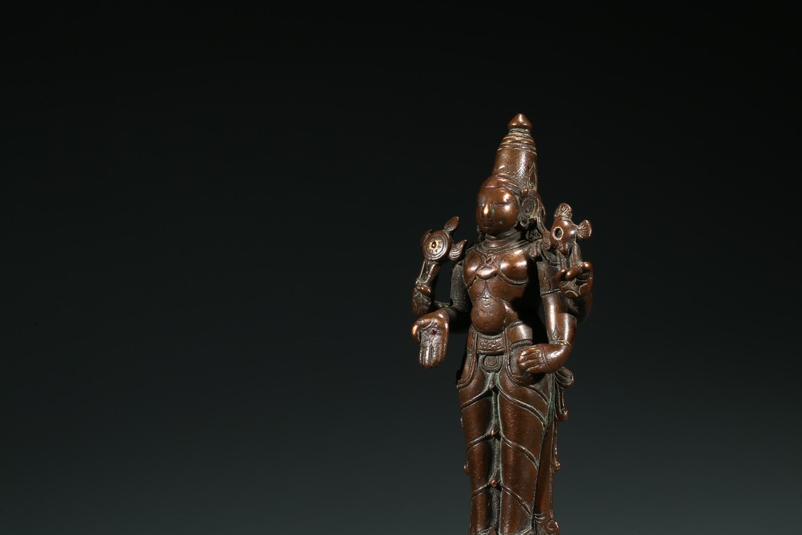 17th century or earlier. Standing above a square plinth, wearing a dhoti with right hand in mutra, overall adorned with various jewelry, the face serene with gentle smile and elongated eyes surmounted by a foliate diadem and conical headdress, the earlobe and hand palm decorated with red gem.